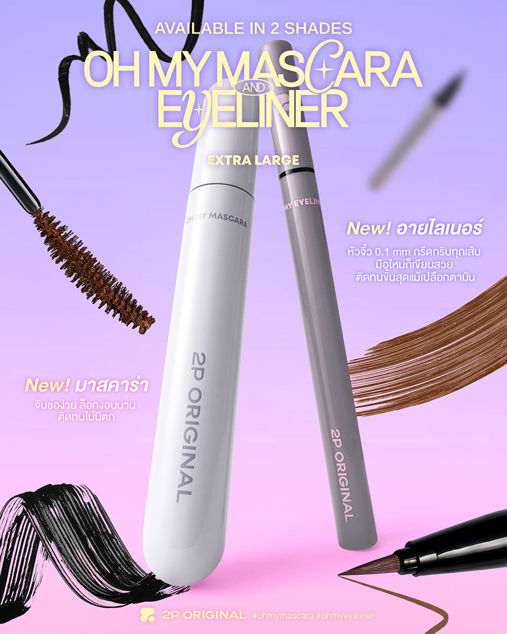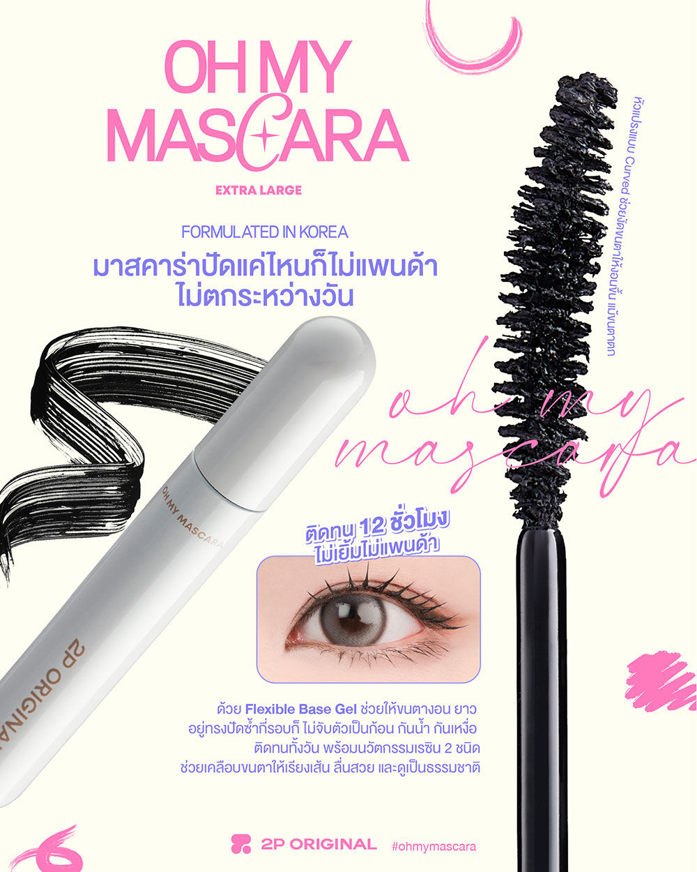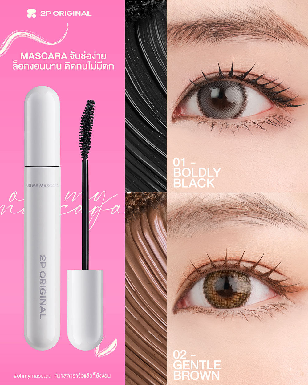 2P Original Oh My Mascara 7g #01 Boldly Black มาสคาร่าสีดำเติมขนตาให้ดูชัด เข้มหนา ไม่เป็นคราบ ติดทน กันน้ำ กันเหงื่อตลอดทั้งวัน ช่วยให้ขนตาดูงอนยาว และโดดเด่น ปัดลื่น เคลือบทุกเส้นขนตา ปัดแค่ไหนก็ไม่แพนด้า และไม่จับตัวเป็นก้อนระหว่างวันด้วยเทคโนโลยี Flexible Base Gel ช่วยให้ขนตาดูยาว และเรียงเส้นอย่างเป็นธรรมชาติและช่วยล็อกความงอนเด้งให้ทนยาวนาน ไม่ไหลเยิ้ม ช่วยให้ดวงตาดูโดดเด่นตลอดทั้งวัน