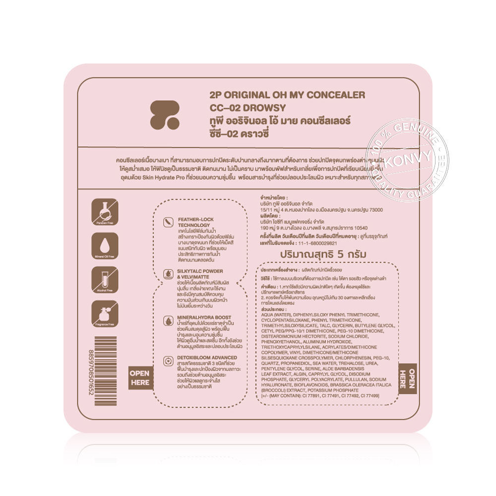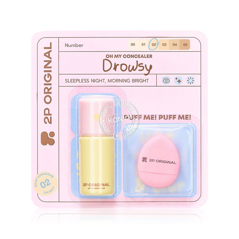 2P Original Oh My Concealer 5g #02 Drowsy คอนซีลเลอร์เนื้อบางเบา แต่ปกปิดตั้งแต่ระดับ Medium ถึง Full Coverage ช่วยปกปิดรอยคล้ำใต้ตา รอยสิว และรอยจุดด่างดำได้อย่างเรียบเนียน ด้วย Feather-Lock Technology ที่แนบสนิทไปกับผิวโดยไม่รู้สึกหนาหนัก พร้อมล็อกเม็ดสีให้อยู่กับที่ไม่หลุด ไม่ตกร่อง เนื้อคอนซีลเลอร์จึงติดทนนานตลอดวัน ให้ผิวดูเนียน คุมมัน เบลอผิว ส่วนผสมพิเศษ Silk Talc Powder และ Velvimate ที่ช่วยควบคุมความมันส่วนเกิน พร้อมให้สัมผัสเนียนละมุน เกลี่ยง่าย ไม่เป็นคราบ อีกทั้งยังสร้าง Blur Effect ช่วยเบลอริ้วรอย รูขุมขน และความไม่สมบูรณ์เล็กๆ น้อยๆ บนผิว ให้ผลลัพธ์ที่แมทพอดี ดูละมุนเป็นธรรมชาติ แต่ไม่ดรอประหว่างวัน บำรุงล้ำลึก เติมความชุ่มชื้น ไม่ใช่แค่ปกปิดแต่ยังดูแลผิวจากภายในสู่ภายนอก มาพร้อมพัฟสำหรับเกลี่ยเพื่อการปกปิดที่เรียบเนียนยิ่งขึ้น