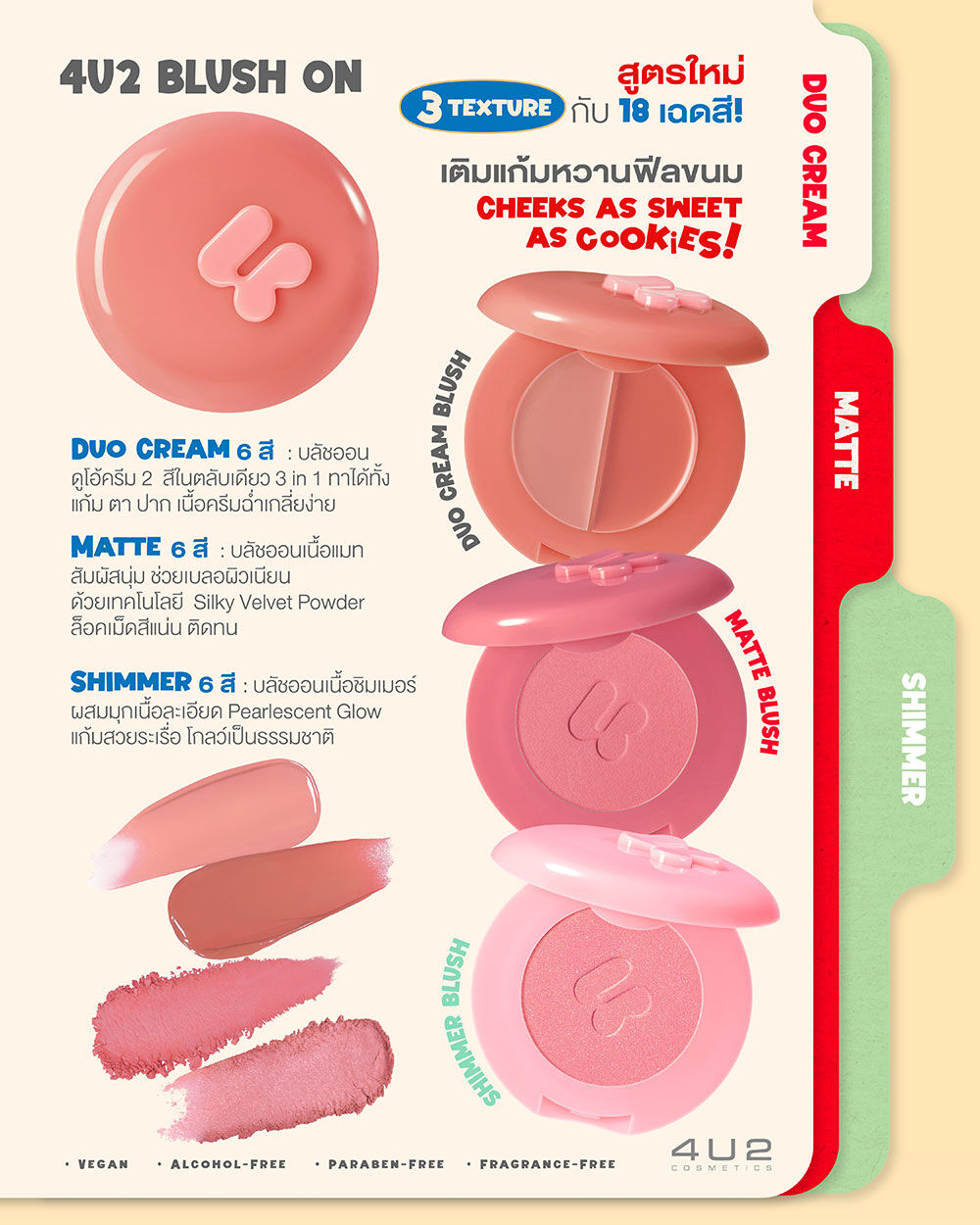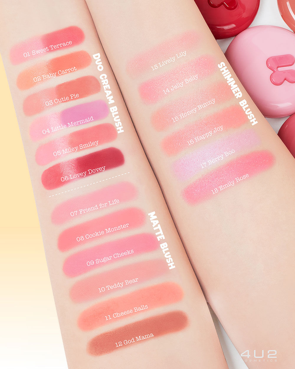 4U2 Matte Blush 3.2g #10 Teddy Bear บลัชออนเนื้อแมทนุ่มละมุน เม็ดสีแน่นชัด เกลี่ยง่ายเนียนไปกับผิว ไม่เป็นคราบ ติดทนตลอดวัน ด้วยเทคโนโลยี Silky Velvet Powder ที่ช่วยเบลอผิวให้เรียบเนียน มอบฟินิชลุคแมทสวย ดูเป็นธรรมชาติ เข้ากับทุกลุคทุกสไตล์