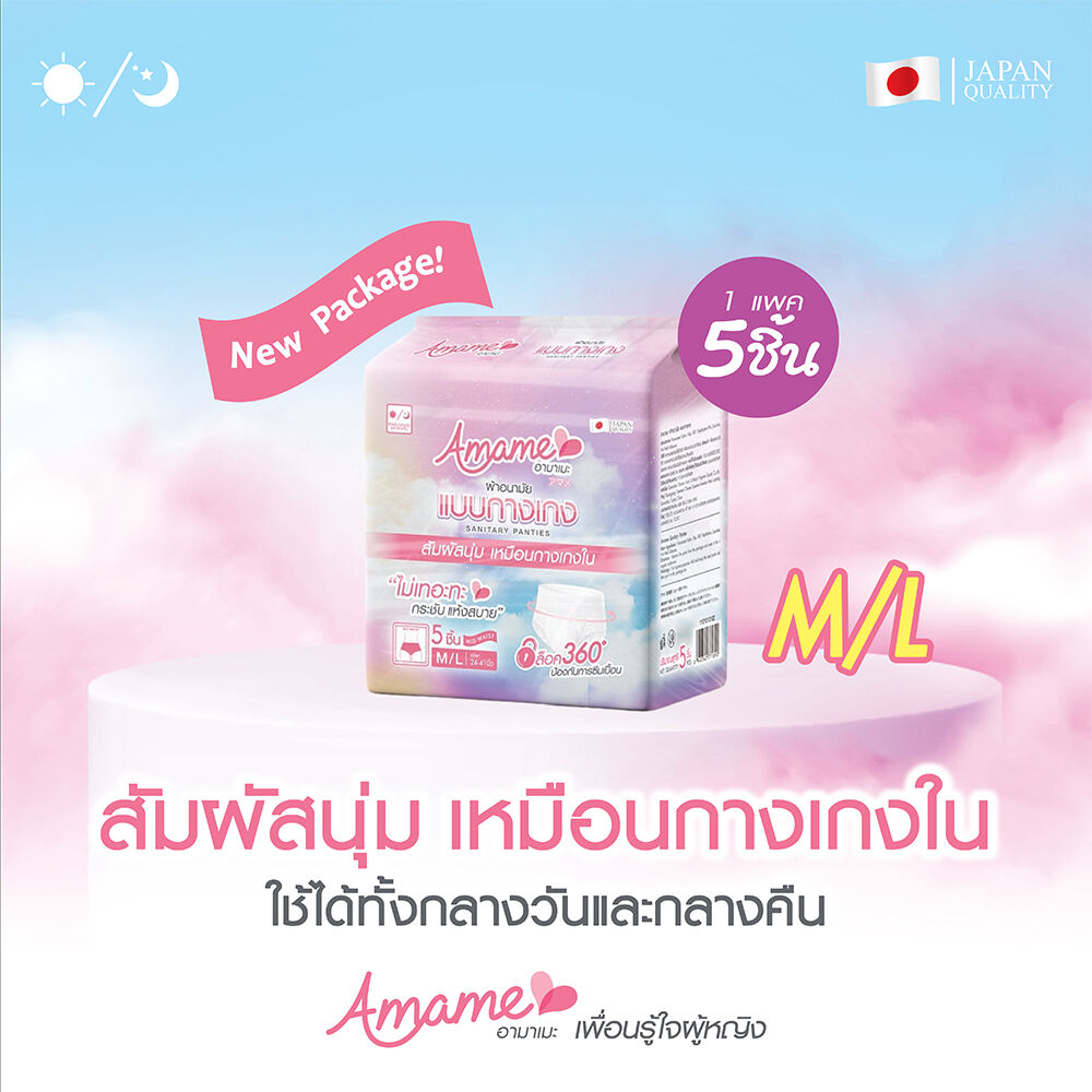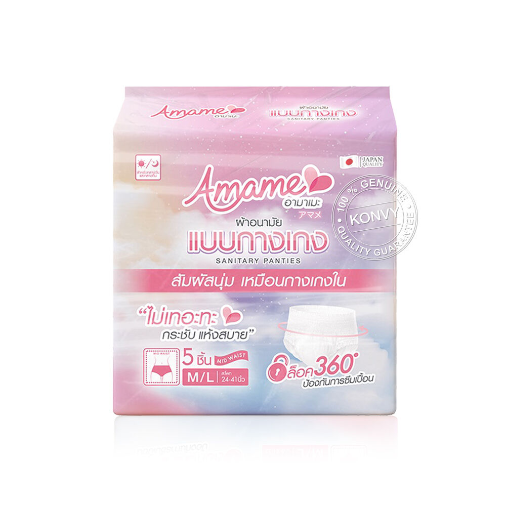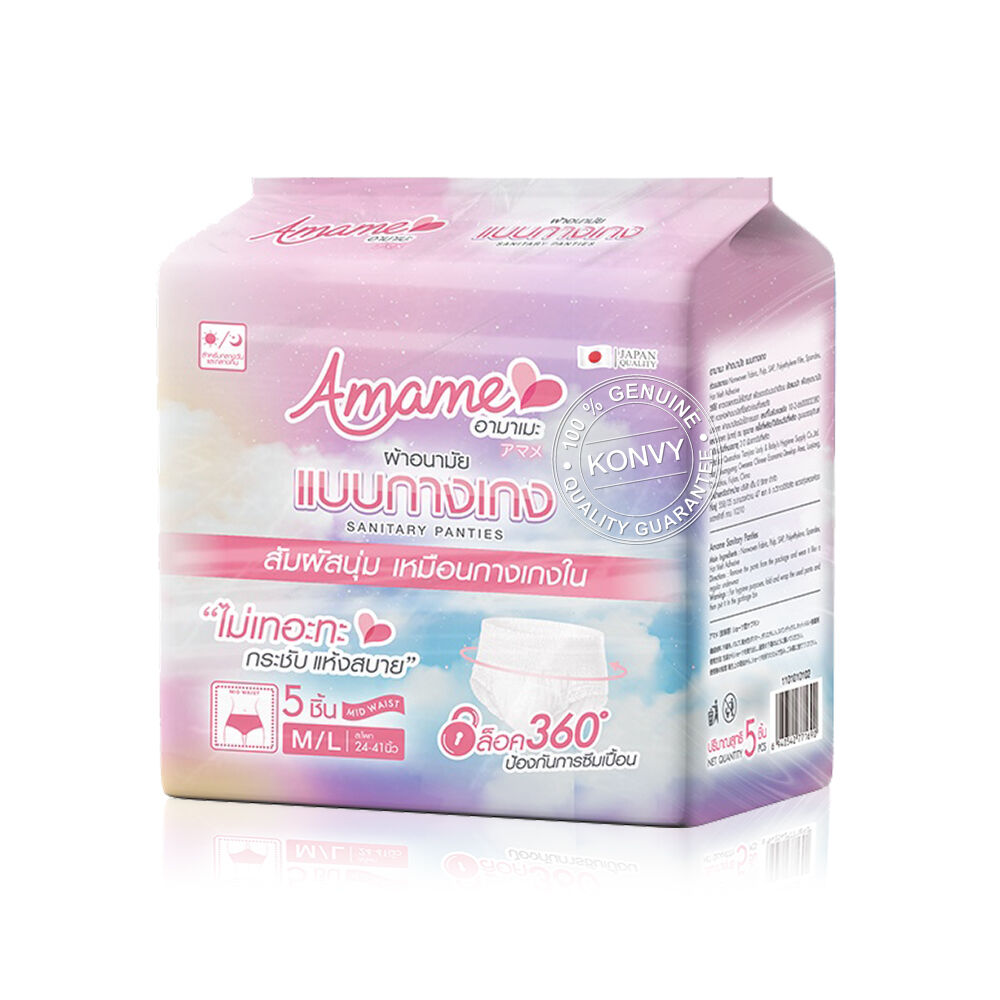 Amame ผ้าอนามัยแบบกางเกง Sanitary Pant Mid Waist Size M/L 5pcs ผ้าอนามัยแบบกางเกง ไซส์ M/L เกรดพรีเมี่ยม Japan Quality สัมผัสนุ่ม ด้วย Cotton จาก USA ไม่บาดผิว ให้ความรู้สึกแห้งสบาย ด้วยสารดูดซับนำเข้าจากญี่ปุ่น ประกอบกับดีไซน์ตัดเย็บอีลาสติกแบบถี่ ทำให้ขอบเอวนุ่ม กระชับ ไม่อึดอัด ไม่เทอะทะ