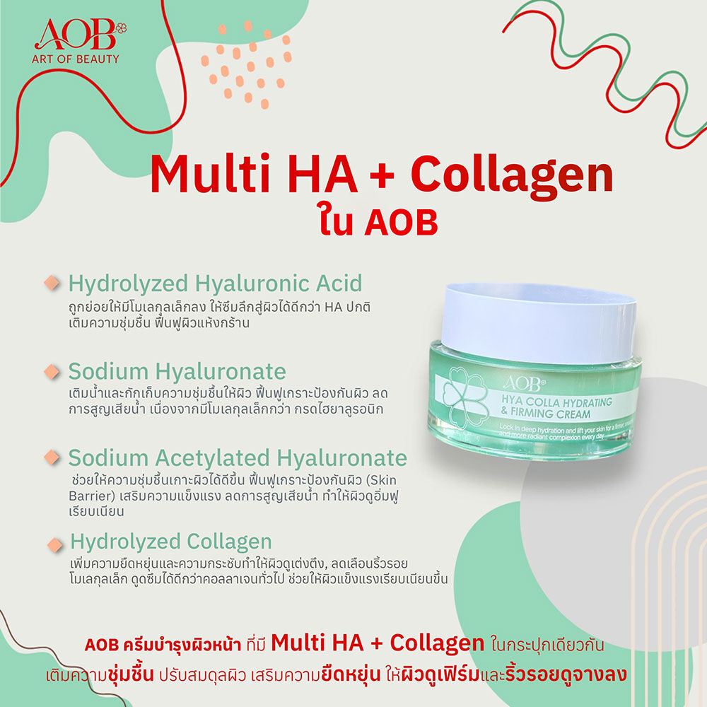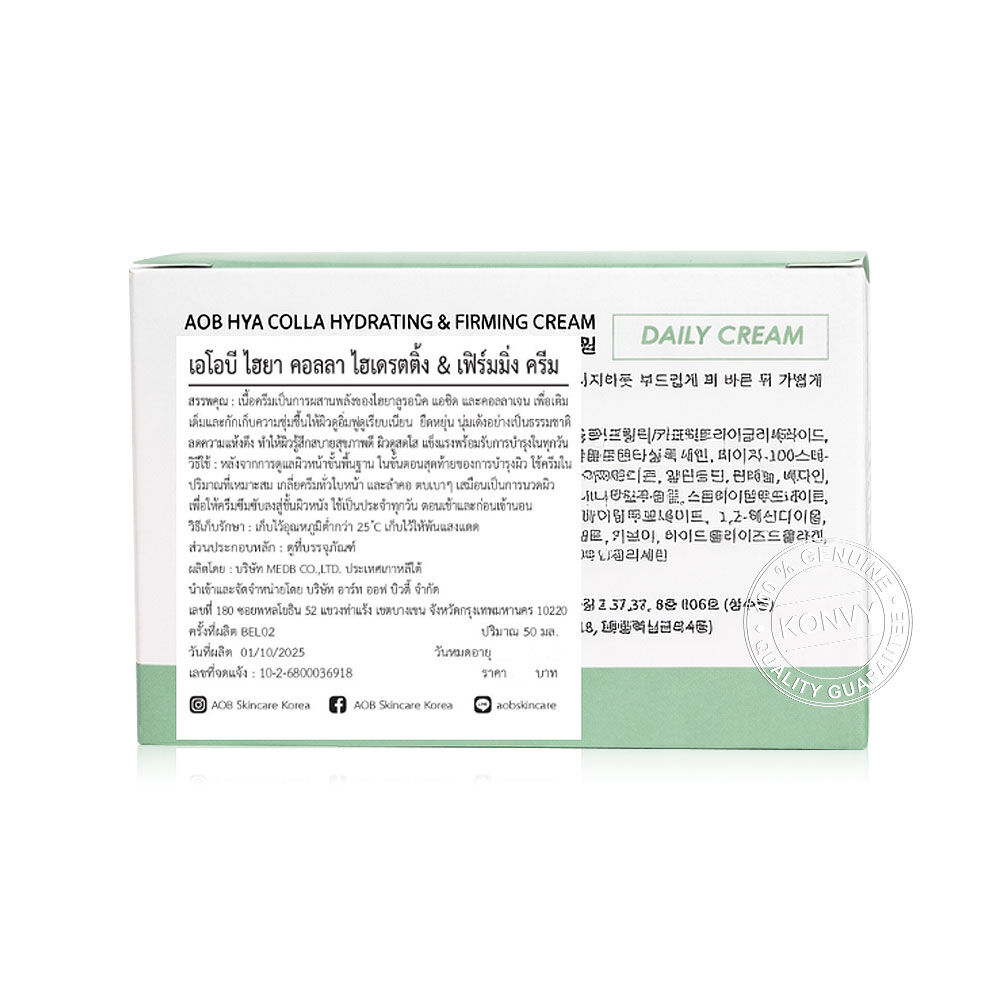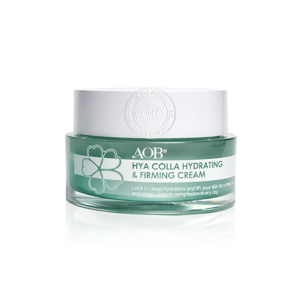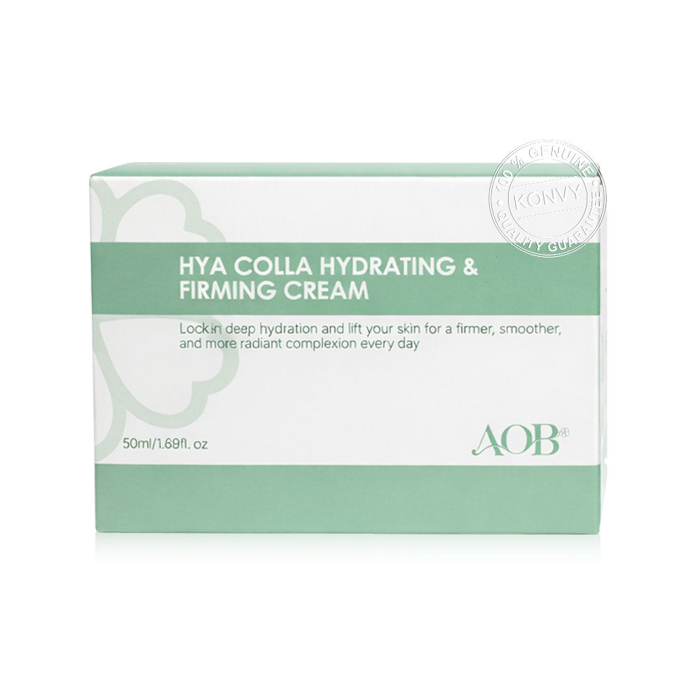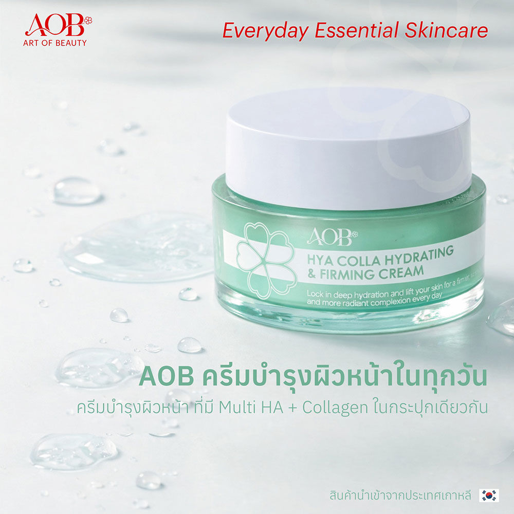 AOB Hya Colla Hydrating & Firming Cream 50ml ครีมบำรุงผิวหน้าที่ผสานพลังของไฮยาลูรอนิค แอซิด และคอลลาเจน เพื่อเติมเต็มและกักเก็บความชุ่มชื้นให้ผิวดูอิ่มฟูดูเรียบเนียน ยืดหยุ่น นุ่มเด้งอย่างเป็นธรรมชาติ ลดความแห้งตึง ทำให้ผิวรู้สึกสบายสุขภาพดี ผิวดูสดใส แข็งแรงพร้อมรับการบำรุงในทุกวัน