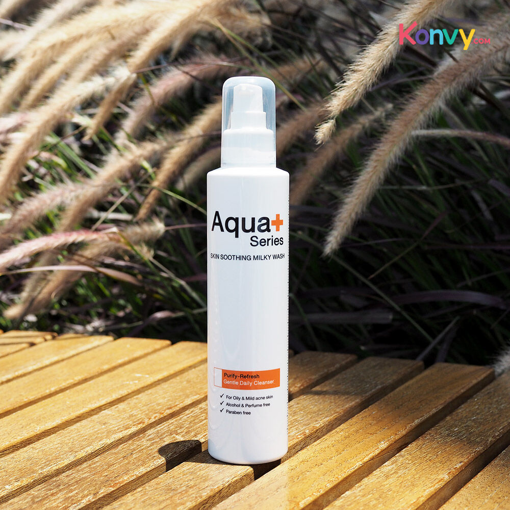 Aqua+ Series Skin Soothing Milky Wash 175ml โฟมน้ำนมทำความสะอาดผิวสูตรอ่อนโยน ช่วยทำความสะอาดความมันส่วนเกินและคราบเครื่องสำอาง พร้อมปกป้องผิวจากแบคทีเรียที่ก่อให้เกิดสิว โดยไม่ทำลายความชุ่มชื้นให้ผิวไม่รู้สึกแห้งตึง