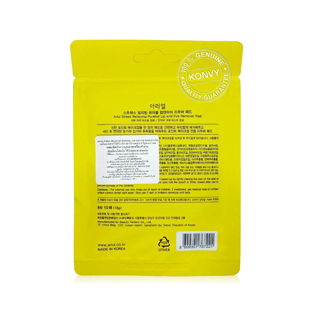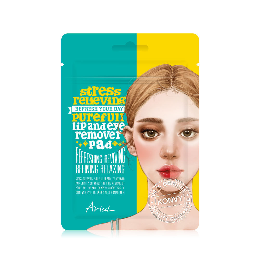 ARIUL Stress Relieving Purefull Lip And Eye Remover Pad 10 Pads แผ่นเช็ดทำความสะอาดผิวหน้า ช่วยทำความสะอาดเครื่องสำอางบริเวณรอบดวงตาและริมฝีปากที่ออกแบบมาเพื่อความสะดวกและประสิทธิภาพสูง เหมาะสำหรับการพกพาและการใช้งานระหว่างเดินทาง มีส่วนผสมของน้ำมันจากเมล็ดแอปริคอต โจโจบา และมะกอก ที่ช่วยให้ความชุ่มชื้นและบำรุงผิว