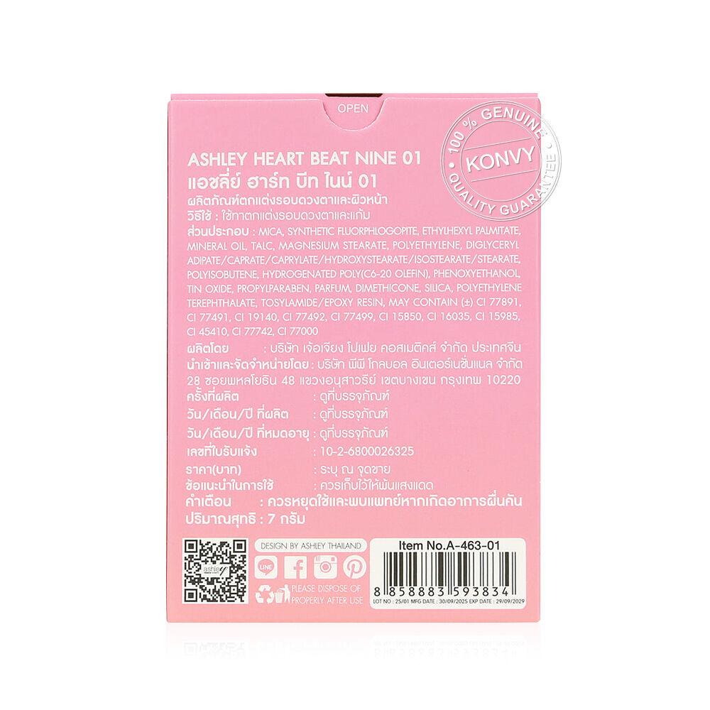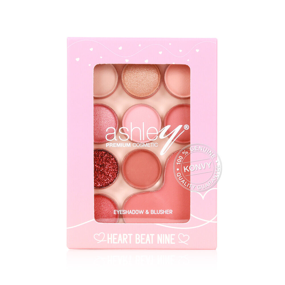 Ashley Heart Beat Nine 7g #01 พาเลทอายแชโดว์และบลัชออน รวม 10 เฉดสี มีทั้งเนื้อแมท ชิมเมอร์ และกลิตเตอร์ สวยครบทุกลุค เนื้อเนียนละเอียด เกลี่ยง่าย พิกเมนต์แน่น ติดทนนาน ไม่หลุดระหว่างวัน