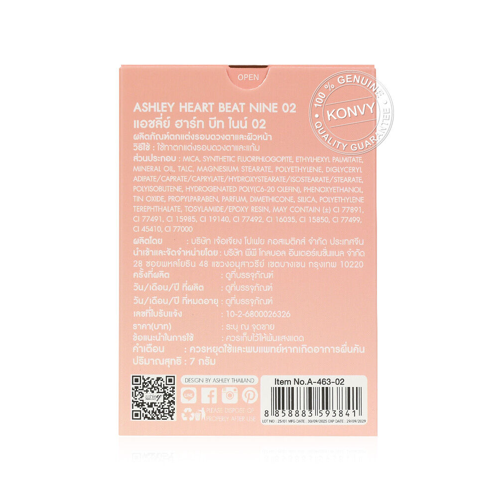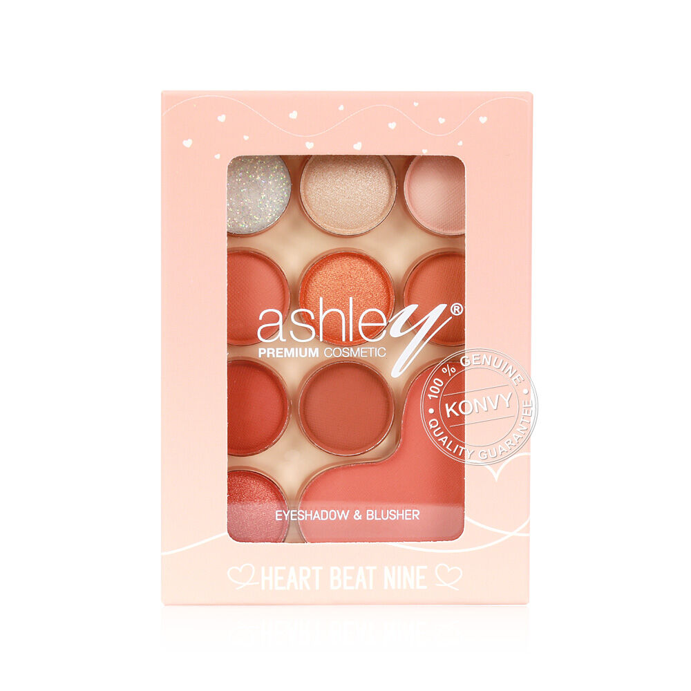 Ashley Heart Beat Nine 7g #02 พาเลทอายแชโดว์และบลัชออน รวม 10 เฉดสี มีทั้งเนื้อแมท ชิมเมอร์ และกลิตเตอร์ สวยครบทุกลุค เนื้อเนียนละเอียด เกลี่ยง่าย พิกเมนต์แน่น ติดทนนาน ไม่หลุดระหว่างวัน