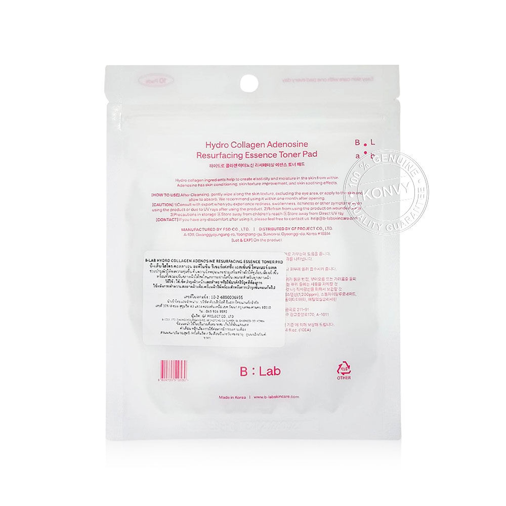 B:LAB Hydro Collagen Adenosine Resurfacing Essence Toner Pad [25ml x 10 Pads] โทนเนอร์แพด ช่วยลดเลือนริ้วรอย คืนความยืดหยุ่น ปรับสภาพผิวให้ดูเรียบเนียนขึ้น ผิวดูสดใส และกระจ่างใสขึ้น