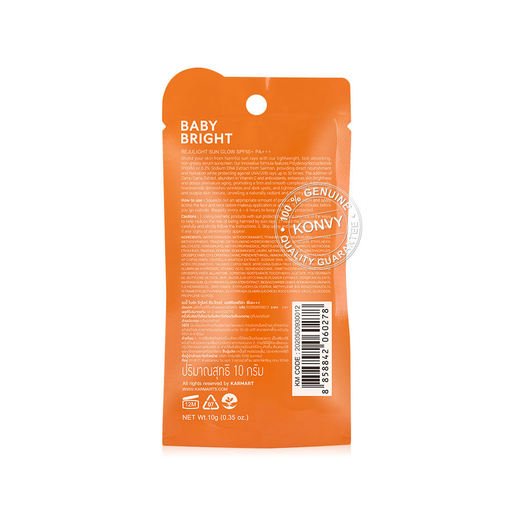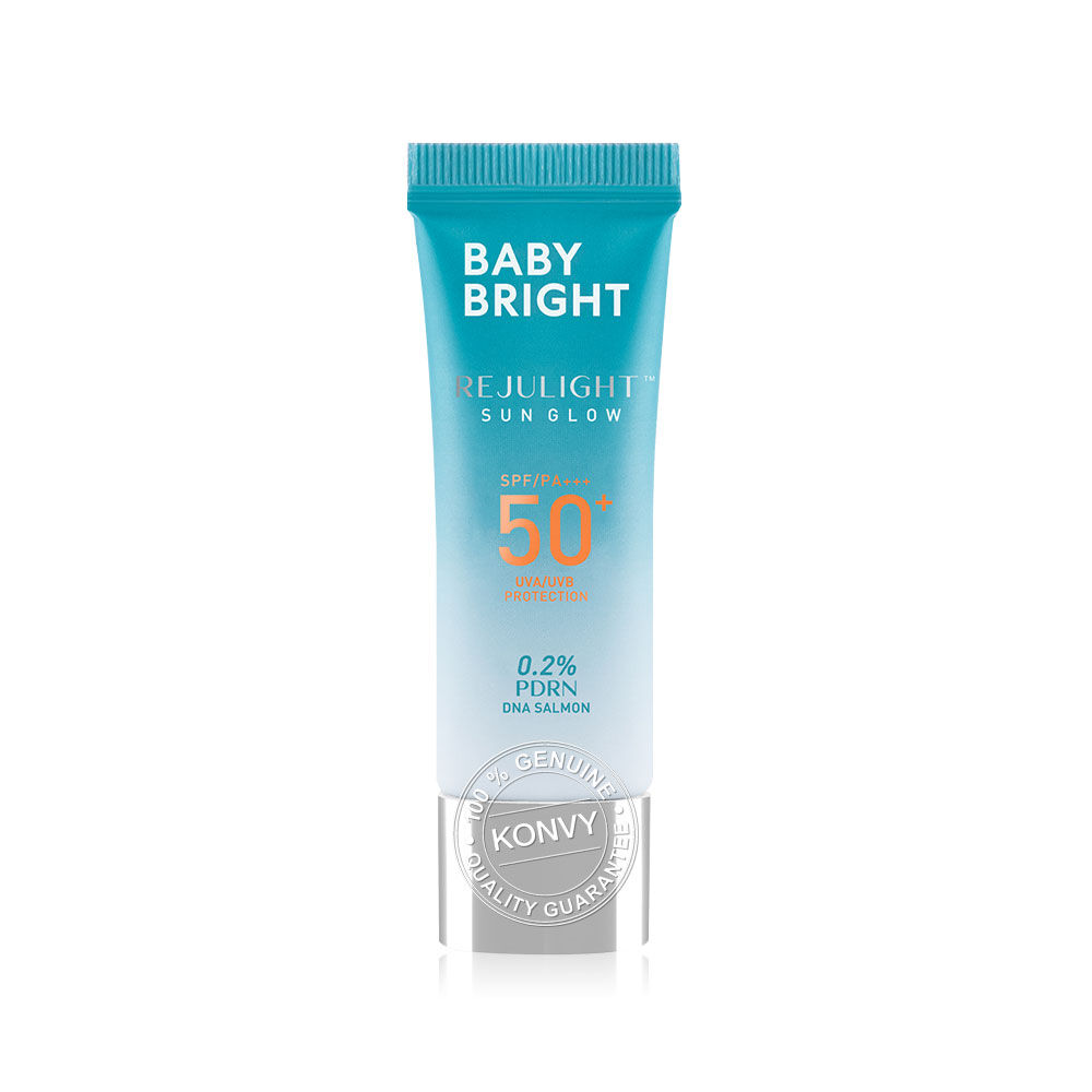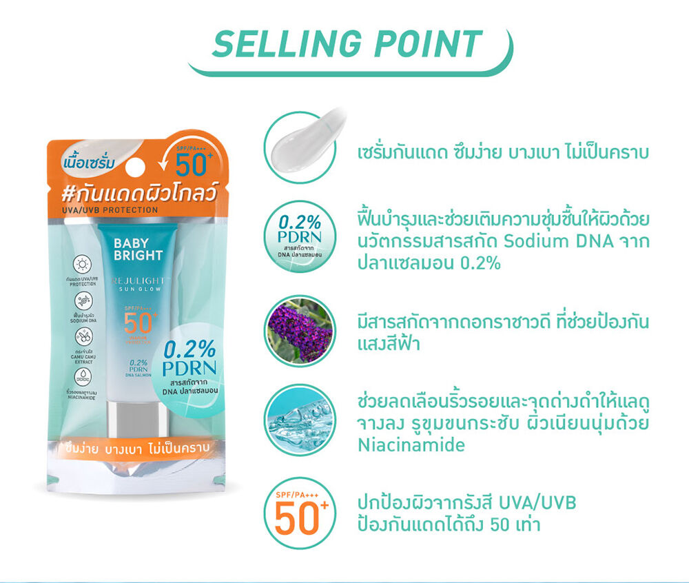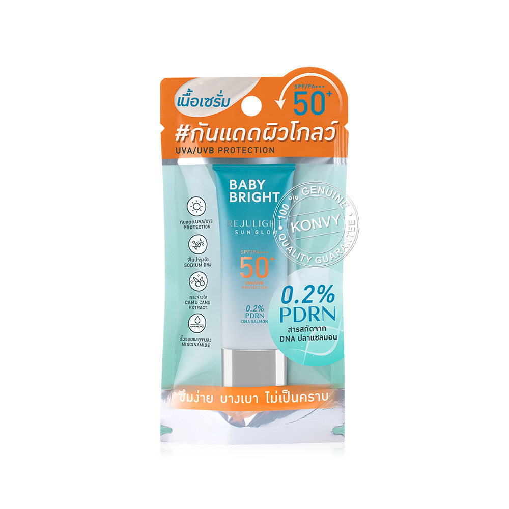 Baby Bright Rejulight Sun Glow SPF50+ PA+++ 10g กันแดดเนื้อเซรั่ม ซึมง่าย บางเบา ไม่เป็นคราบ มาพร้อมนวัตกรรมการฟื้นฟูผิวด้วยสารสกัด Polydeoxyribonucleotide (PDRN) หรือสารสกัด Sodium DNA จากปลาแซลมอน 0.2% สู่ผลิตภัณฑ์กันแดดผิวหน้ารีจูไลท์ซันโกลว์ ตรงเข้าฟื้นบำรุงและช่วยเติมความชุ่มชื้นให้กับผิว ปกป้องผิวจากรังสี UVA/UVB ป้องกันแดดได้มากถึง 50 เท่า ผสานคุณประโยชน์สารสกัดจากคามูคามู (Camu Camu Extract) ที่อุดมไปด้วย Vitamin C และสารแอนตี้ออกซิแดนท์ ช่วยปรับสภาพผิวให้ดูเปล่งปลั่ง กระจ่างใส ป้องกันการเกิดริ้วรอยก่อนวัย ให้ผิวแลดูกระชับ เรียบเนียน ทั้งยังมี Niacinamide ช่วยลดเลือนริ้วรอยและจุดด่างดำให้ดูจางลง รูขุมขนกระชับ ผิวดูเนียนนุ่ม ชุ่มชื้นไม่แห้งกร้าน เผยผิวโกลว์ใส ดูสุขภาพดีอย่างเป็นธรรมชาติ
