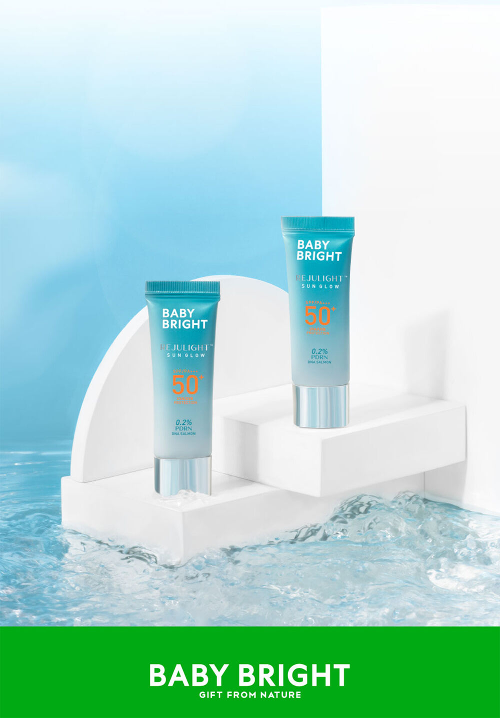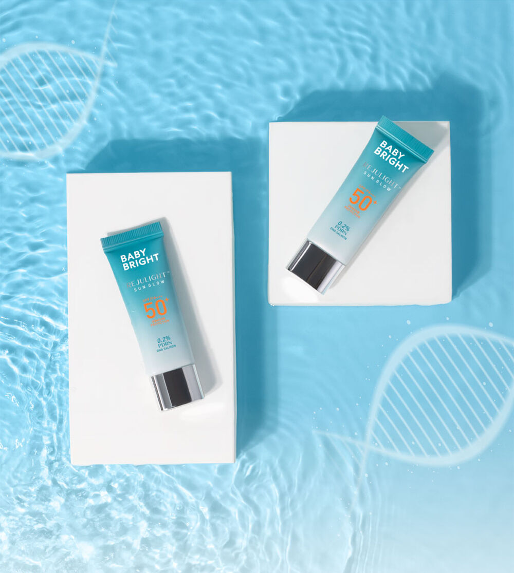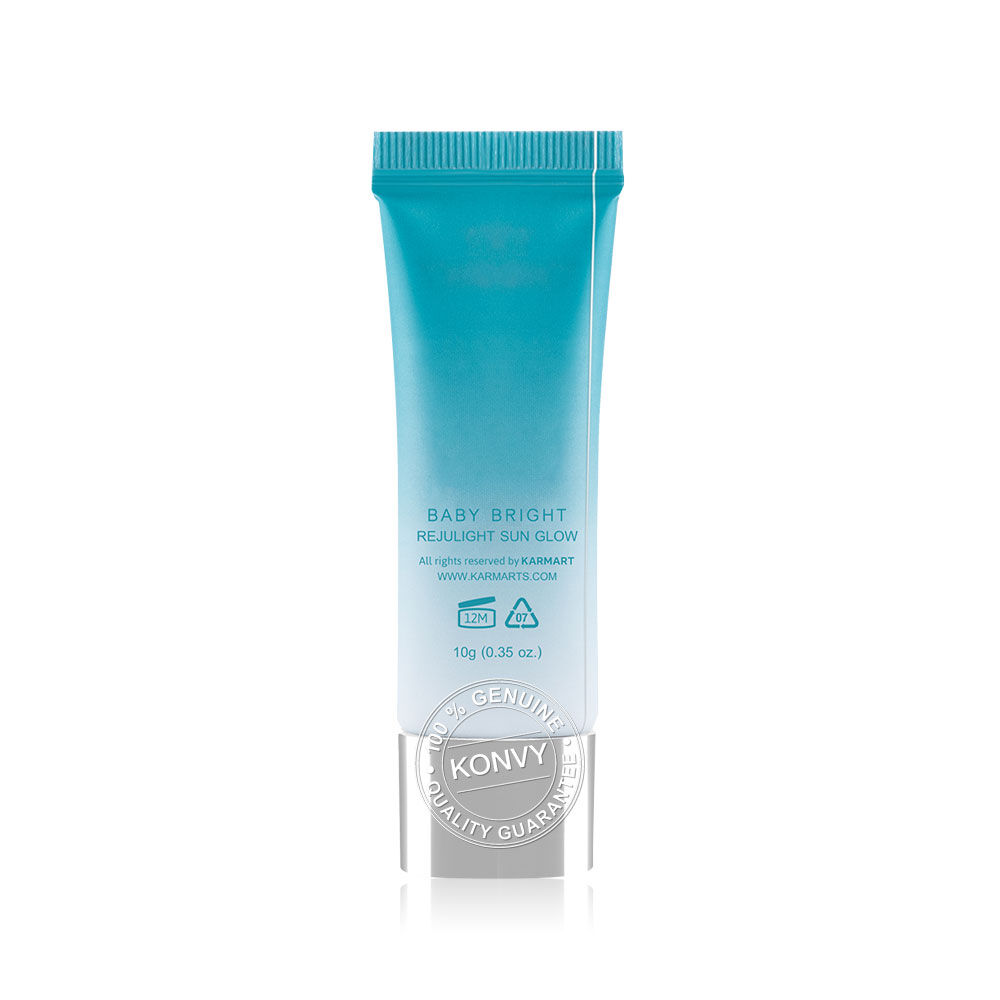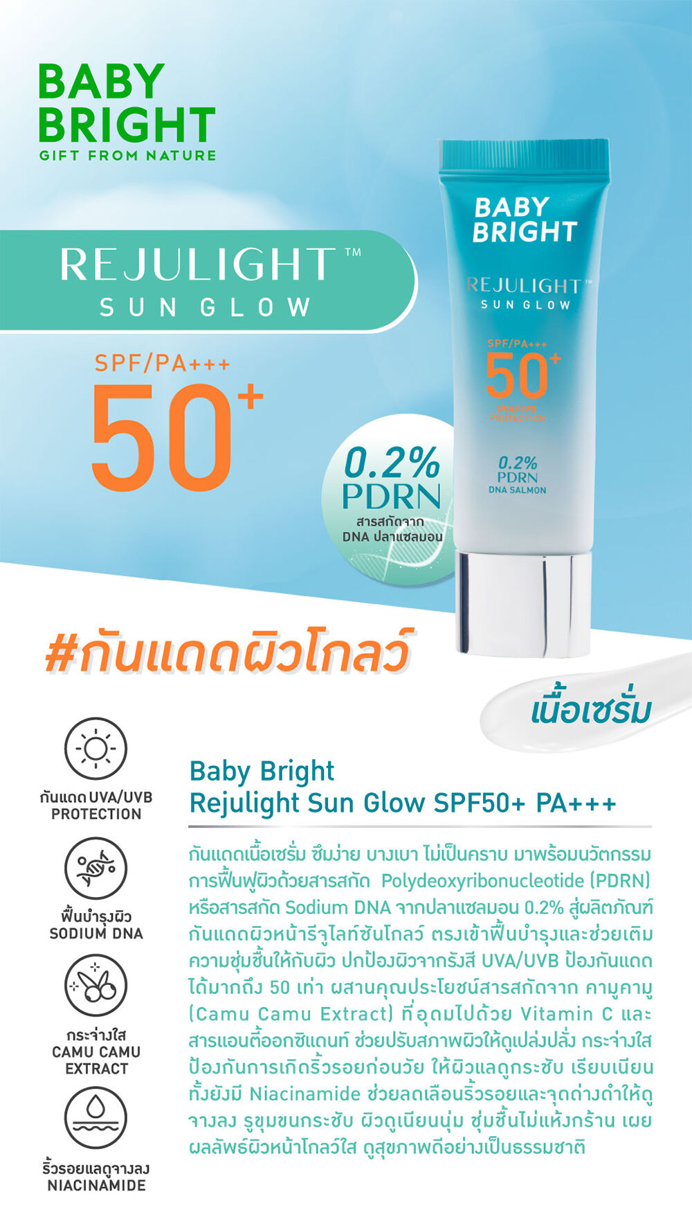 Baby Bright Rejulight Sun Glow SPF50+ PA+++ 10g กันแดดเนื้อเซรั่ม ซึมง่าย บางเบา ไม่เป็นคราบ มาพร้อมนวัตกรรมการฟื้นฟูผิวด้วยสารสกัด Polydeoxyribonucleotide (PDRN) หรือสารสกัด Sodium DNA จากปลาแซลมอน 0.2% สู่ผลิตภัณฑ์กันแดดผิวหน้ารีจูไลท์ซันโกลว์ ตรงเข้าฟื้นบำรุงและช่วยเติมความชุ่มชื้นให้กับผิว ปกป้องผิวจากรังสี UVA/UVB ป้องกันแดดได้มากถึง 50 เท่า ผสานคุณประโยชน์สารสกัดจากคามูคามู (Camu Camu Extract) ที่อุดมไปด้วย Vitamin C และสารแอนตี้ออกซิแดนท์ ช่วยปรับสภาพผิวให้ดูเปล่งปลั่ง กระจ่างใส ป้องกันการเกิดริ้วรอยก่อนวัย ให้ผิวแลดูกระชับ เรียบเนียน ทั้งยังมี Niacinamide ช่วยลดเลือนริ้วรอยและจุดด่างดำให้ดูจางลง รูขุมขนกระชับ ผิวดูเนียนนุ่ม ชุ่มชื้นไม่แห้งกร้าน เผยผิวโกลว์ใส ดูสุขภาพดีอย่างเป็นธรรมชาติ