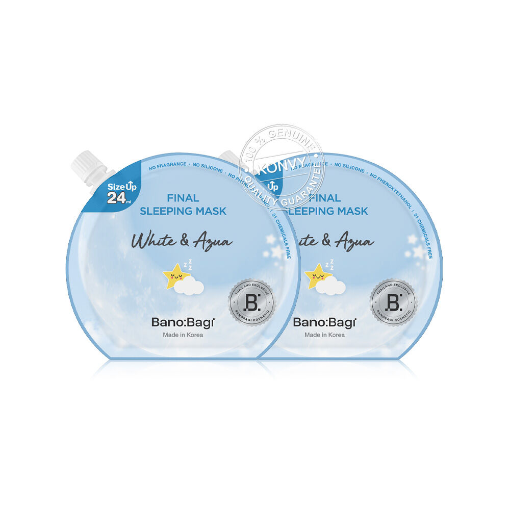 BANOBAGI Final Sleeping Mask White & Aqua [24ml x 2pcs] สลีปปิ้งมาสก์ สูตร White & Aqua ด้วยอนุภาคของ Double Complex (10-Hya & 9-Peptide) อัพผิวแลดูกระจ่างใส เสริมผิวให้แข็งแรง ช่วยเติมและกักเก็บความชุ่มชื้นในชั้นผิวได้ยาวนาน ล็อคผิวฟูดูอิ่มน้ำ ลดปัญหาผิวแห้งกร้านขาดน้ำ พร้อมลดเลือนริ้วรอยก่อนวัย