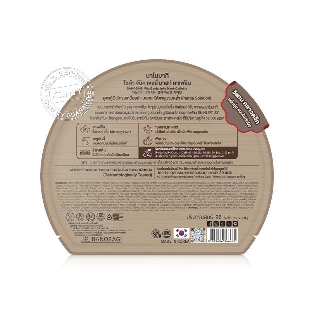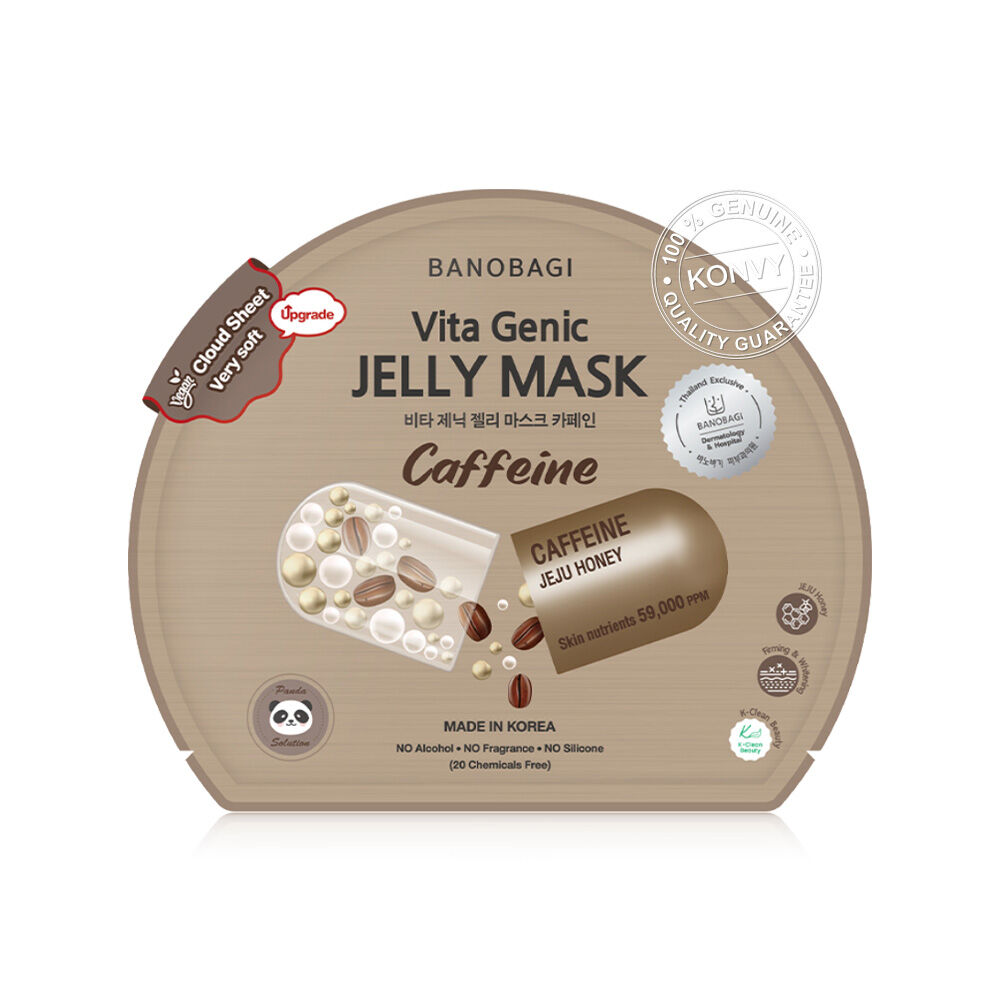 BANOBAGI Vita Genic Jelly Mask Caffeine [26ml x 10pcs] แผ่นมาสก์หน้าในรูปแบบเจลลี่เซรั่ม คิดค้นและพัฒนาสูตรโดยทีมแพทย์ผิวหนังโรงพยาบาลบาโนบากิ ประเทศเกาหลี ด้วยเทคโนโลยีการกักเก็บสารบำรุงจากไนอะซินาไมด์, ไฮยาลูรอน, อะดีโนซีน, คาร์นิทีน, วิตามินและสารอาหารผิว ที่มีปริมาณสูงถึง 59,000 ppm ช่วยเติมสารอาหารสู่ผิวอย่างล้ำลึก ผสานคุณค่าจากคาเฟอีน, SKINLIFT-33, เจจูฮันนี่, ฟักทอง และอิลาสติน ช่วยฟื้นฟูผิวโทรม ปรับผิวให้ยืดหยุ่น ลดเลือนความหมองคล้ำใต้ตา และเติมความชุ่มชื้นให้ผิว บูสต์ผิวเนียนกระชับ ดูอิ่มฟู