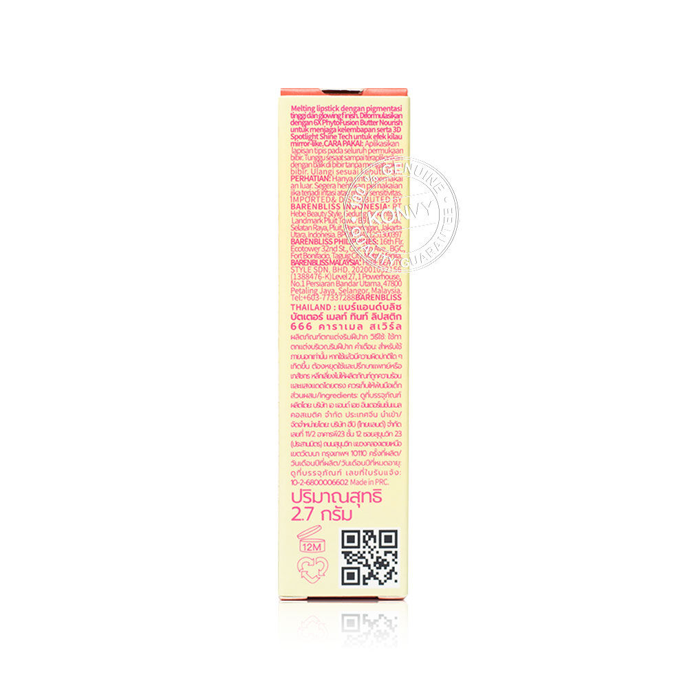 barenbliss Butter Melt Tinted Lipstick 2.7g #666 Caramel Swirl ลิปบาล์มเนื้อเนียนนุ่ม สัมผัสบางเบาสบายปาก เม็ดสีชัด เกลี่ยง่าย ไม่เหนียวเหนอะหนะ กันน้ำ ติดทนนาน ด้วยส่วนผสม 6X PhytoFusion Butter Nourish ช่วยบำรุงให้ริมฝีปากเนียนนุ่ม ชุ่มชื้น พร้อมมีเทคโนโลยี 3D Spotlight Shine ช่วยเพิ่มความฉ่ำวาวขั้นสุด เพิ่มมิติให้เรียวปากดูอวบอิ่ม สะกดทุกสายตา