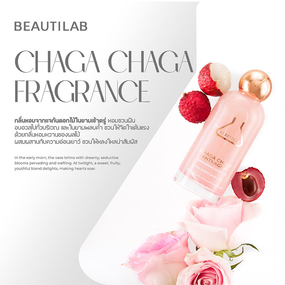 Beautilab Chaga Chaga Anti-Aging Shimmering Body Oil 100ml บอดี้ออยล์บำรุงผิวโกลว์ กลิ่น Chaga Chaga เผยผิวเปล่งประกาย ดูมีออร่า ด้วยชิมเมอร์เนื้อละเอียด ช่วยปลอบประโลมผิวแห้งกร้าน บำรุงผิวให้ชุ่มชื้น ดูฉ่ำวาว ไม่เหนียวเหนอะหนะ