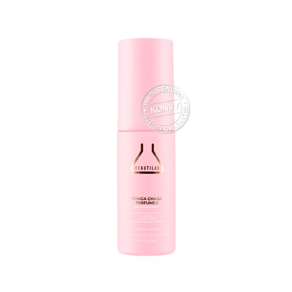 Beautilab Chaga Chaga Perfumed Deodorant Spray 100ml สเปรย์ระงับกลิ่นกาย ช่วยลดเหงื่อและกลิ่นไม่พึงประสงค์ ดูแลผิวใต้วงแขนให้กระจ่างใส หัวสเปรย์ออกแบบมาให้ฉีดง่าย แห้งสบาย ไม่เหนียวเหนอะหนะ และไม่ทิ้งคราบเหลือง เสริมความมั่นใจตลอดวันด้วยกลิ่นหอมเย้ายวนของกุหลาบ ไอริส และวานิลลา