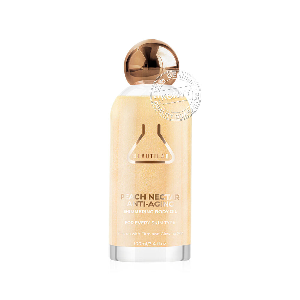 Beautilab Peach Nectar Anti-Aging Shimmering Body Oil 100ml บอดี้ออยล์บำรุงผิวโกลว์ กลิ่น Peach Nectar เผยผิวเปล่งประกาย ดูมีออร่า ด้วยชิมเมอร์เนื้อละเอียด ช่วยปลอบประโลมผิวแห้งกร้าน บำรุงผิวให้ชุ่มชื้น ดูฉ่ำวาว ไม่เหนียวเหนอะหนะ