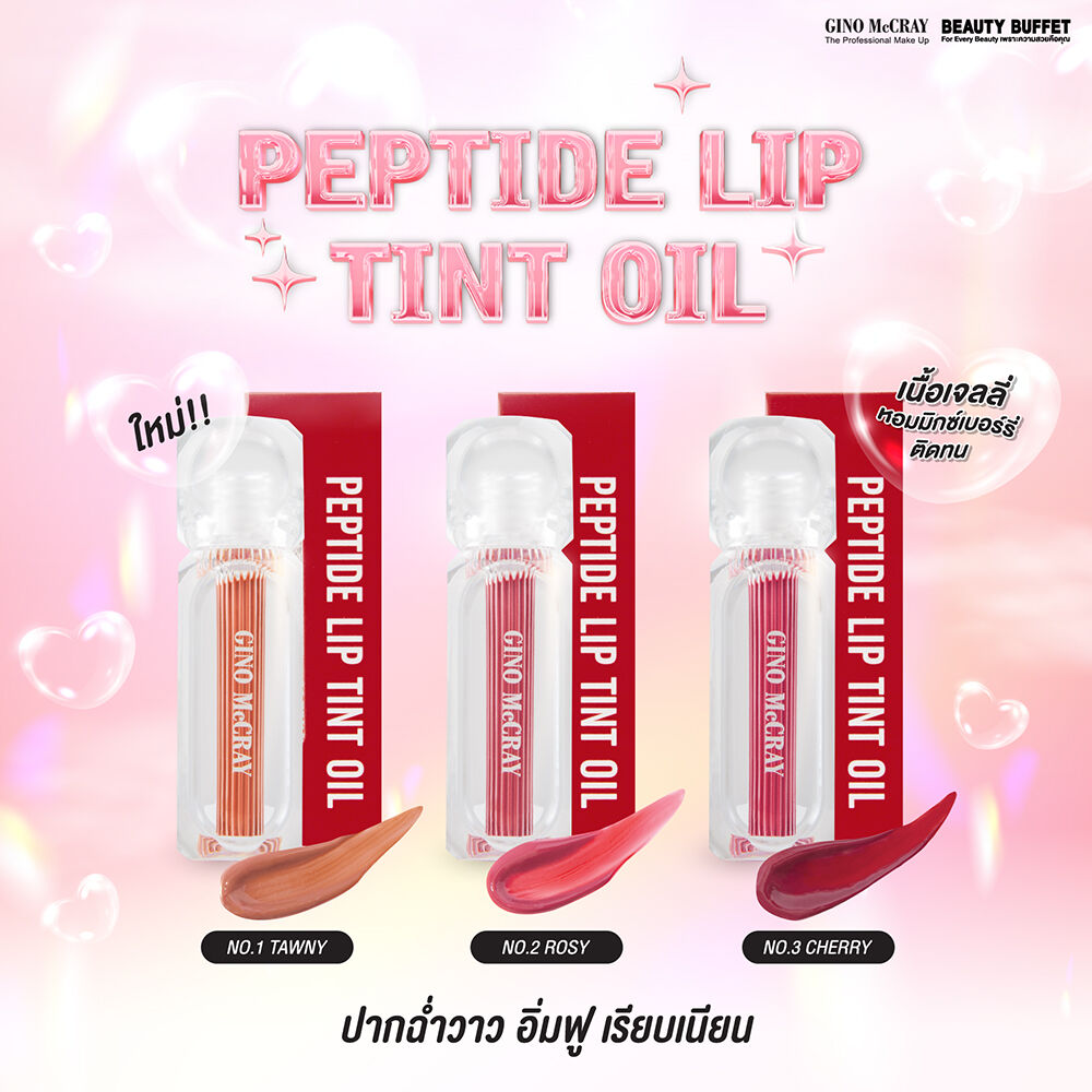 Beauty Buffet Gino Mccray Peptide Lip Tint Oil 2.3g #03 Cherry ลิปทินท์ออยล์ เพื่อริมฝีปากเงาแวววาวเป็นประกายดุจกระจก เนื้อลิปสัมผัสดุจเจลลี่ สีสันสดใส อุดมไปด้วย Bionic Tripeptide และ Ceramide Complex ช่วยฟื้นฟูริมฝีปากที่แห้งแตก ให้กลับมามีความชุ่มชื้น ยืดหยุ่น เรียบเนียนมากยิ่งขึ้น พร้อมสารสกัดจาก Mix Berry และ Cucumber ช่วยปกป้องริมฝีปากไม่ให้เกิดริ้วรอย พร้อมบำรุงริมฝีปากให้มีสุขภาพดี