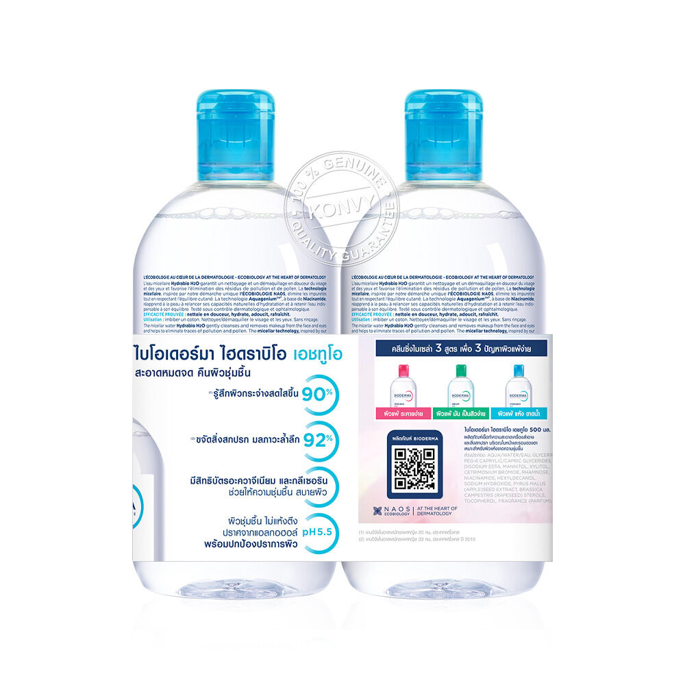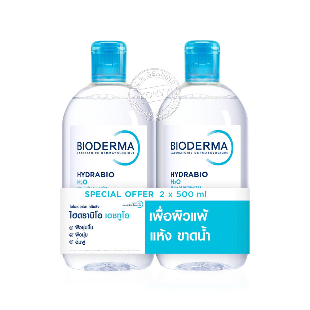 Bioderma Hydrabio H2O Cleansing [500ml x 2pcs] ผลิตภัณฑ์ทำความสะอาดผิวสำหรับผิวแห้งและขาดความชุ่มชื่น เทคโนโลยี Micellar Water ขจัดสิ่งสกปรกหมดจดโดยไม่ต้องล้างน้ำซ้ำ ด้วยนวัตกรรม Aquagenium สิทธิบัตรเฉพาะที่ช่วยเพิ่มประสิทธิภาพการส่งผ่านความชุ่มชื่นตามธรรมชาติของผิว ป้องกันการสูญเสียน้ำ คืนความสมดุลและเพิ่มความแข็งแรงให้ผิว อ่อนโยนต่อผิว ไม่ทำให้ผิวแห้งตึงหลังใช้