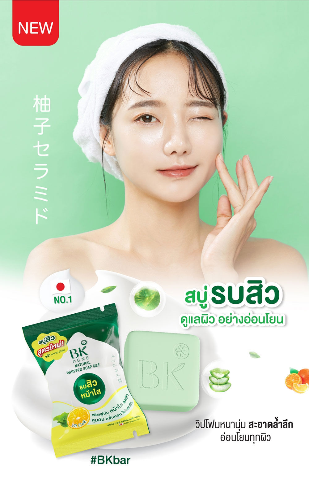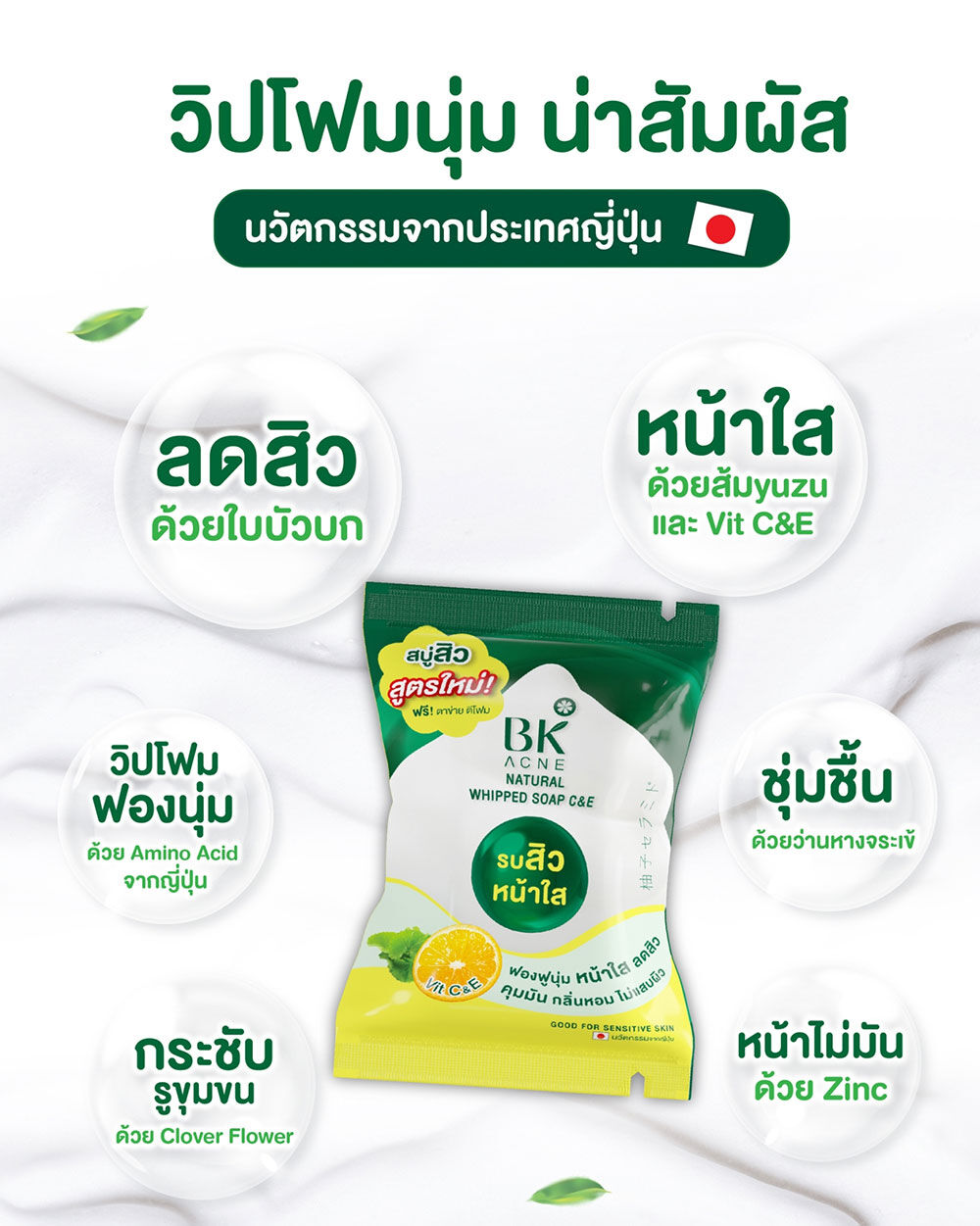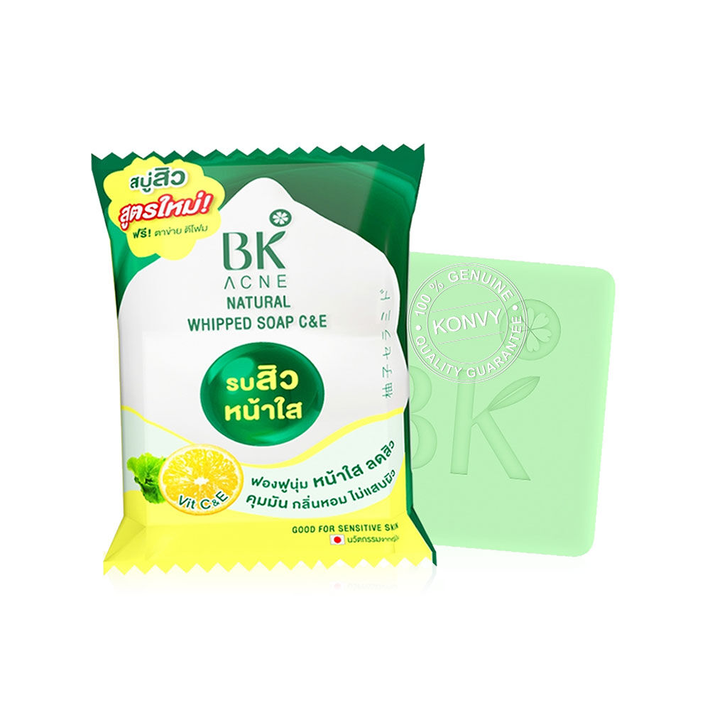 BK Acne Natural Whipped Soap C&E 60g สบู่ทำความสะอาดผิวหน้า ด้วยคุณค่าแห่งการทำความสะอาดอย่างอ่อนโยน พร้อมการบำรุงสู่ผิวหน้าที่นุ่มกว่าที่เคยด้วยเนื้อฟองโฟมนุ่มละมุนคล้ายวิปครีมจาก Amino Acid Cleanser และ Chaga Mushroom Extract ให้ความรู้สึกผ่อนคลาย และสบายผิวหน้า เวลาสัมผัสและขณะล้างหน้าจะช่วยถนอมผิว ไม่ทำให้ผิวหน้าแห้งตึง อีกทั้งยังผสานพลังการดูแลผิว ปัญหาสิวจากธรรมชาติด้วย Tea Tree Oil พร้อมด้วยสารสกัดจาก Madacassoside Vitamin B3 และ NADG ช่วยให้ผิวหน้าแลดูกระจ่างใส เผยผิวอ่อนเยาว์สุขภาพดี