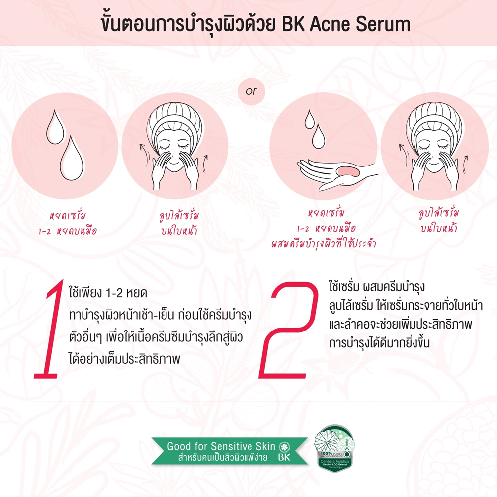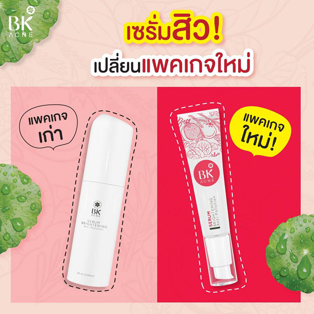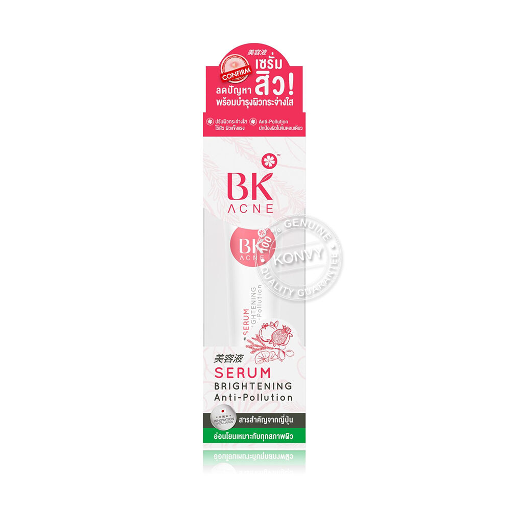 BK Acne Serum Brightening Anti-Pollution 35g เซรั่มเข้มข้นสูตรพิเศษ สำหรับคนเป็นสิวผิวแพ้ง่าย อุดมไปด้วยสารสกัดจากธรรมชาติ เนื้อบางเบา ซึมซาบเร็ว ไม่เหนียวเหนอะหนะ ช่วยลดปัญหาสิว ยับยั้งการเกิดสิวใหม่ ลดความมันบนใบหน้า และฟื้นฟูบำรุงผิวให้รูขุมขนกระชับ ใบหน้าเนียนขาวกระจ่างใสอย่างเป็นธรรมชาติ