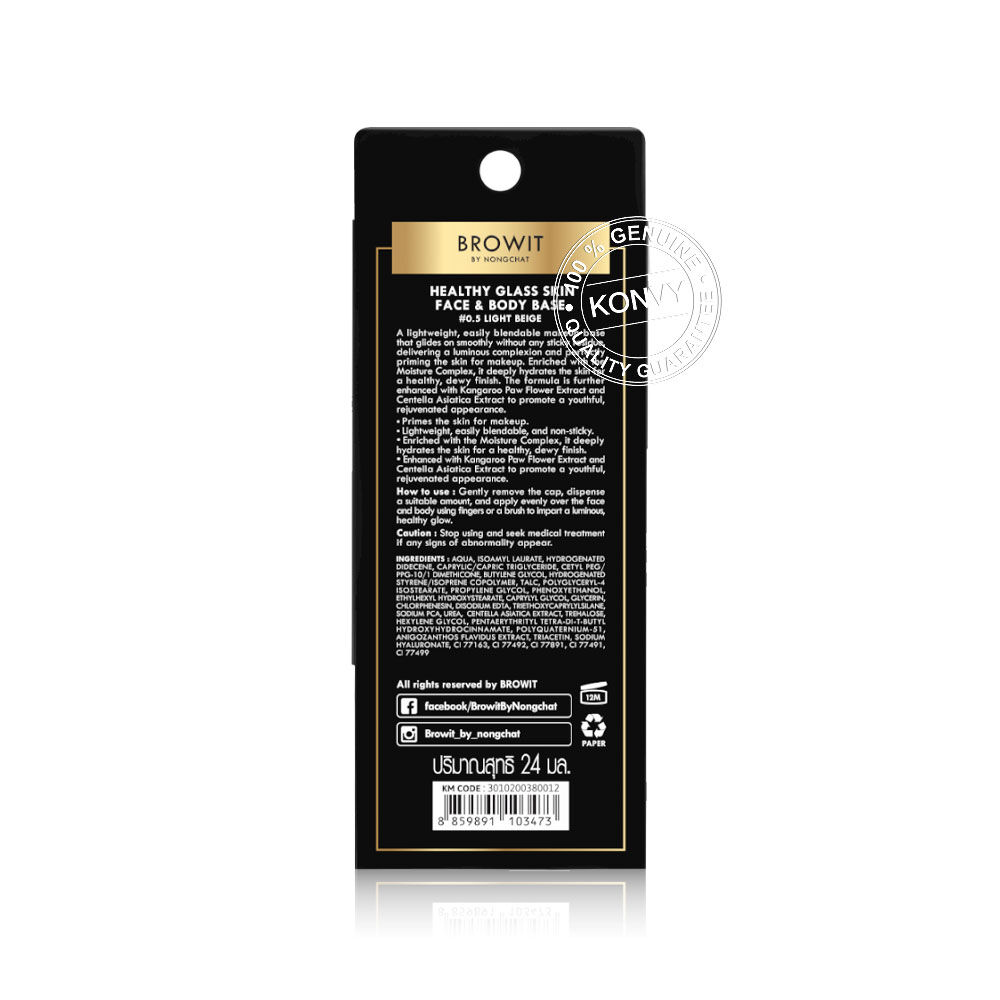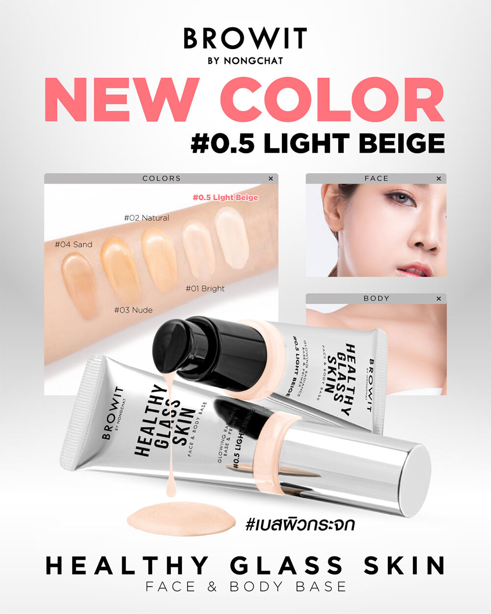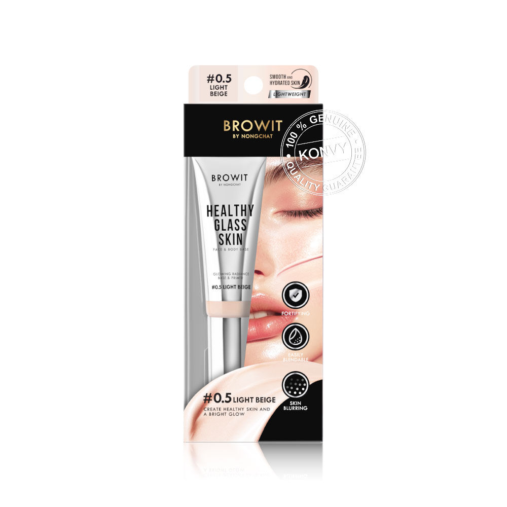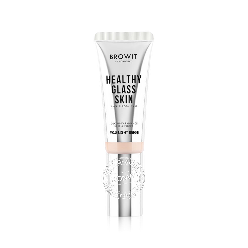 Browit Healthy Glass Skin Face & Body Base 24ml #0.5 Light Beige เบสแต่งหน้า เนื้อบางเบา เกลี่ยง่าย ไม่เหนียวเหนอะหนะ เนรมิตผิวสวยกระจ่างใส เตรียมผิวพร้อมก่อนแต่งหน้า ด้วยส่วนผสมจากสารบำรุงผิว Moisture Complex ที่ช่วยเพิ่มความชุ่มชื้นให้ผิวแลดูสุขภาพดี อีกทั้งผสานพลังจากสารสกัดธรรมชาติจากดอกแกงการู พาว์ และสารสกัดจากใบบัวบก เพื่อมอบความอ่อนเยาว์ให้แก่ผิวมากยิ่งขึ้น
