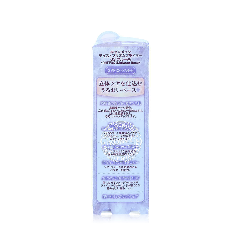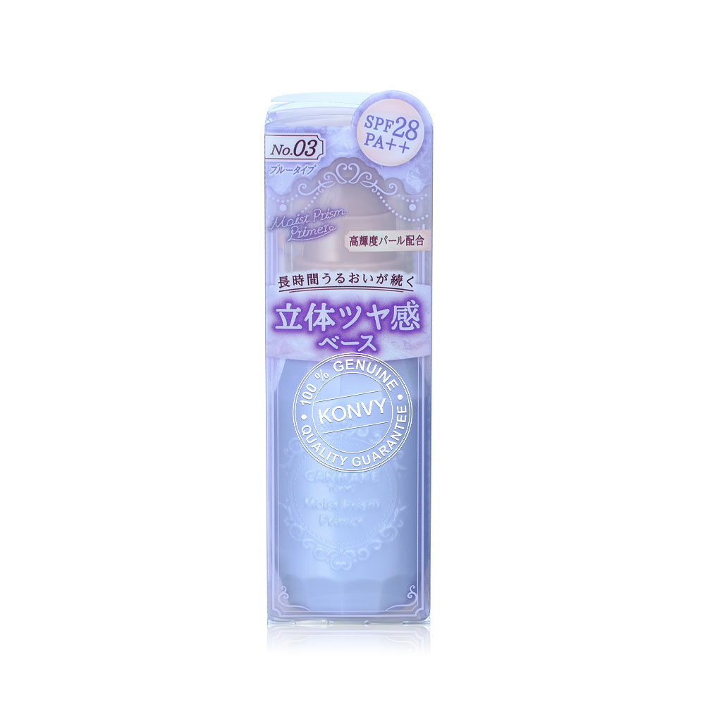 Canmake Moist Prism Primer 25g #03 Pale Blue ไพร์เมอร์ปริซึม สูตรผสานพลังของไข่มุกเข้มข้น เนื้อบางเบา เกลี่ยง่าย ซึมไวสบายผิว ไม่เหนียวเหนอะหนะ มีเอฟเฟกต์ซอฟต์โฟกัส ช่วยเบลอผิวให้เรียบเนียน และปรับสีผิวให้สม่ำเสมอ ผสานส่วนผสมของไข่มุกเข้มข้น ช่วยให้ผิวดูเปล่งปลั่งเป็นประกายแวววาว สุขภาพดี พร้อมมีสารบำรุงมากถึง 17 ชนิด ช่วยเติมความชุ่มชื้นให้ผิวดูอิ่มน้ำ มอบผิวสวยเป๊ะตลอดวัน