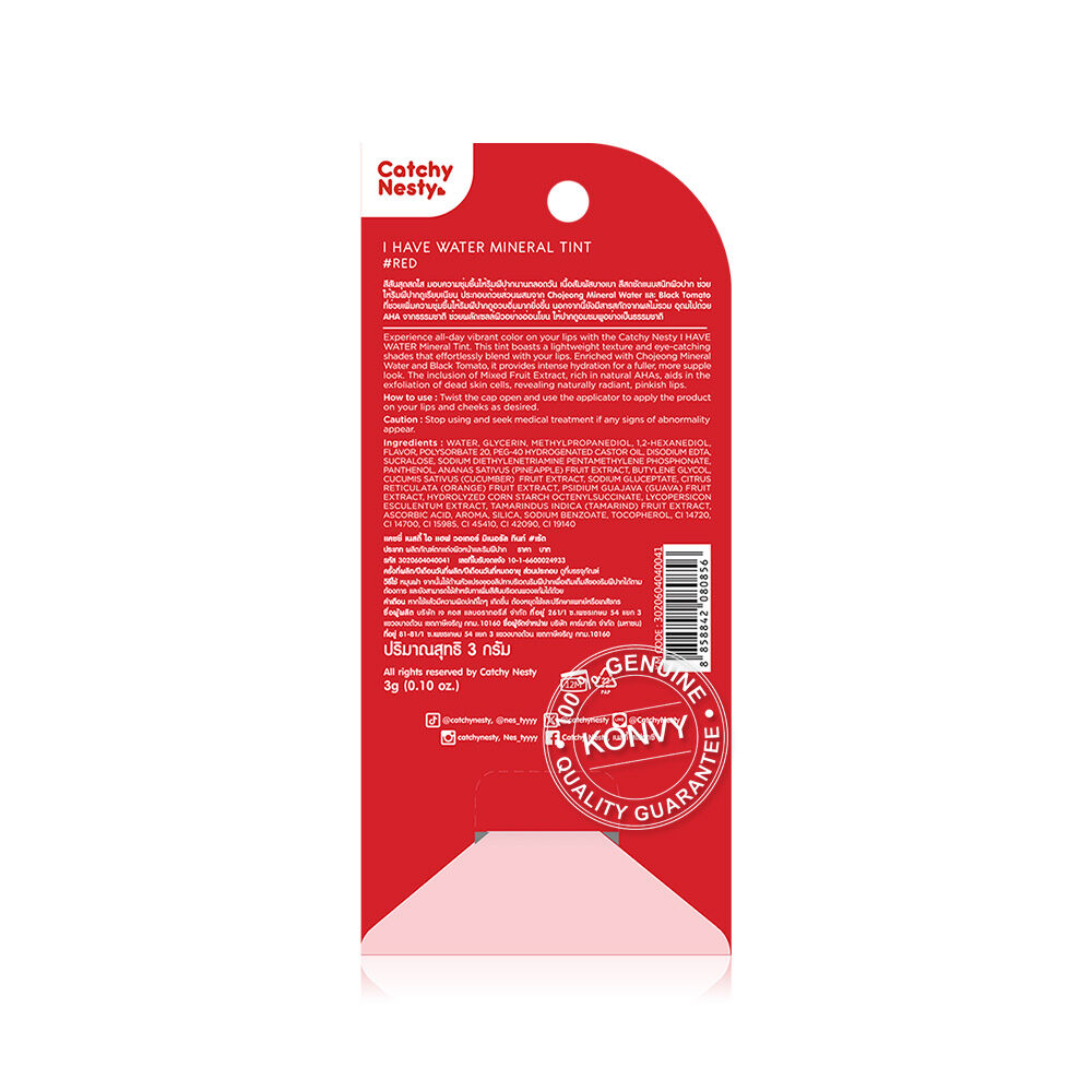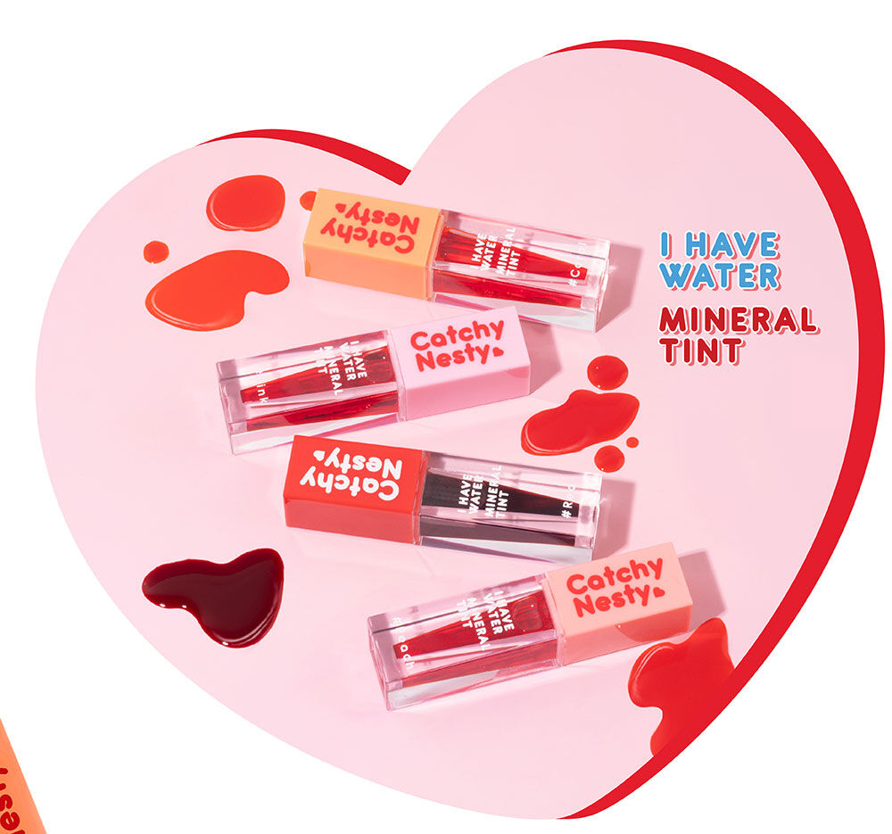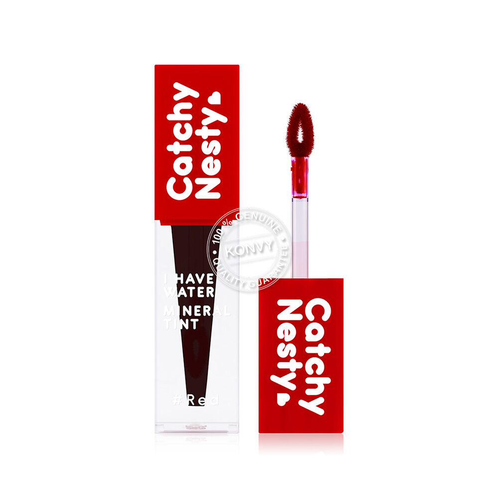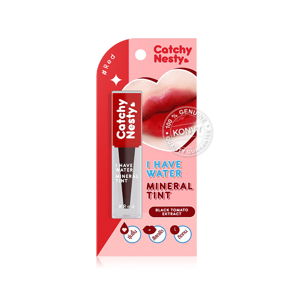 Catchy Nesty I Have Water Mineral Tint 3g #Red ลิปทินท์สีสันสุดสดใส มอบความชุ่มชื้นให้ริมฝีปากนานตลอดวัน เนื้อสัมผัสบางเบา สีสดชัดแนบสนิทผิวปาก ช่วยให้ริมฝีปากดูเรียบเนียน ประกอบด้วยส่วนผสมจาก Chojeong Mineral Water และ Black Tomato ที่ช่วยเพิ่มความชุ่มชื้นให้ริมฝีปากดูอวบอิ่มมากยิ่งขึ้น นอกจากนี้ยังมีสารสกัดจากผลไม้รวม อุดมไปด้วย AHA จากธรรมชาติ ช่วยผลัดเซลล์ผิวอย่างอ่อนโยน ให้ปากดูอมชมพูอย่างเป็นธรรมชาติ
