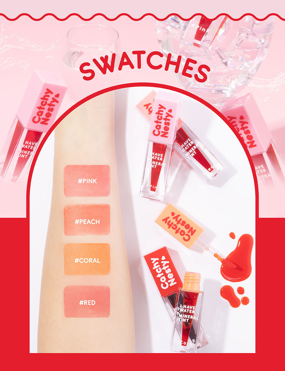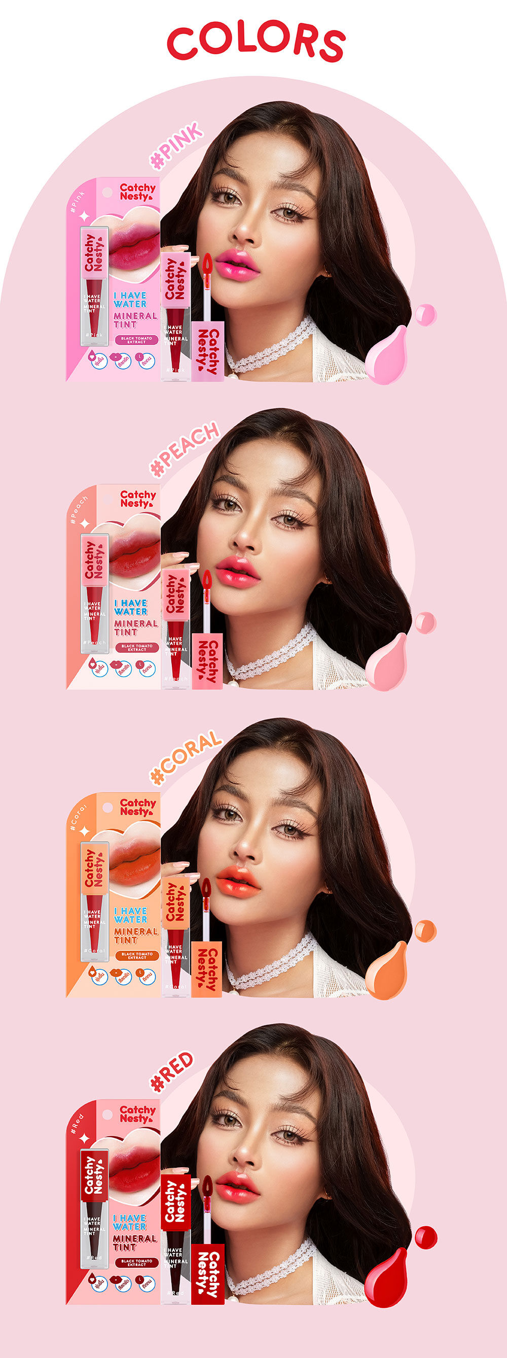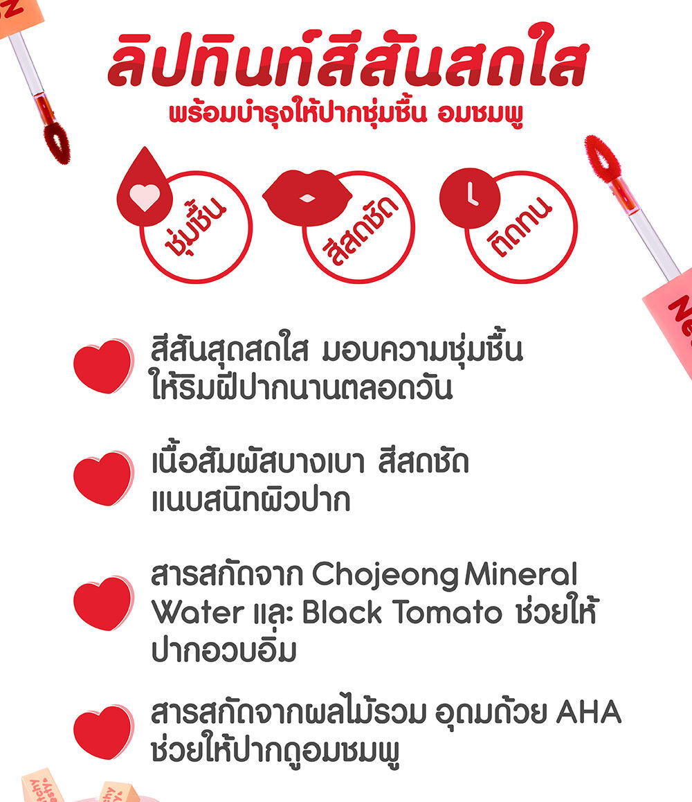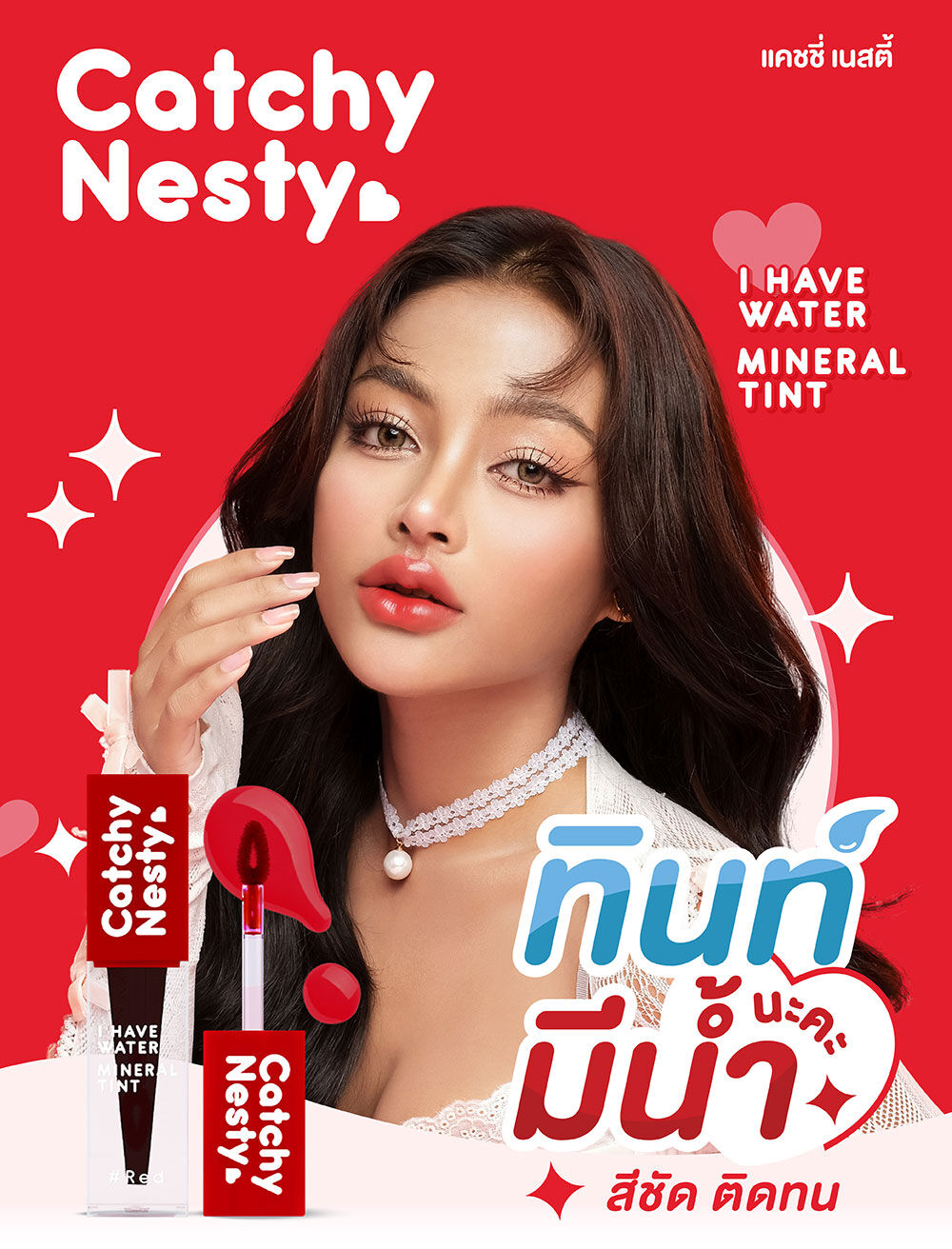 Catchy Nesty I Have Water Mineral Tint 3g #Red ลิปทินท์สีสันสุดสดใส มอบความชุ่มชื้นให้ริมฝีปากนานตลอดวัน เนื้อสัมผัสบางเบา สีสดชัดแนบสนิทผิวปาก ช่วยให้ริมฝีปากดูเรียบเนียน ประกอบด้วยส่วนผสมจาก Chojeong Mineral Water และ Black Tomato ที่ช่วยเพิ่มความชุ่มชื้นให้ริมฝีปากดูอวบอิ่มมากยิ่งขึ้น นอกจากนี้ยังมีสารสกัดจากผลไม้รวม อุดมไปด้วย AHA จากธรรมชาติ ช่วยผลัดเซลล์ผิวอย่างอ่อนโยน ให้ปากดูอมชมพูอย่างเป็นธรรมชาติ
