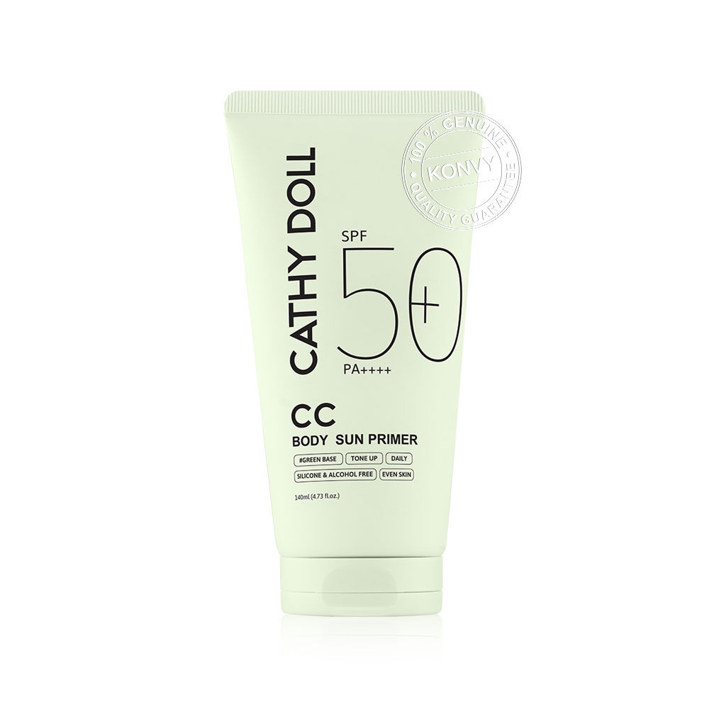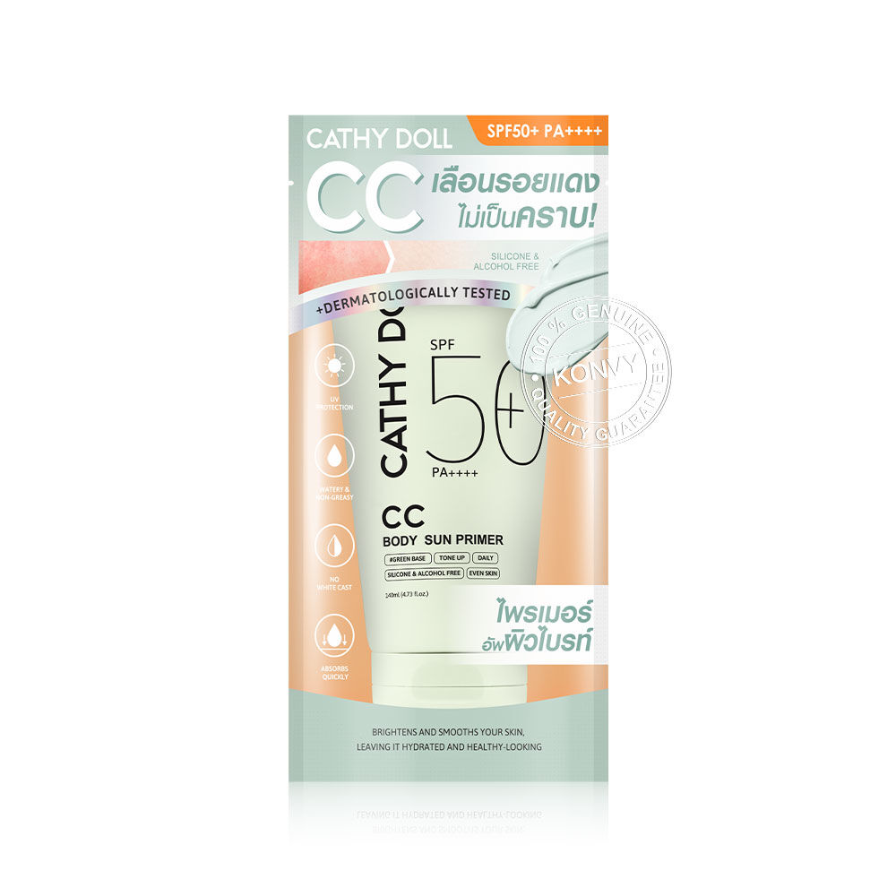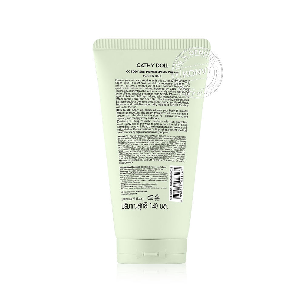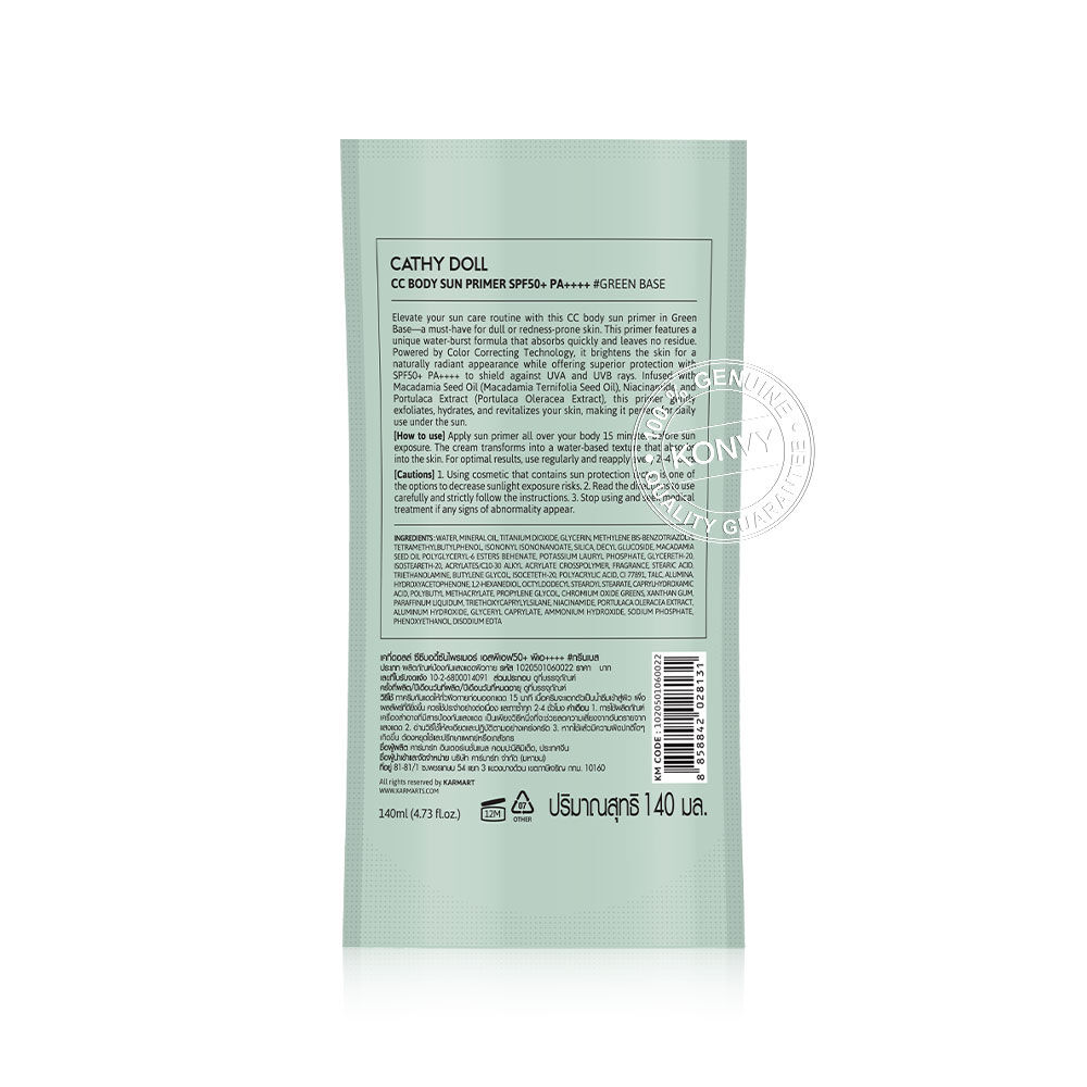 Cathy Doll CC Body Sun Primer SPF50+ PA++++ 140ml #Green Base กันแดดไพรเมอร์สำหรับผิวกาย เนื้อบางเบา ซึมซาบเร็ว ไม่ทิ้งคราบ มาพร้อมเทคโนโลยี Color Correcting ช่วยปรับสีผิวให้ดูกระจ่างใสอย่างเป็นธรรมชาติ พร้อมปกป้องผิวจากแสงแดดด้วย SPF50+ PA++++ ปกป้องผิวจากรังสี UVA และ UVB ผสานสารสกัดจากน้ำมันเมล็ดแมคคาเดเมีย, ไนอะซินาไมด์ และสารสกัดจากพอร์ทูลาคา ช่วยผลัดเซลล์ผิวอย่างอ่อนโยน บำรุงผิวให้ชุ่มชื้นและกระจ่างใส ปกป้องผิวจากแสงแดดที่เกิดขึ้นในระหว่างวัน