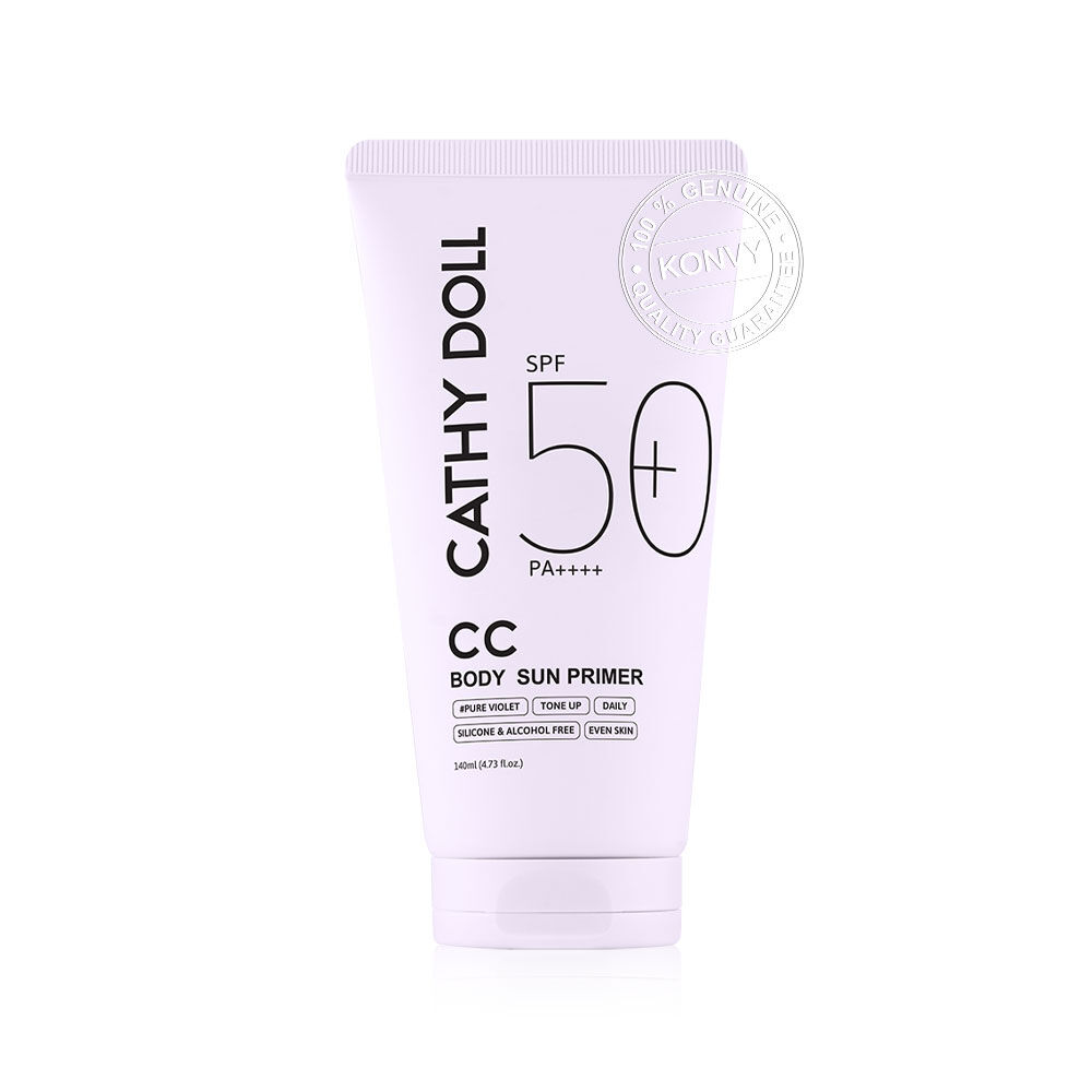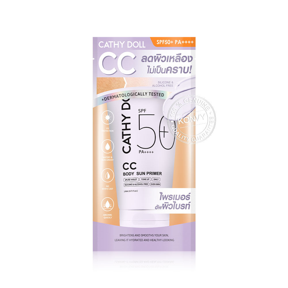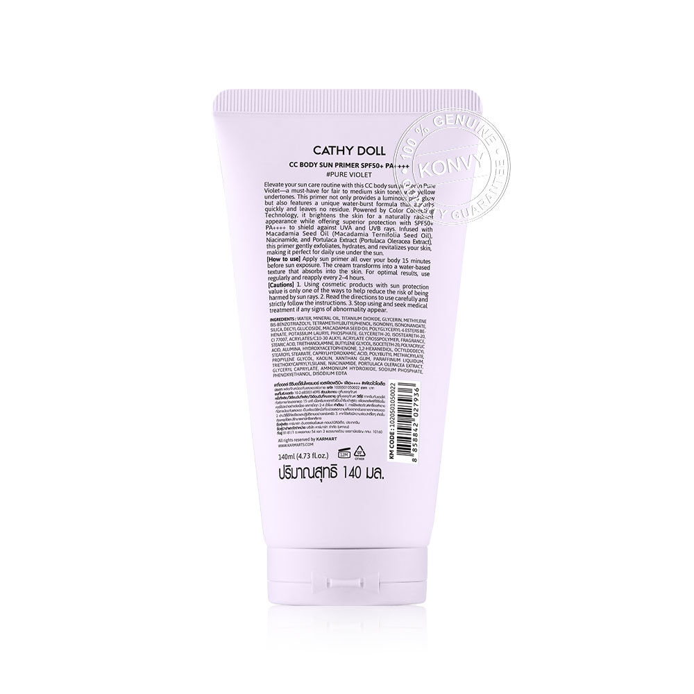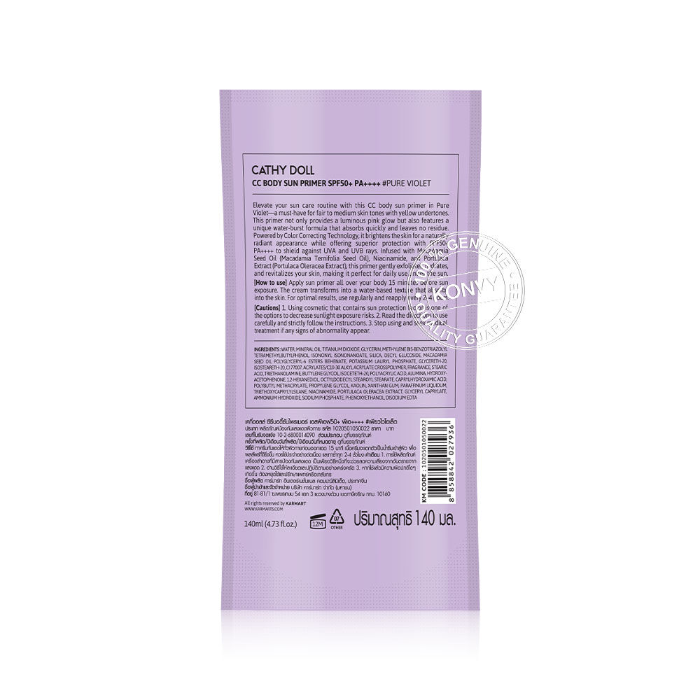 Cathy Doll CC Body Sun Primer SPF50+ PA++++ 140ml #Pure Violet กันแดดไพรเมอร์สำหรับผิวกาย เนื้อบางเบา ซึมซาบเร็ว ไม่ทิ้งคราบ มาพร้อมเทคโนโลยี Color Correcting ช่วยปรับสีผิวให้ดูกระจ่างใสอย่างเป็นธรรมชาติ พร้อมปกป้องผิวจากแสงแดดด้วย SPF50+ PA++++ ปกป้องผิวจากรังสี UVA และ UVB ผสานสารสกัดจากน้ำมันเมล็ดแมคคาเดเมีย, ไนอะซินาไมด์ และสารสกัดจากพอร์ทูลาคา ช่วยผลัดเซลล์ผิวอย่างอ่อนโยน บำรุงผิวให้ชุ่มชื้นและกระจ่างใส ปกป้องผิวจากแสงแดดที่เกิดขึ้นในระหว่างวัน
