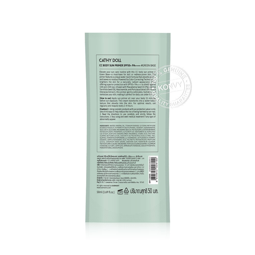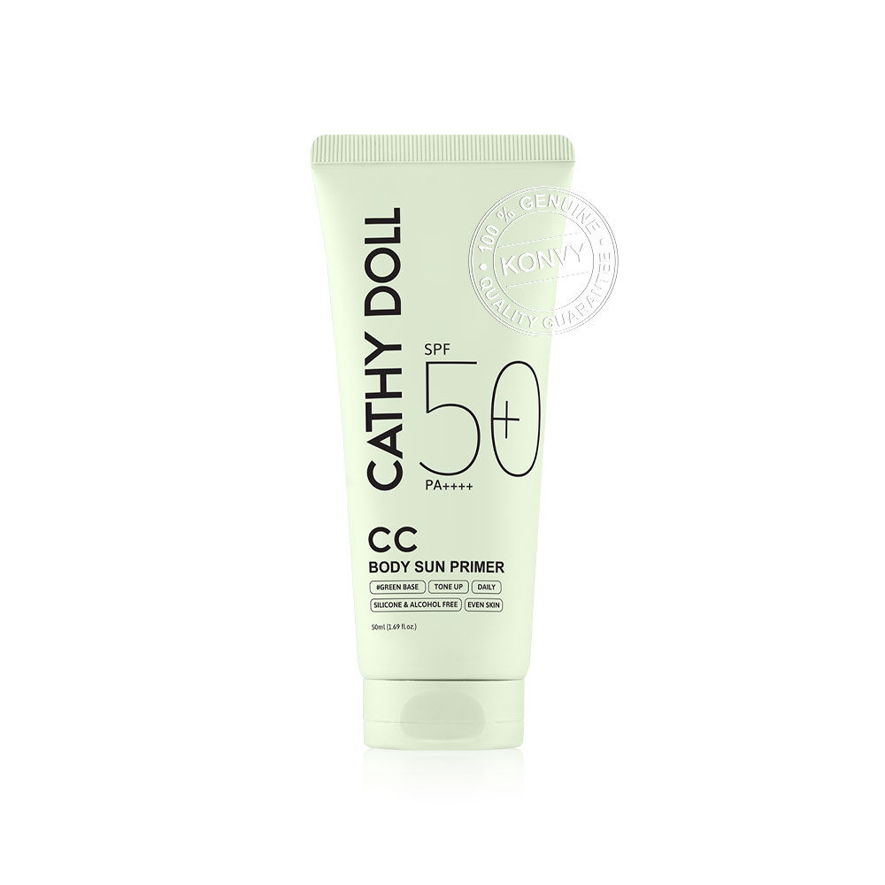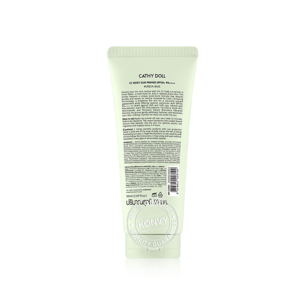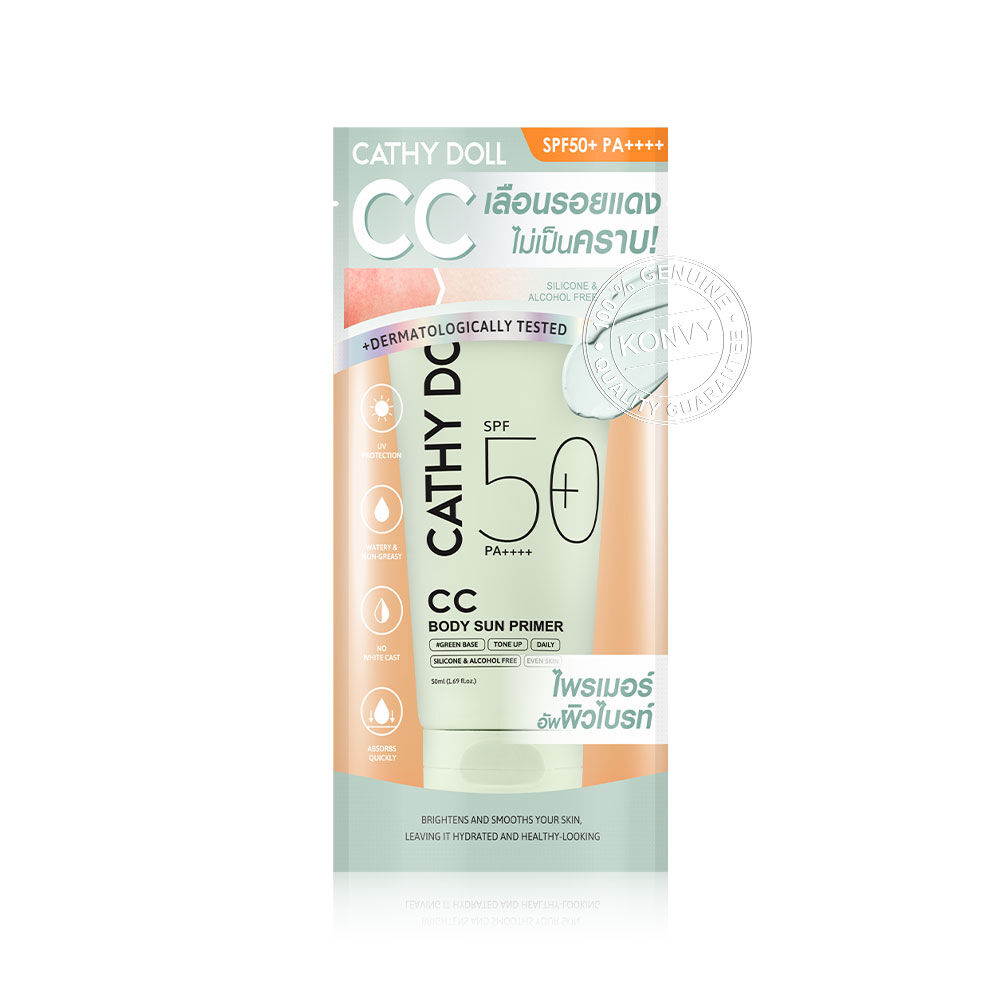 Cathy Doll CC Body Sun Primer SPF50+ PA++++ 50ml #Green Base กันแดดไพรเมอร์สำหรับผิวกาย เนื้อบางเบา ซึมซาบเร็ว ไม่ทิ้งคราบ มาพร้อมเทคโนโลยี Color Correcting ช่วยปรับสีผิวให้ดูกระจ่างใสอย่างเป็นธรรมชาติ พร้อมปกป้องผิวจากแสงแดดด้วย SPF50+ PA++++ ปกป้องผิวจากรังสี UVA และ UVB ผสานสารสกัดจากน้ำมันเมล็ดแมคคาเดเมีย, ไนอะซินาไมด์ และสารสกัดจากพอร์ทูลาคา ช่วยผลัดเซลล์ผิวอย่างอ่อนโยน บำรุงผิวให้ชุ่มชื้นและกระจ่างใส ปกป้องผิวจากแสงแดดที่เกิดขึ้นในระหว่างวัน