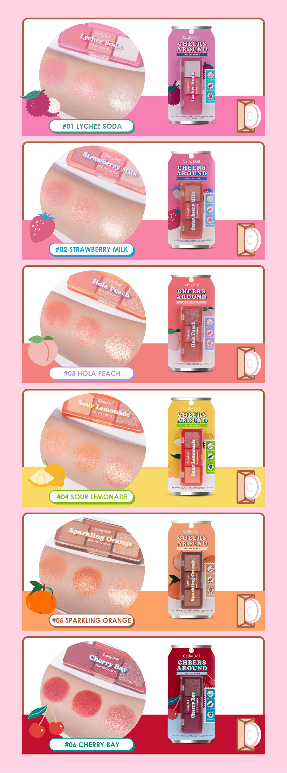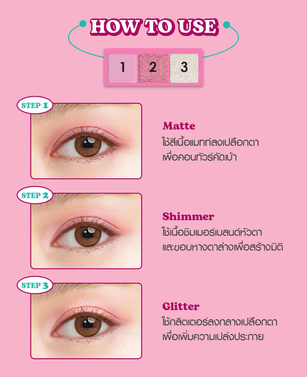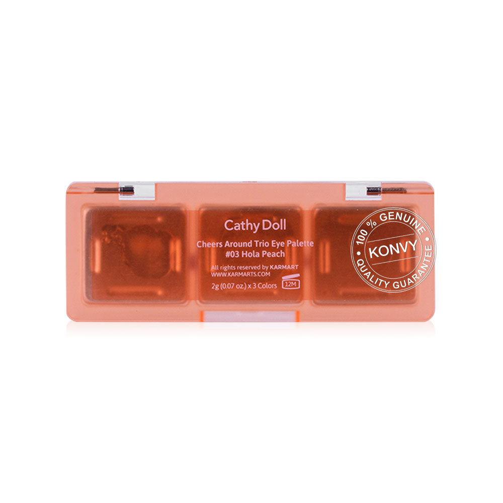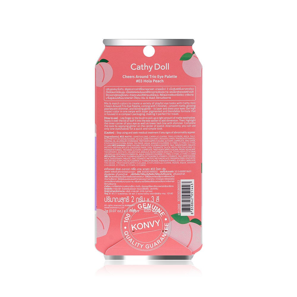 Cathy Doll Cheers Around Trio Eye Palette [2g x 3Colors] #03 Hola Peach ปรับลุคสนุกไป กับพาเลทอายแชโดว์ 3 เนื้อสัมผัสในพาเลทเดียว ทั้งเนื้อแมทเนียนนุ่ม เนื้อเพิร์ลผสมชิมเมอร์ให้ดวงตาเปล่งประกาย และเนื้อกลิตเตอร์สร้างมิติให้ดวงตาคู่สวยดูโดดเด่น ด้วยคุณสมบัติพิกเมนต์เนื้อแน่น สีชัดแม้ปาดเพียงครั้งเดียว เกลี่ยง่าย มาในรูปแบบตลับขนาดพกพา ให้คุณ Mix & Match ได้ตามต้องการ