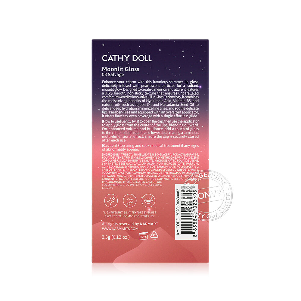 Cathy Doll Moonlit Gloss 3.5g #08 Salvage ลิปกลอสผสมชิมเมอร์ประกายมุก เนื้อสัมผัสลื่น เกลี่ยง่าย สบายปาก ด้วยนวัตกรรม Oil In Gloss ช่วยล็อคความชุ่มชื้นยาวนาน ผสาน Hyaluron, Jojoba Oil, Macadamia Seed Oil และ Vitamin B5 ช่วยเติมเต็มและลดเลือนร่องริมฝีปาก และปลอบประโลมริมฝีปาก มอบสีสวยฉ่ำวาว สร้างมิติให้ดูเปล่งประกายราวอาบแสงจันทร์