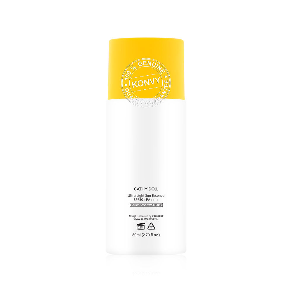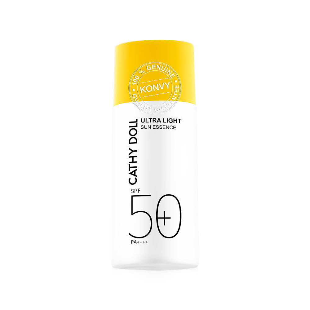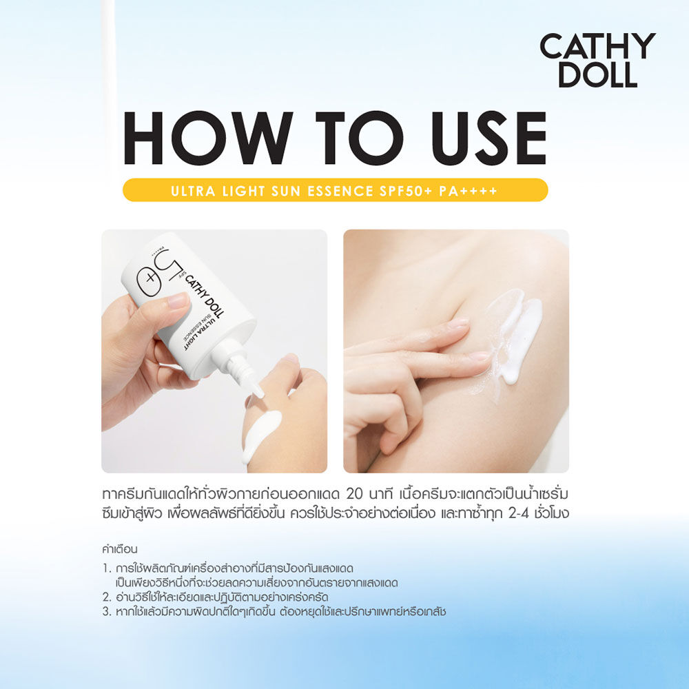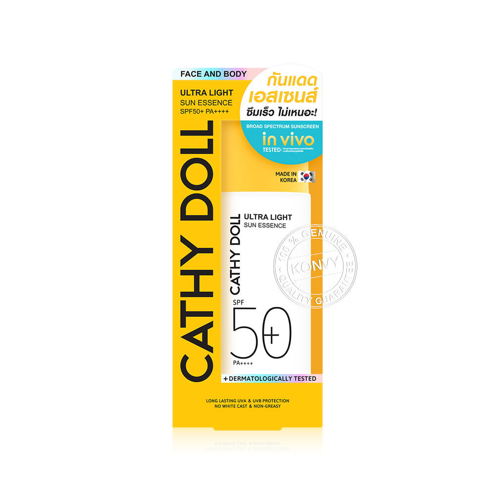 Cathy Doll Ultra Light Sun Essence SPF50+ PA++++ 80ml กันแดดเนื้อเอสเซนส์แบบ Hybrid สัมผัสบางเบาสำหรับผิวหน้าและผิวกาย เกลี่ยง่าย อ่อนโยนต่อผิว ไม่เหนียวเหนอะหนะ พร้อมเกราะป้องกันผิวที่แข็งแกร่ง ด้วยสารกันแดดถึง 6 ชนิด ผ่านการทดสอบด้วยวิธี in-vivo แล้วว่าช่วยปกป้องผิวจากแสงแดดทั้ง UVA และ UVB เติมความชุ่มชื้น ให้ผิวสุขภาพดี ด้วย Niacinamide, Ceramide NP และ Hyaluron และเป็นมิตรต่อสิ่งแวดล้อม