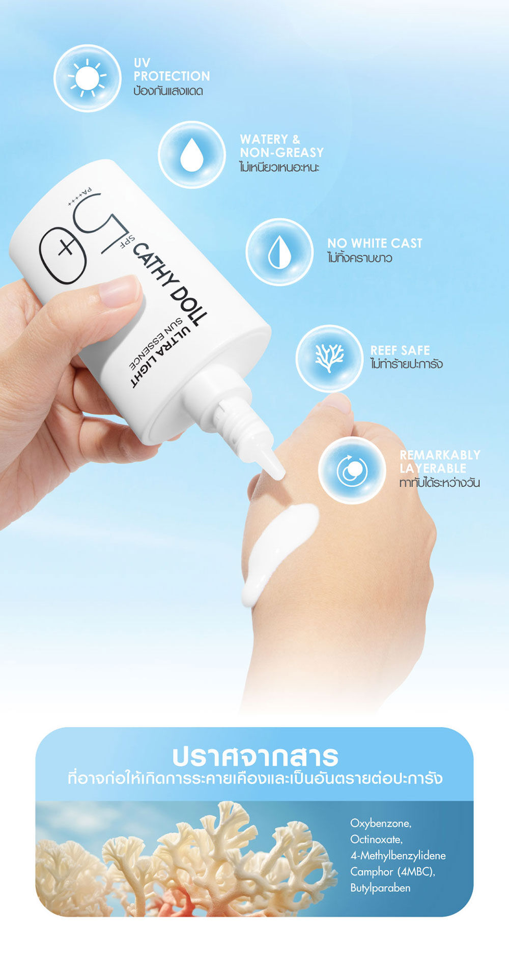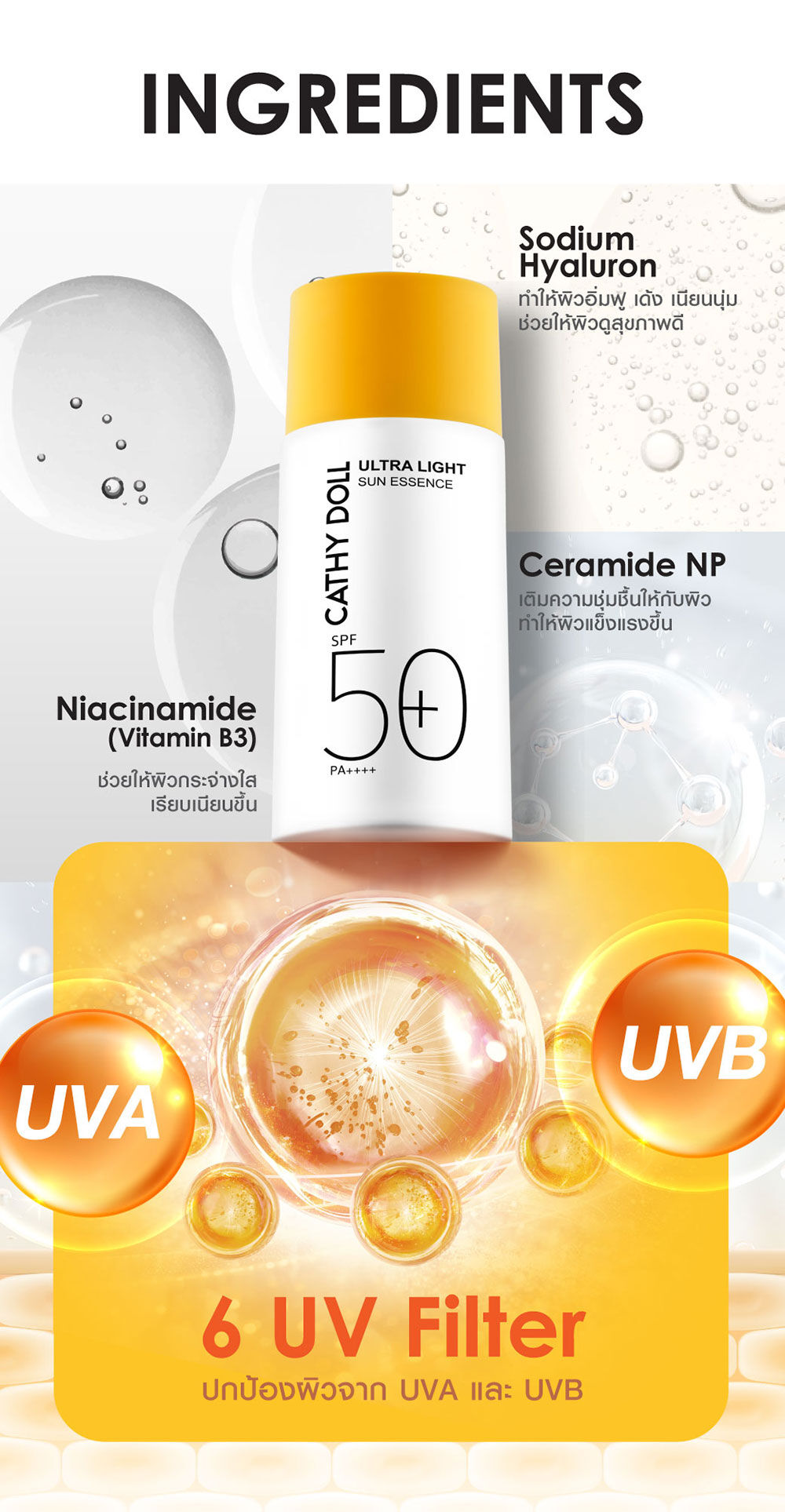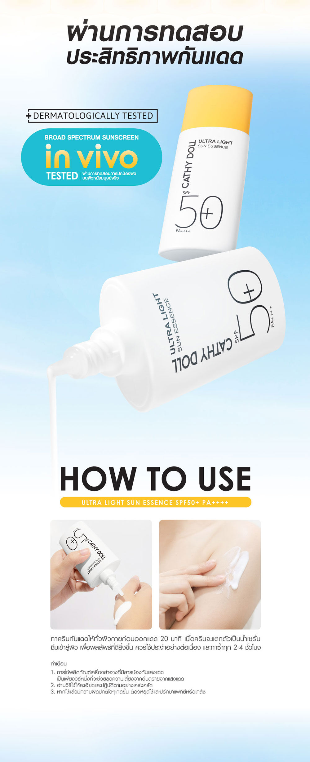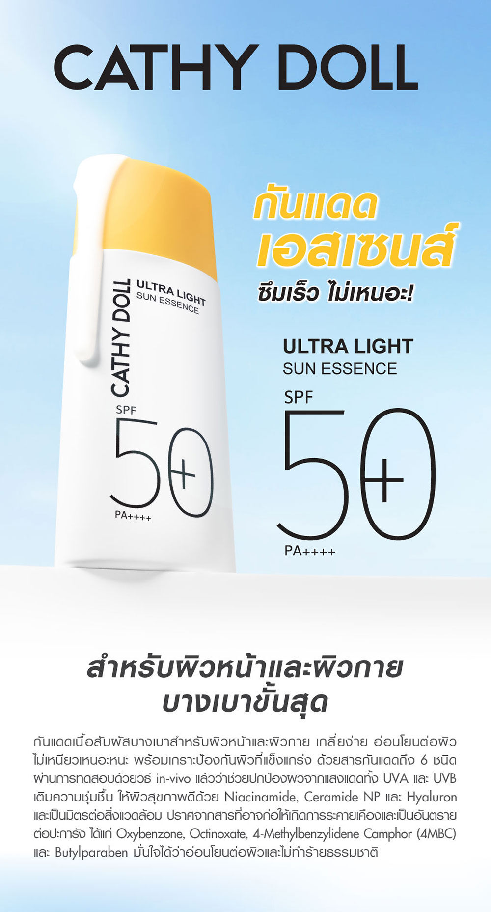 Cathy Doll Ultra Light Sun Essence SPF50+ PA++++ 80ml กันแดดเนื้อเอสเซนส์แบบ Hybrid สัมผัสบางเบาสำหรับผิวหน้าและผิวกาย เกลี่ยง่าย อ่อนโยนต่อผิว ไม่เหนียวเหนอะหนะ พร้อมเกราะป้องกันผิวที่แข็งแกร่ง ด้วยสารกันแดดถึง 6 ชนิด ผ่านการทดสอบด้วยวิธี in-vivo แล้วว่าช่วยปกป้องผิวจากแสงแดดทั้ง UVA และ UVB เติมความชุ่มชื้น ให้ผิวสุขภาพดี ด้วย Niacinamide, Ceramide NP และ Hyaluron และเป็นมิตรต่อสิ่งแวดล้อม