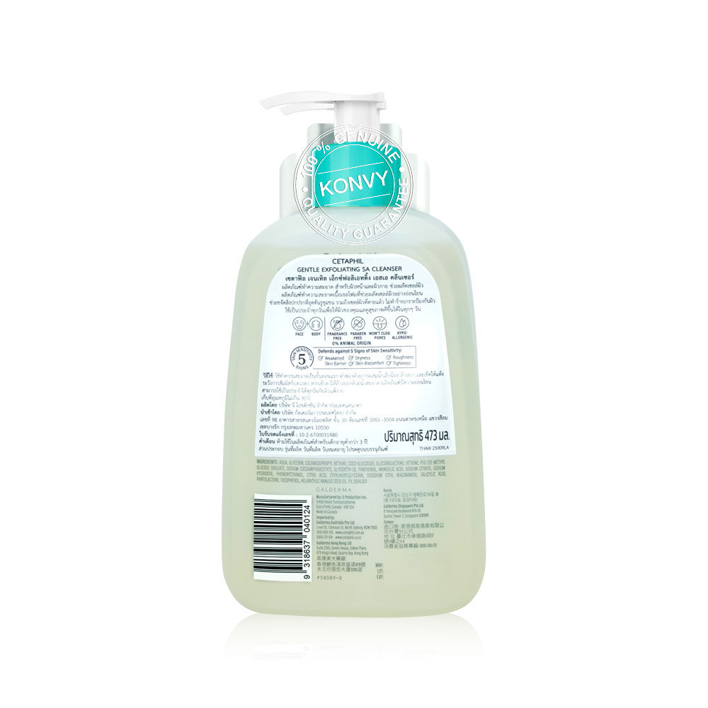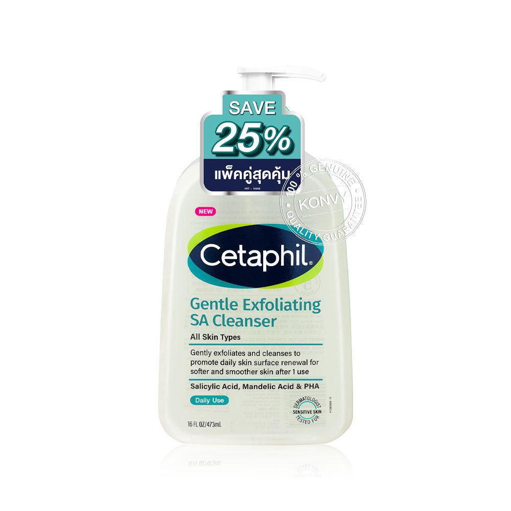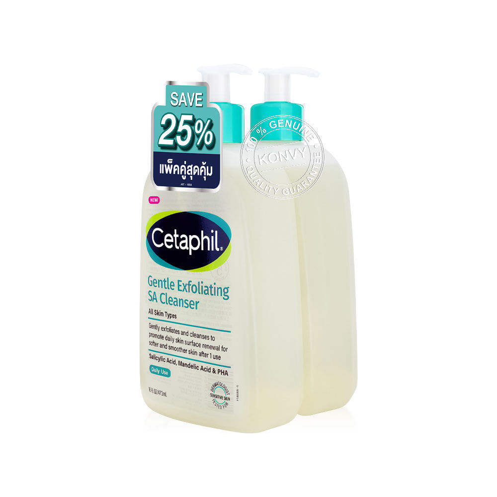 Cetaphil Gentle Exfoliating SA Cleanser [473ml x 2pcs] คลีนเซอร์ผลัดเซลล์ผิวสำหรับผิวแพ้ง่าย เนื้อ Gel-Foaming ด้วยส่วนผสมอันเป็นเอกลักษณ์ของ Triple Acid Blend ที่ประกอบด้วยกรด 3 ชนิด คือ Salicylic Acid (SA/BHA), AHA และ PHA ช่วยผลัดเซลล์ผิวอย่างอ่อนโยน ลดเลือนรอยดำจากสิว และปรับสีผิวให้สม่ำเสมอ แลดูกระจ่างใส ผสาน Niacinamide, Panthenol และ Glycerin ช่วยเติมความชุ่มชื้น กระชับรูขุมขน และเสริมเกราะป้องกันผิวให้แข็งแรง มอบผิวสะอาด เนียนใส ดูสุขภาพดี