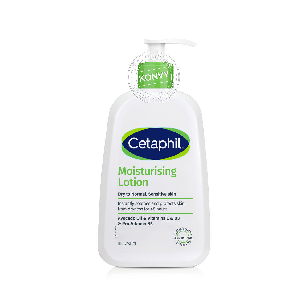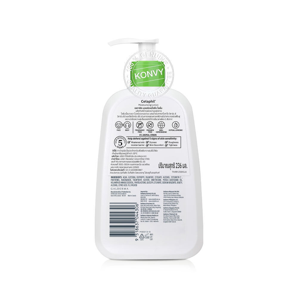Cetaphil Moisturising Lotion 236ml โลชั่นบำรุงผิวหน้าและผิวกาย เหมาะสำหรับผิวแห้ง ผิวธรรมดา และผิวบอบบางแพ้ง่าย สูตรผสานวิตามินบี 3, โปรวิตามินบี 5, กลีเซอรีน และคุณค่าจาก Avocado Oil คืนความแข็งแรงให้กับผิวบอบบาง แพ้ง่าย เพื่อป้องกัน 5 สัญญาณผิวแพ้ง่าย อันได้แก่ เกราะป้องกันผิวอ่อนแอ, ผิวแห้ง ขาดความชุ่มชื่น, ผิวไม่เรียบเนียน, ผิวระคายเคืองง่าย และผิวแน่นตึงไม่สบายผิว เหมาะสำหรับใช้เป็นประจำทุกวัน เพื่อการบำรุงผิวอย่างต่อเนื่อง และสามารถใช้ได้กับทุกส่วนของร่างกาย