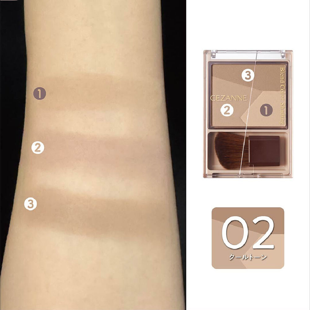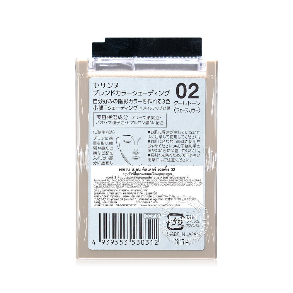 Cezanne Blend Color Shading 5g #02 Cool Tone คอนทัวร์พาเลท 3 เฉดสี เนื้อสัมผัสเนียนนุ่ม เกลี่ยง่าย ไล่เฉดสีอ่อน-เข้ม ด้วยเทคโนโลยี Blend Color Shading ช่วยสร้างมิติบนใบหน้าได้อย่างง่ายดาย พร้อมมีเอฟเฟกต์ที่ช่วยปรับสีผิวให้เรียบเนียน ผสานส่วนผสมจากน้ำมันมะกอก, น้ำมันเมล็ดเบาบับ และ Sodium Hyaluronate ช่วยเติมความชุ่มชื้นให้ผิว มอบฟินิชลุคดูโดดเด่นเป็นธรรมชาติ