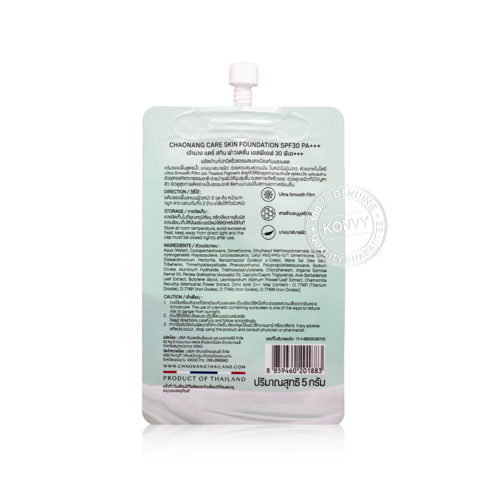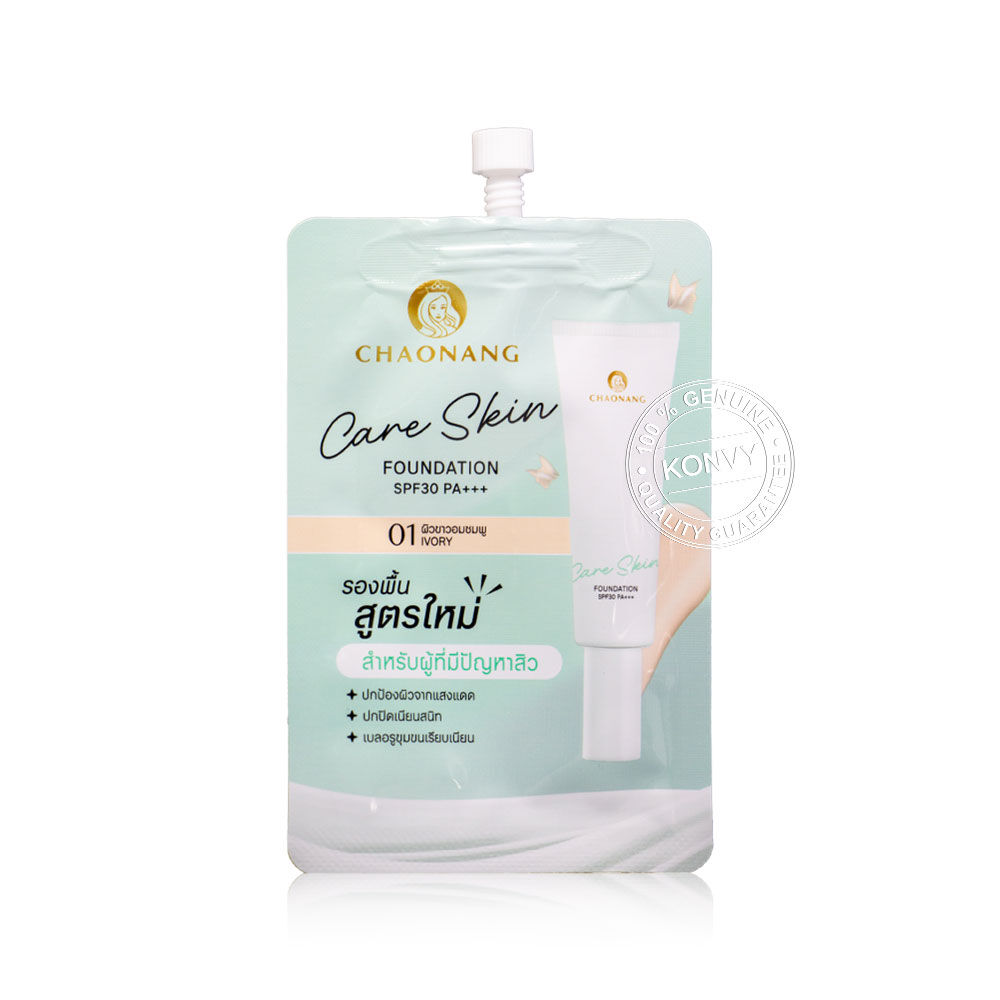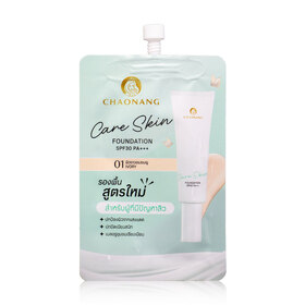 Chaonang Care Skin Foundation SPF30 PA+++ 5g #01 Ivory รองพื้นสูตรน้ำ เนื้อบางเบาสบายผิว เกลี่ยง่าย ควบคุมความมัน ติดทนนาน ด้วยเทคโนโลยี Ultra Smooth Film และ Treated Pigment ช่วยเบลอผิว และปรับผิวให้แลดูกระจ่างใส ผสานสารสกัดจากธรรมชาติ อันได้แก่ Edelweiss Extract, Chamomile Extract และ Aloe Vera Extract ช่วยปลอบประโลมและเติมความชุ่มชื้นให้ผิว พร้อมดูแลผิวที่มีปัญหาสิว เผยผิวเรียบเนียน เป็นธรรมชาติ ดูสุขภาพดี