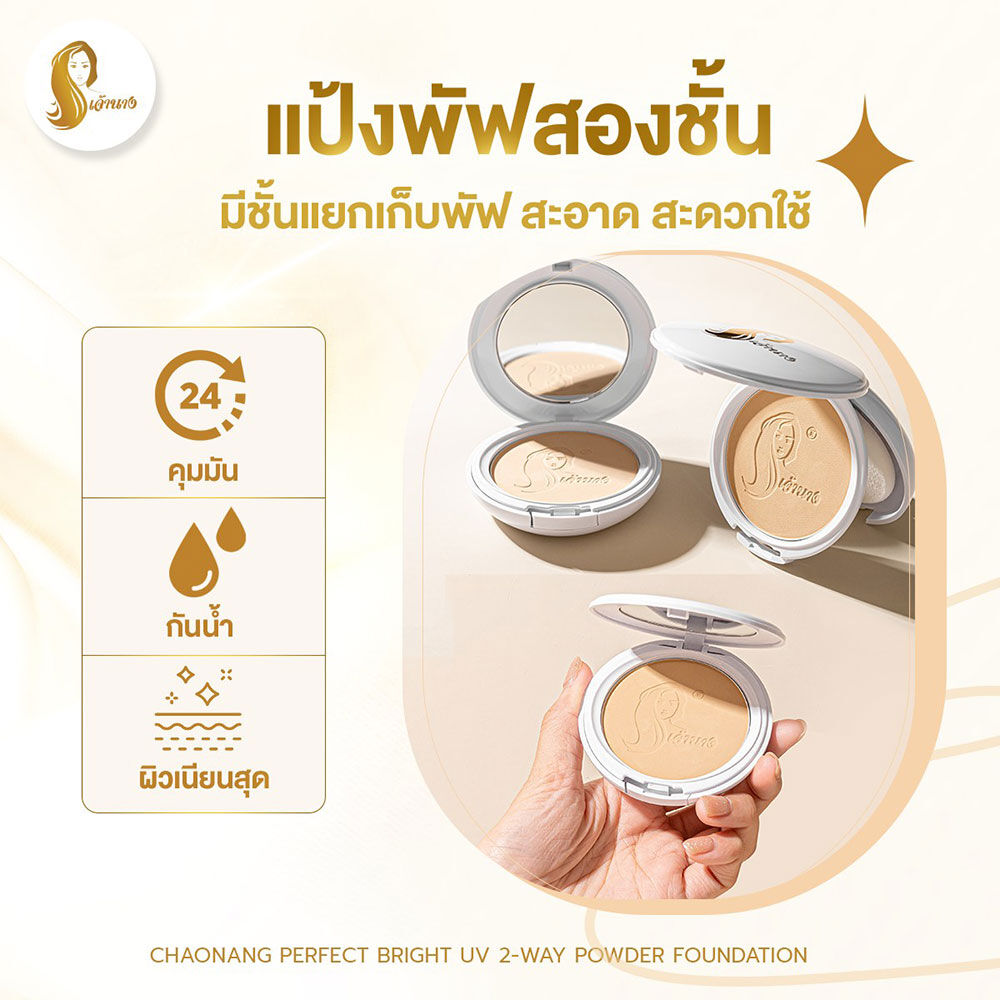 Chaonang Perfect Bright UV 2-way Powder Foundation #02 แป้งผสมรองพื้นสูตรพิเศษ เน้นการปกปิดที่เนียนกริบอย่างไร้ที่ติ มีคุณสมบัติกันน้ำ กันเหงื่อติดทนนานและไม่เป็นคราบ สีแป้งไม่เปลี่ยนไม่หมองคล้ำระหว่างวัน พร้อมปกป้องผิวคุณจาก UVAเเละUVB ด้วยค่า SPF20/PA+++