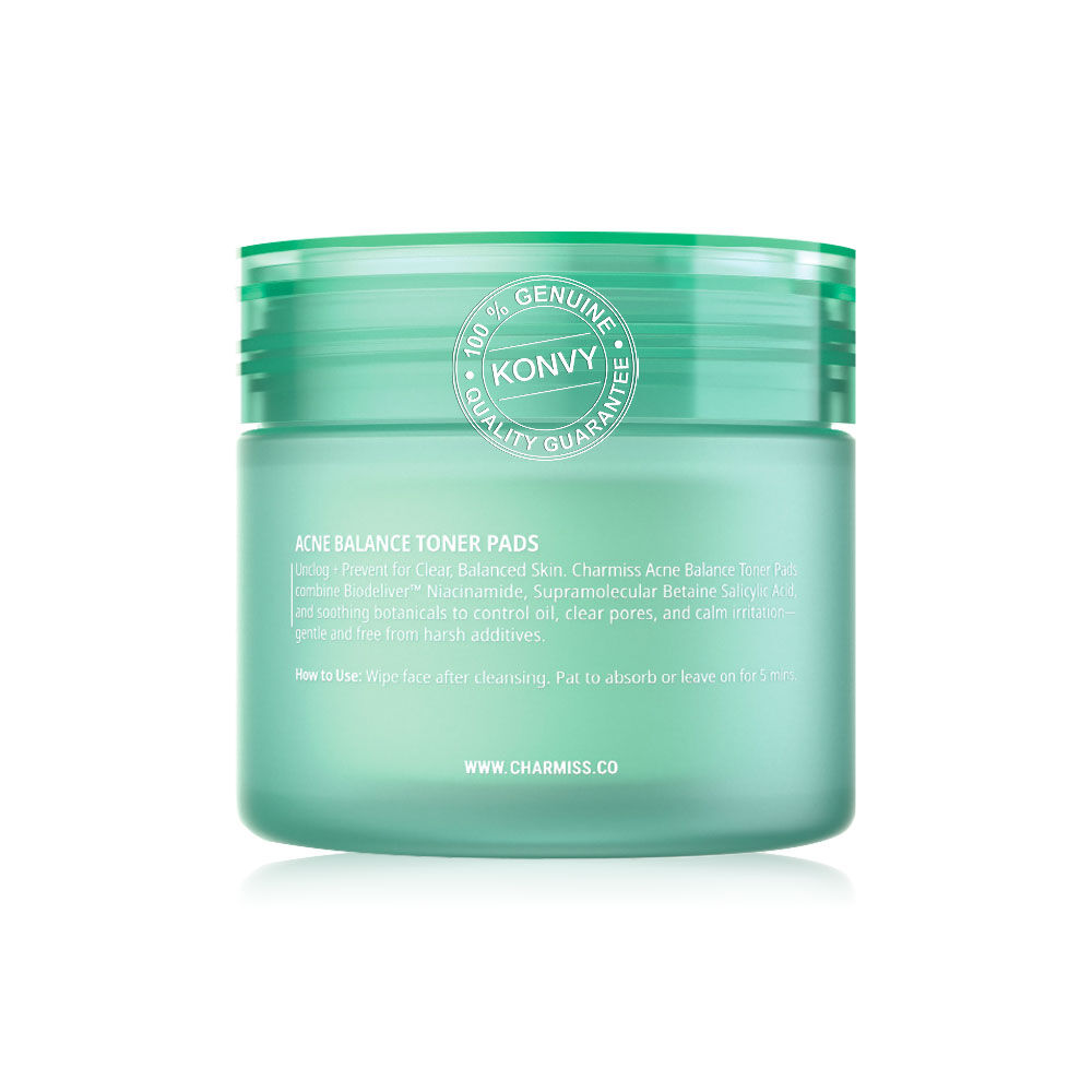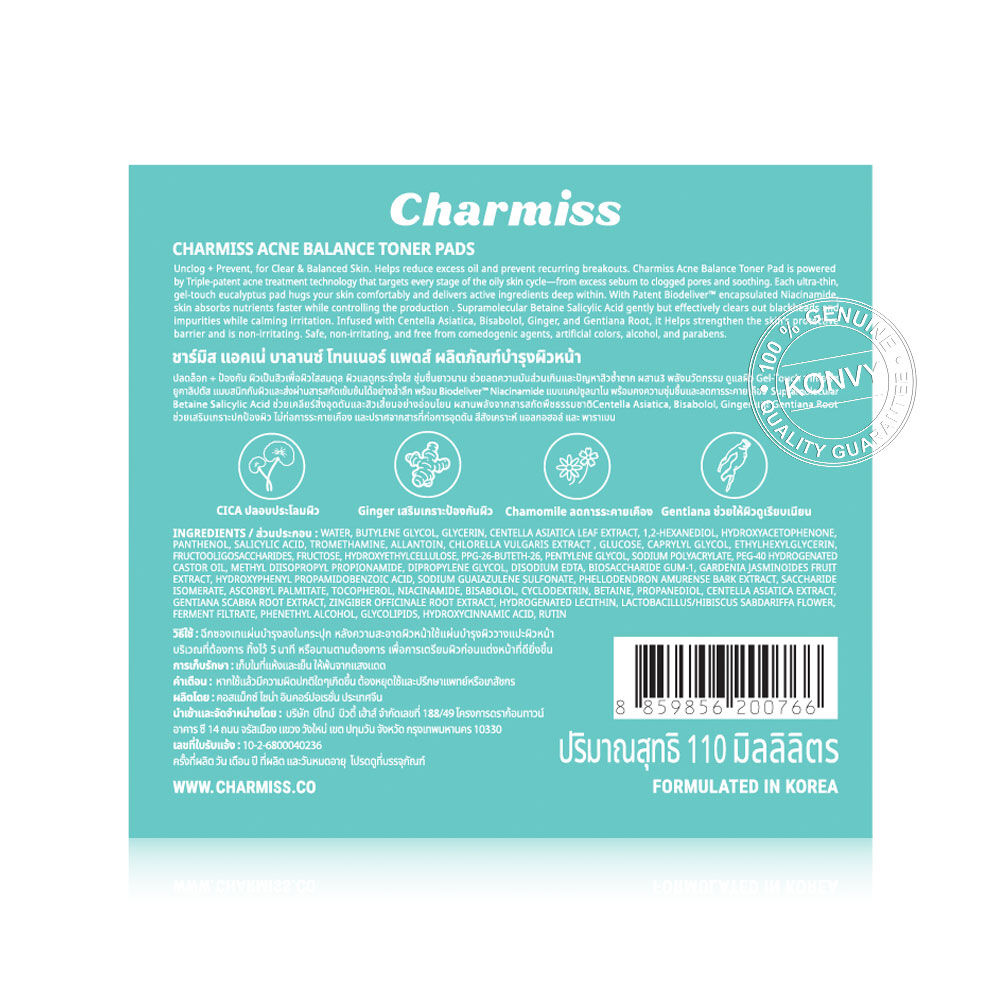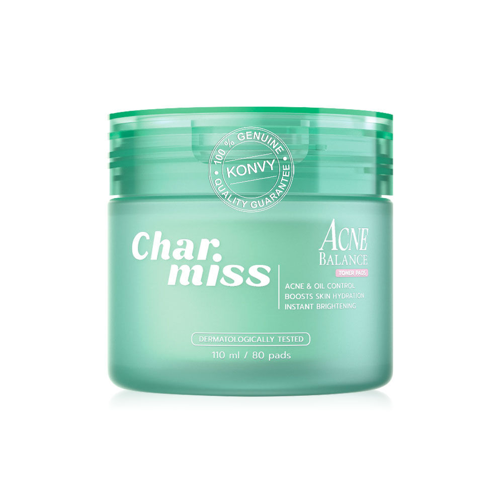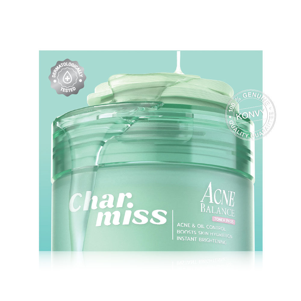 Charmiss Acne Balance Toner Pads 110ml โทนเนอร์แพด แผ่นบางเฉียบแบบ Gel-Touch จากใยพืชยูคาลิปตัส แนบสนิทกับผิว จึงช่วยส่งผ่านสารสกัดเข้มข้นได้อย่างล้ำลึกยิ่งขึ้น ผสานพลังนวัตกรรมดูแลสิวจาก Supramolecular Betaine Salicylic Acid ช่วยทำความสะอาดสิ่งสกปรกอุดตัน และสิวเสี้ยนอย่างอ่อนโยน ควบคุมความมันส่วนเกิน คงความชุ่มชื้นให้ผิว พร้อมมีสารสกัดพืชธรรมชาติ ได้แก่ Centella Asiatica, Bisabolol, Ginger และ Gentiana Root ช่วยปลอบประโลมผิว ลดรอยแดง ฟื้นสมดุลผิว และเสริมเกราะปกป้องผิวให้แข็งแรง เพื่อผิวเนียนใส สุขภาพดี