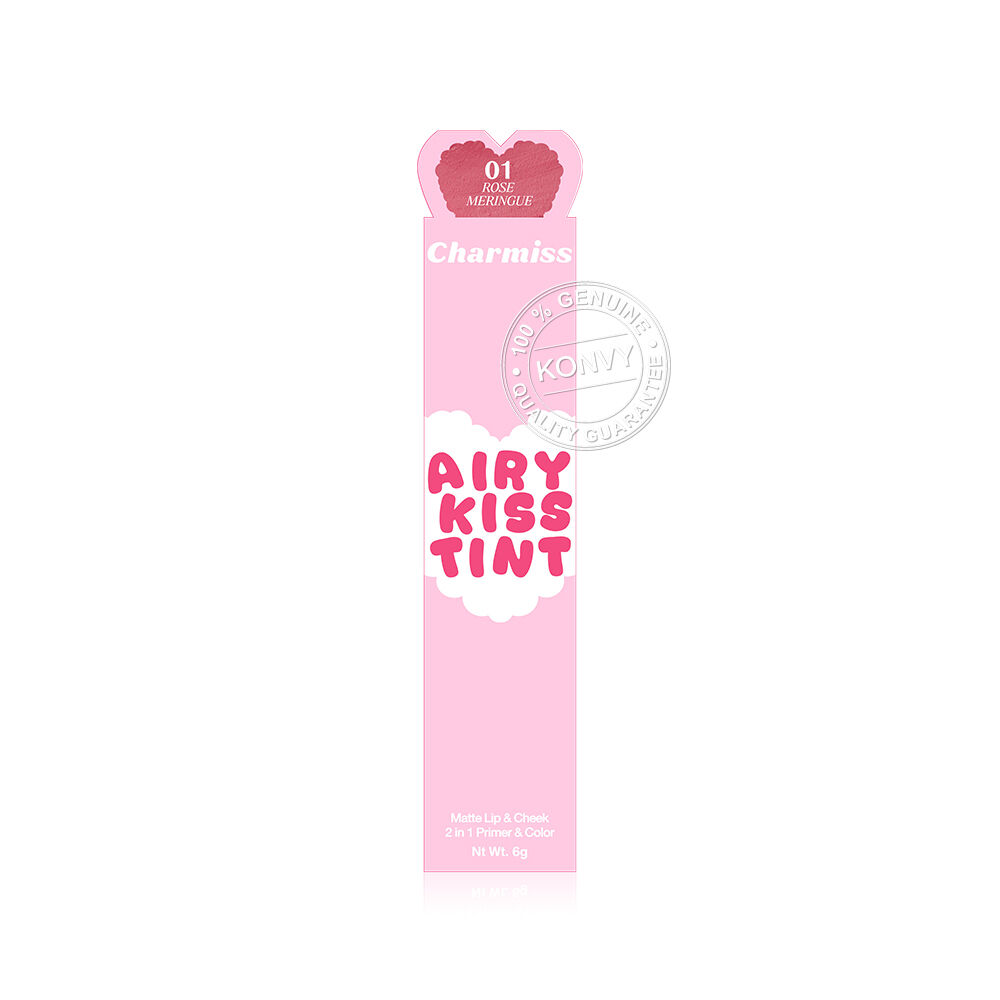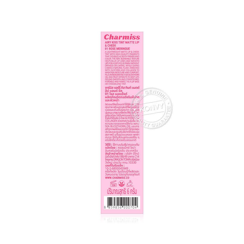 Charmiss Airy Kiss Tint Matte Lip & Cheek 6g #01 Rose Meringue ลิปแอนด์ชีคเนื้อแมท ให้สีชัดจากเม็ดสีคุณภาพ พร้อมคุณสมบัติไพร์เมอร์ ช่วยเบลอและเติมเต็มร่องปาก เนื้อสัมผัสนุ่มละมุน บางเบา เกลี่ยง่าย ให้ผิวริมฝีปากดูเรียบเนียน ไม่เป็นคราบและไม่ตกร่อง โดยไม่ทำให้แห้ง มี ด้วย Glycerin และ Collagen ช่วยคงความชุ่มชื้นและความสบายตลอดการใช้งาน ผสาน Sea Buckthorn Oil และสารสกัดจากผลไม้และดอกไม้ ที่ช่วยปลอบประโลมและดูแลริมฝีปากให้เนียนนุ่ม สุขภาพดี มาในรูปแบบหลอด พกพาสะดวก ใช้เป็นลิปเบสก่อนลงสีอื่นๆ หรือใช้เดี่ยวก็สวยเป็นธรรมชาติ