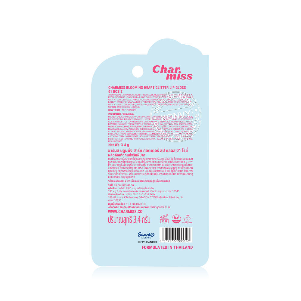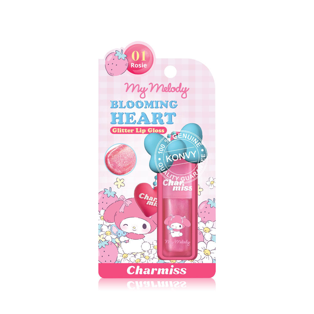 Charmiss Blooming Heart Glitter Lip Gloss 3.4g #01 Rosie ต้นตำรับกลอสเนื้อบางเบา ไม่เหนียวเหนอะหนะ ผสมกลิตเตอร์เพิ่มประกาย ให้ริมฝีปากดูอิ่มฉ่ำ มาพร้อมหัวแปรงพุ่ม ขนาดพอดีปาก เผยเรียวปากสวยอวบอิ่มไม่ต้องง้อฟิลเลอร์ ด้วยพลังบำรุงจาก Hyaluronic Filling Sphere และสารสกัดเบอร์รี่สีชมพู ช่วยให้ริมฝีปากดูอมชมพู สุขภาพดีอย่างเป็นธรรมชาติ มีอนุพันธ์ของวิตามินซี และโจโจ้บาออยล์ ช่วยบำรุงริมฝีปากที่แห้งกร้าน พร้อมมอบความรู้สึกเนียนนุ่ม เสริมด้วยเปปไทด์ เพื่อริมฝีปากที่ดูเนียนกระชับ อิ่มฟูสุขภาพดี มาพร้อมเคสลิป และพวงกุญแจ My Melody สุดคิ้วท์