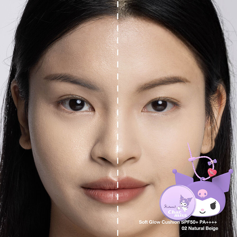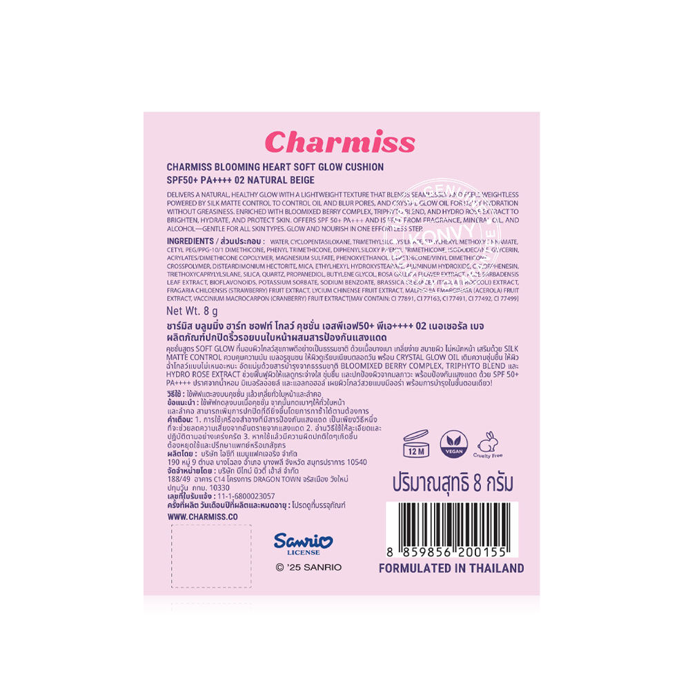 Charmiss Blooming Heart Soft Glow Cushion SPF50+ PA++++ 8g #02 Natural Beige คุชชั่นเคสคุโรมิสูตร Soft Glow ที่มอบผิวโกลว์สุขภาพดีอย่างเป็นธรรมชาติ ด้วยเนื้อบางเบา เกลี่ยง่าย สบายผิว ไม่หนักหน้า เสริมด้วย Silk Matte Control ควบคุมความมัน เบลอรูขุมขน ให้ผิวดูเรียบเนียบตลอดวัน พร้อม Crystal Glow Oil เติมความชุ่มชื้น ให้ผิวฉ่ำโกลว์แบบไม่เหนอะหนะ อัดแน่นด้วยสารบำรุงจากธรรมชาติ Bloomixed Berry Complex, Triphyto Blend และ Hydro Rose Extract ช่วยฟื้นฟูผิวให้แลดูกระจ่างใส ชุ่มชื้น และปกป้องผิว จากมลภาวะ พร้อมป้องกันแสงแดดด้วย SPF50+ PA++++ เผยผิวโกลว์สวยแบบมีออร่า พร้อมการบำรุงในขั้นตอนเดียว มาพร้อมกระเป๋าคุชชั่นในตัว