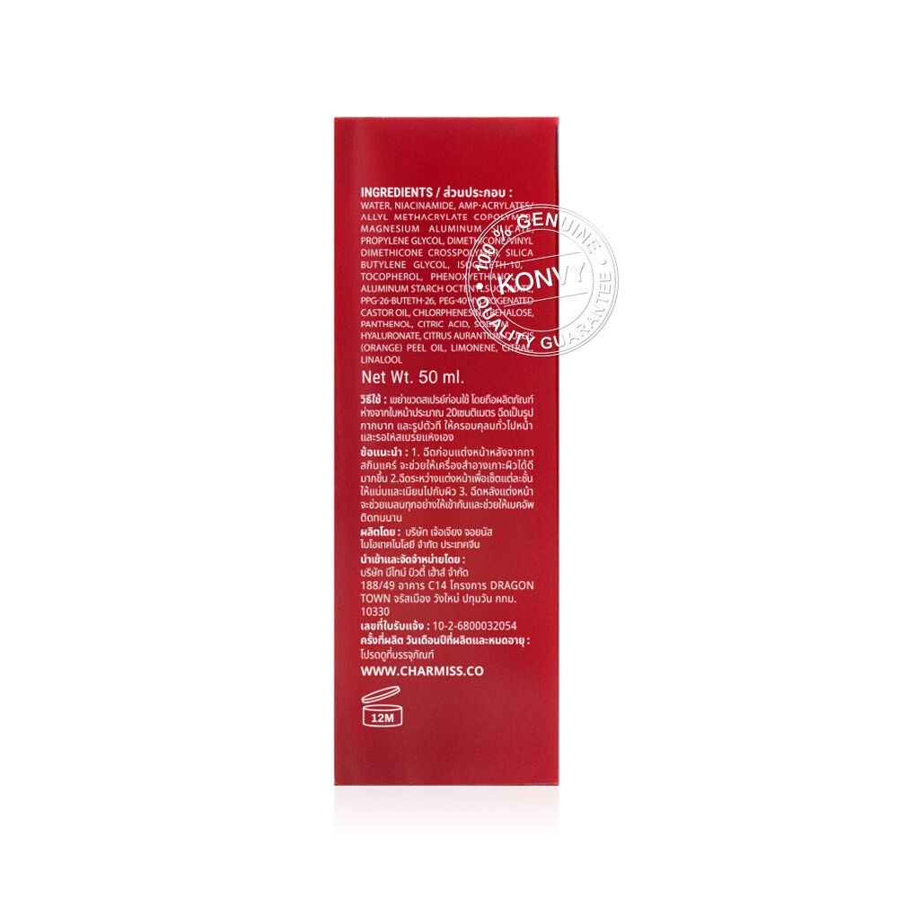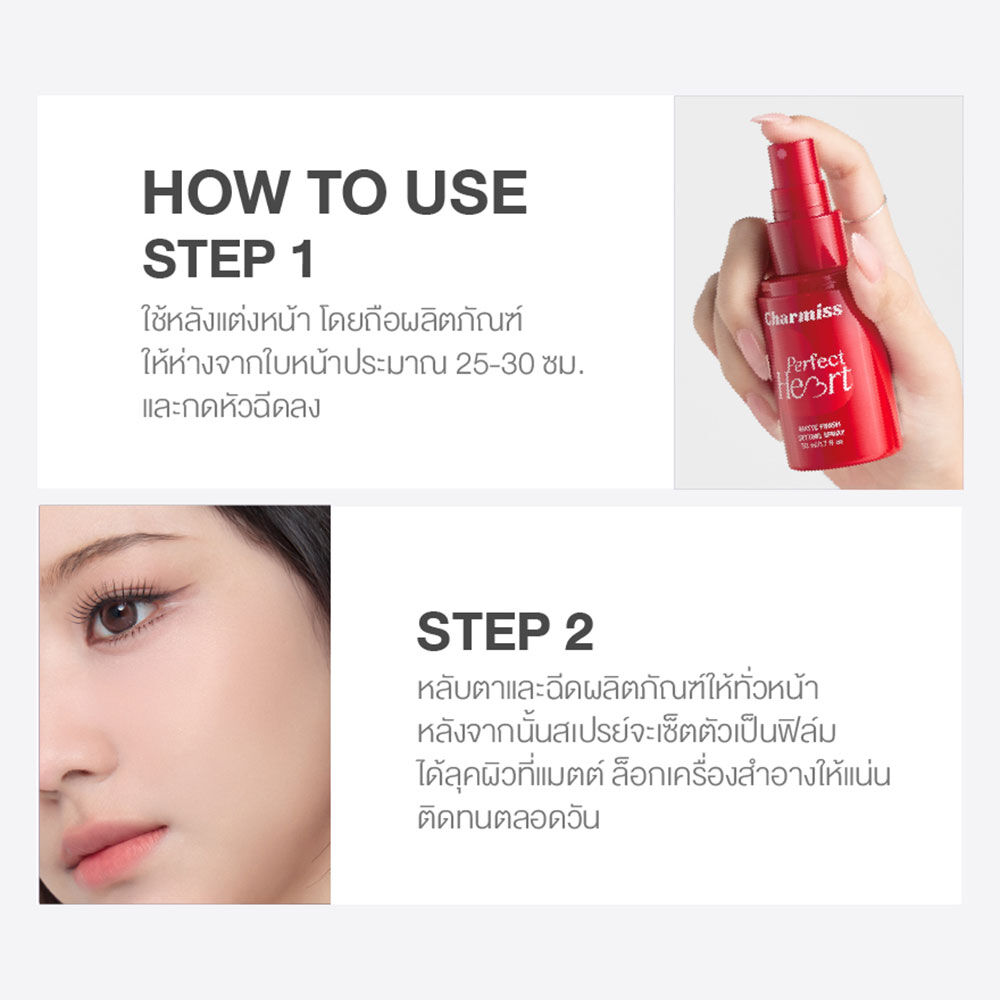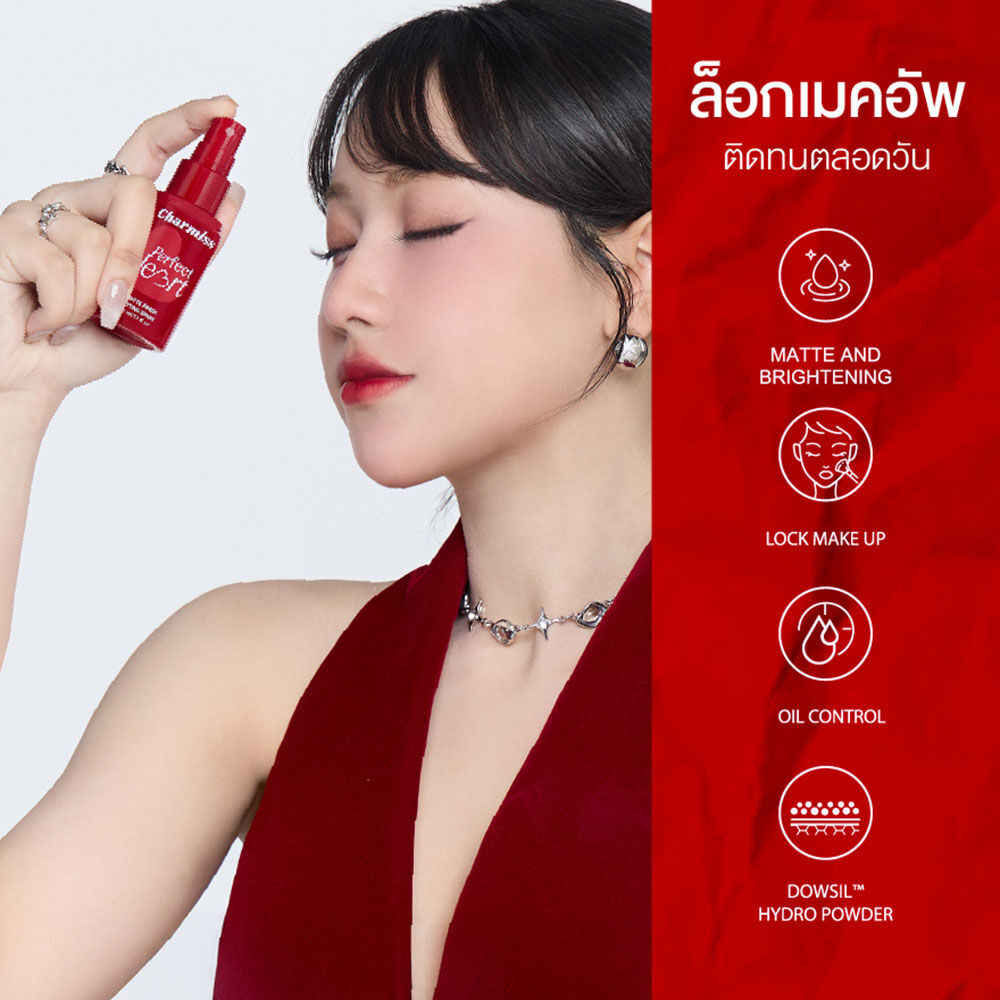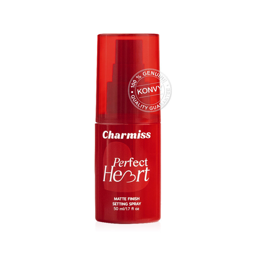 Charmiss Perfect Heart Matte Finish Setting Spray 50ml สเปรย์ล็อคเมคอัพเนื้อบางเบา อุดมด้วย DOWSIL™ Hydro Cosmetic Powder และ Silica ช่วยเบลอรูขุมขนให้เรียบเนียน ผสานพลังจาก Magnesium Aluminum Silicate และ Aluminum Starch Octenylsuccinate ช่วยควบคุมความมันส่วนเกิน ให้ผิวดูสดชื่น ไม่มันเยิ้ม พร้อมมี Niacinamide และ Vitamin E ช่วยปกป้องผิว และปรับผิวให้สม่ำเสมอ แลดูกระจ่างใส มอบฟินิชลุคแมทเนียนสวย มั่นใจตลอดวัน