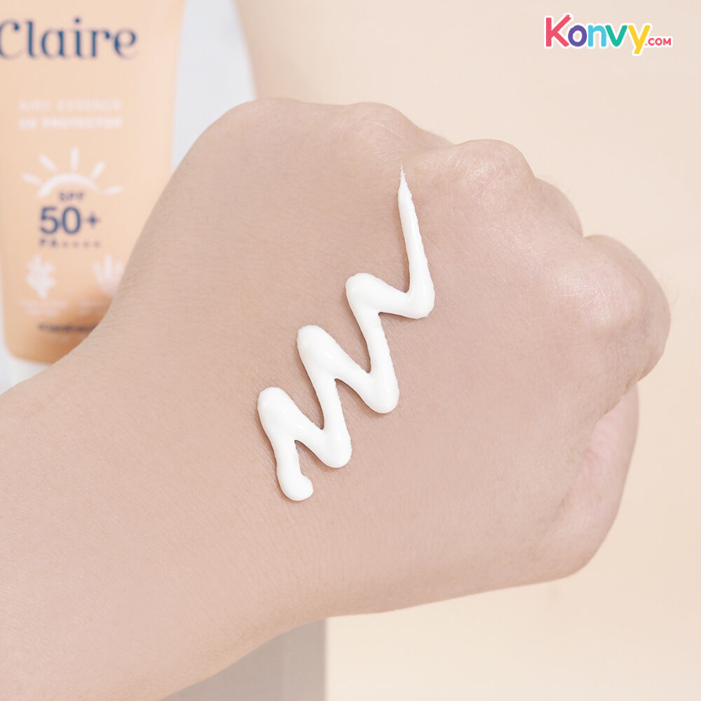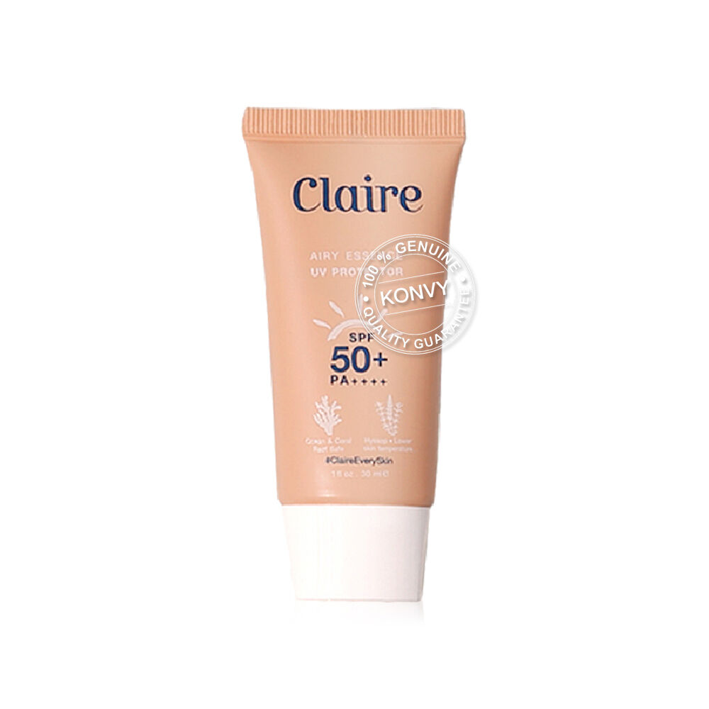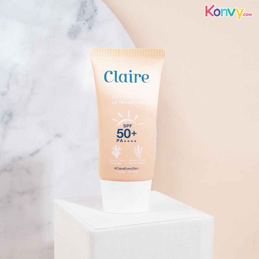 Claire Airy Essence UV Protector SPF50+/PA++++ 30ml ผลิตภัณฑ์กันแดดเนื้อเซรั่ม สูตรลดอุณหภูมิผิว ปกป้องได้ทั้ง UVA, UVB, IR และ Bluelight ด้วย SPF50+/PA++++ เนื้อสัมผัสบางเบา ซึมซาบเข้าสู่ผิวอย่างรวดเร็ว ด้วยคุณสมบัติ Fast absorbing ที่ทำให้ผิวรู้สึกชุ่มชื้นและสดชื่น พร้อมทั้งช่วยล็อคความชุ่มชื้นยาวนานถึง 72 ชั่วโมง และยังช่วยลดความเครียดให้ผิวด้วยสารสกัดจากดอกฮิสซอฟ สามารถใช้ได้ในทุกกิจกรรมไม่ว่าจะเป็นทางน้ำหรือทางบก เป็นมิตรต่อสิ่งแวดล้อม ไม่เป็นอันตรายต่อปะการัง