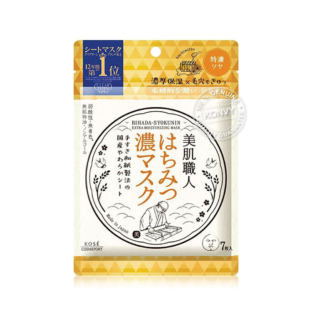 Clear Turn Bihada-Syokunin Honey Extra Moisturizing Mask 95ml [7 Sheets] แผ่นมาสก์หน้าที่ช่วยให้ผิวหน้าเนียนกระจ่างใสชุ่มชื้น มีส่วนผสมของน้ำผึ้งจากธรรมชาติ อ่อนโยนต่อผิว ช่วยจัดการกับบริเวณรูขุมขน ผิวจึงกระชับและสวยเรียบเนียน
