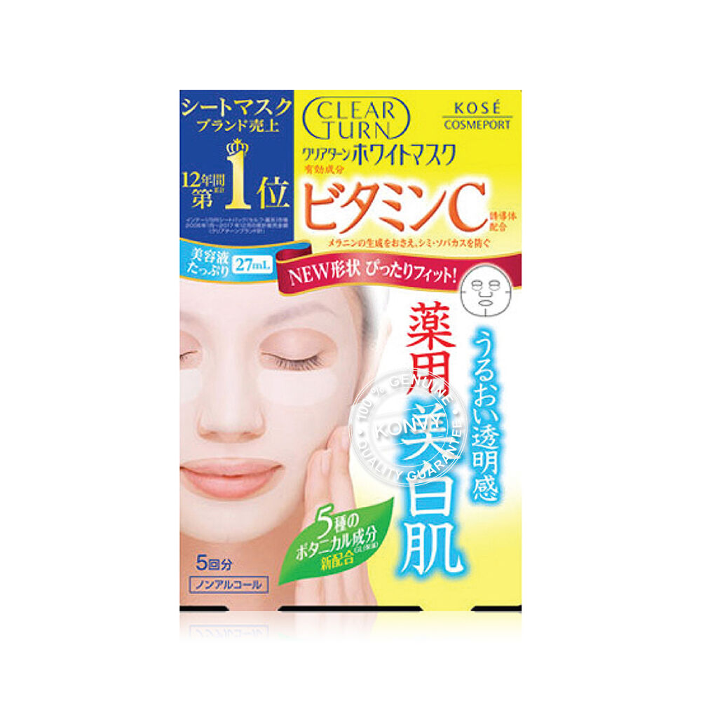 Clear Turn White Mask VC [27ml x 5 Sheets] แผ่นมาสก์หน้าที่มีส่วนผสมของวิตามินซี ปกป้องผิวจากฝ้า และกระ ทำให้ใบหน้าขาวกระจ่างใส ผสานสารสกัดจากพืชพรรณธรรมชาติ 12 ชนิด และน้ำแร่ออนเซน มอบความชุ่มชื่น ให้ผิวแลดูอ่อนเยาว์