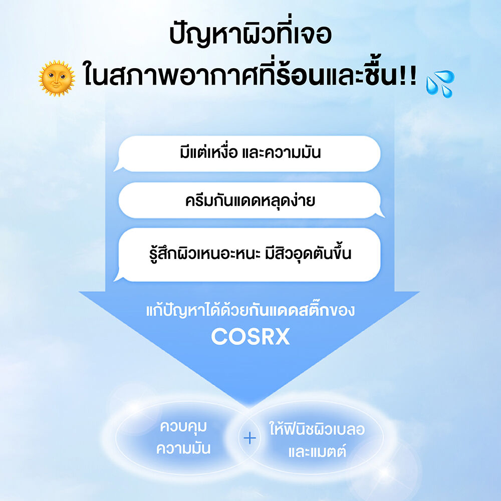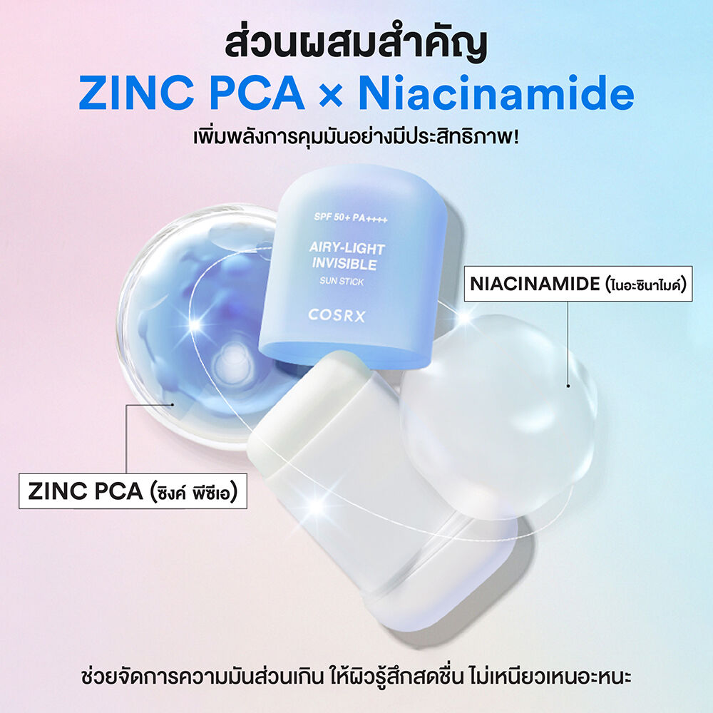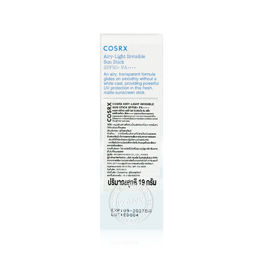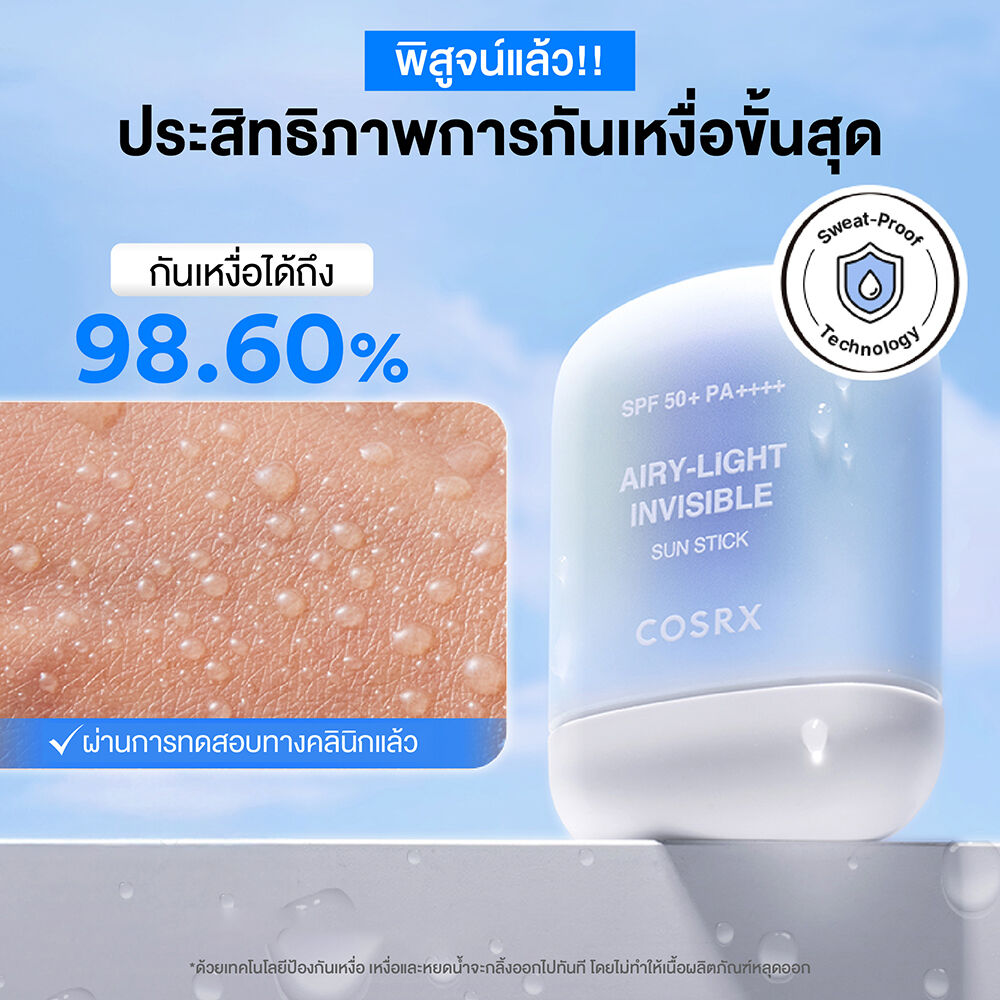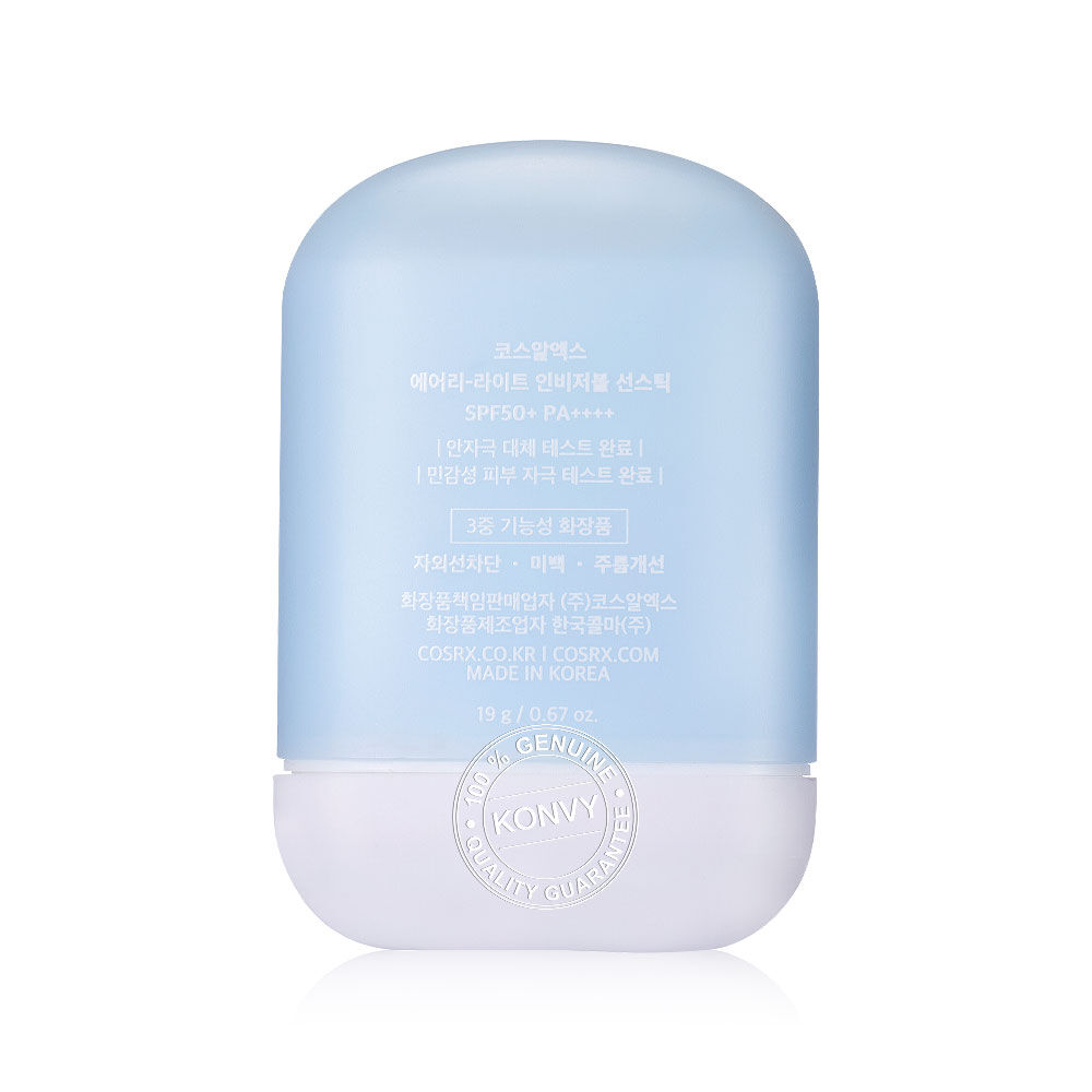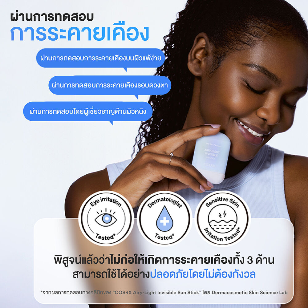 COSRX Airy-Light Invisible Sun Stick SPF50+ PA++++ 19g กันแดดในรูปแบบแท่ง ที่มีเนื้อสัมผัสบางเบา สามารถทาทับเมคอัพได้โดยไม่ทิ้งคราบขาว พร้อมปกป้องผิวจากแสงแดด ให้ฟินิชผิวแบบแมท เพื่อความสบายผิวตลอดวัน