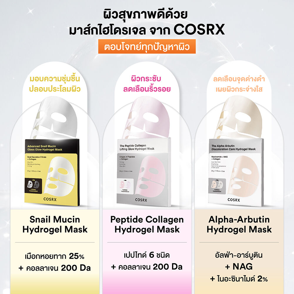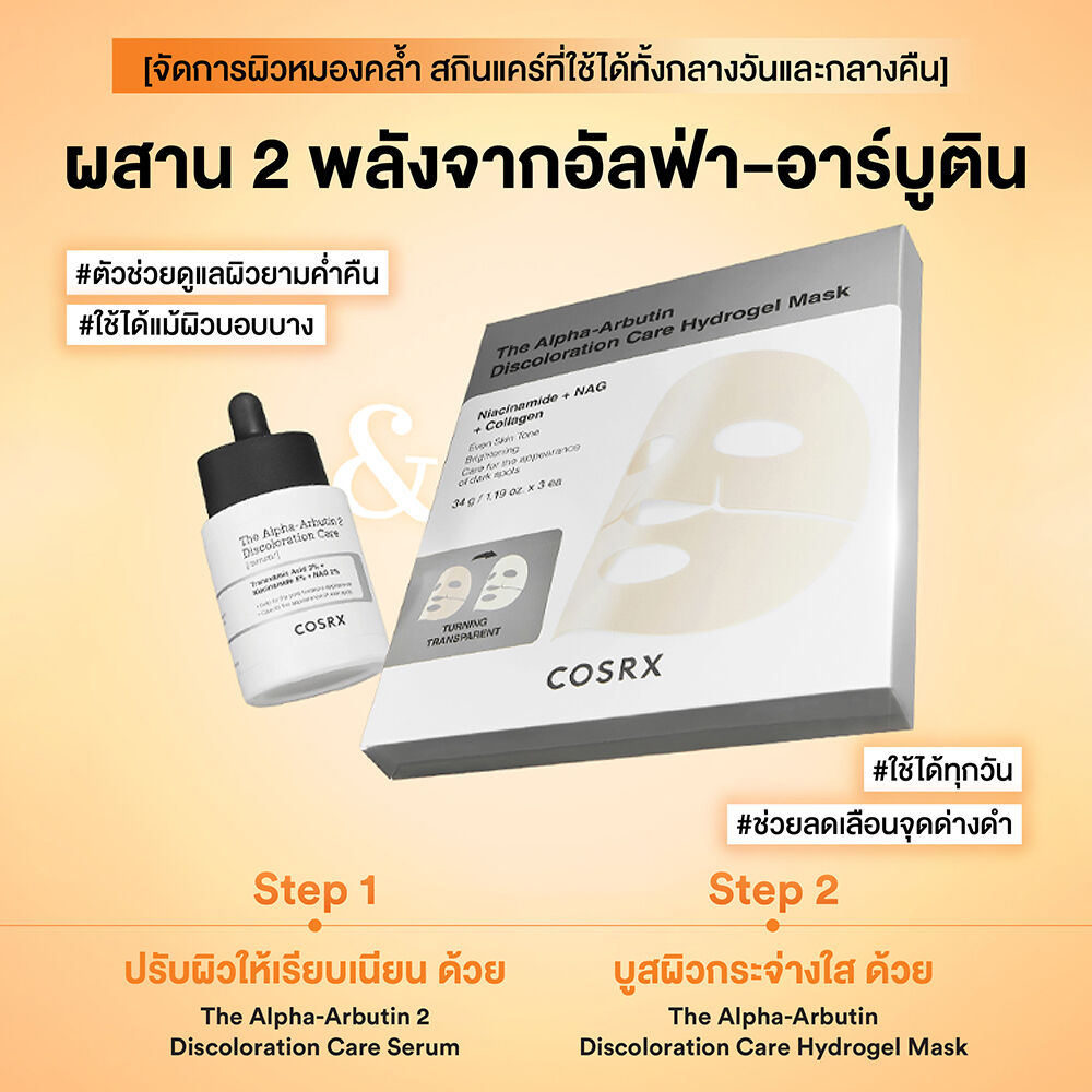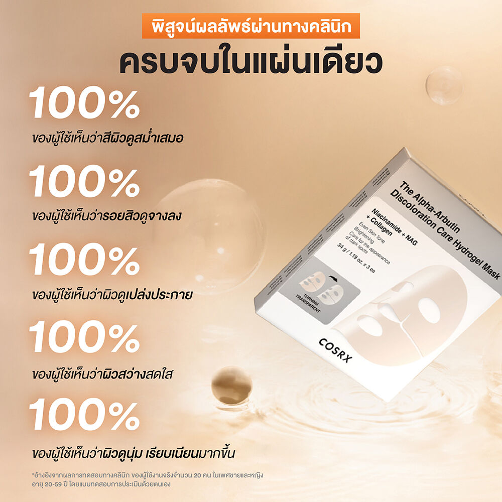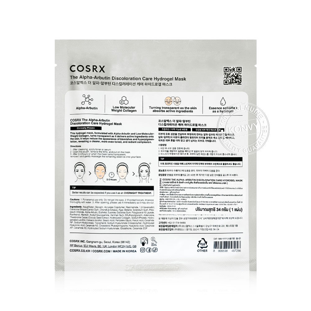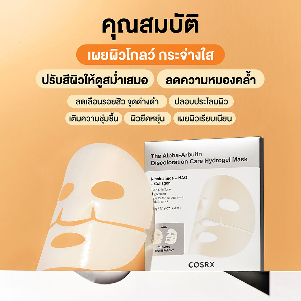 COSRX The Alpha-Arbutin Discoloration Care Hydrogel Mask 1 Sheet แผ่นมาสก์ไฮโดรเจล ผสานอัลฟ่า-อาร์บูติน และคอลลาเจนโมเลกุลขนาดเล็ก เนื้อมาสก์จะค่อยๆ เปลี่ยนจากเนื้อขุ่นเป็นเนื้อใส พร้อมส่งสารสำคัญลงสู่ผิว ช่วยลดเลือนจุดด่างดำและรอยสิว เผยผิวที่ดูกระจ่างใส เรียบเนียน และสีผิวสม่ำเสมอยิ่งขึ้น