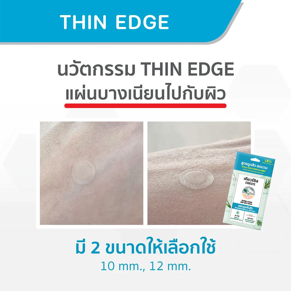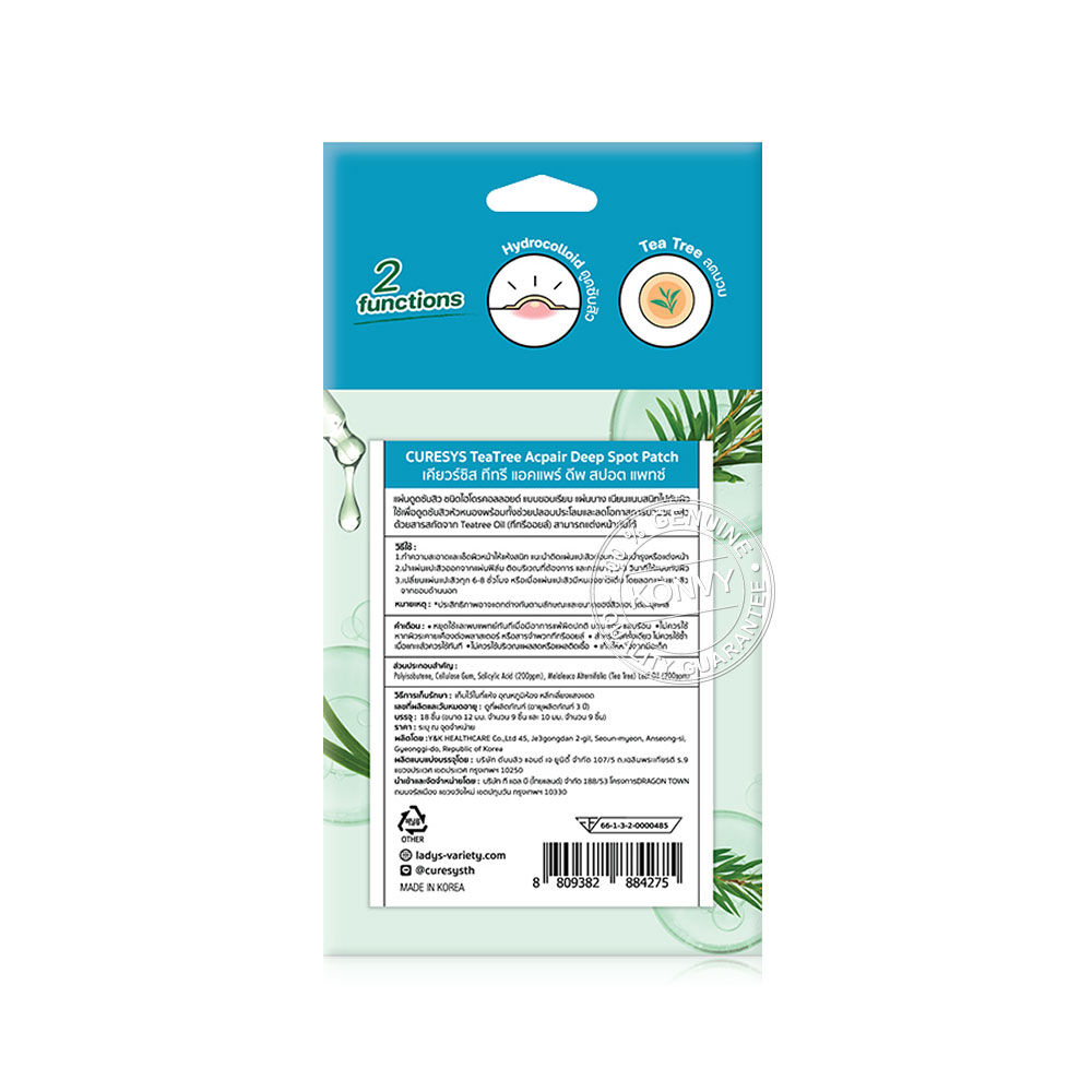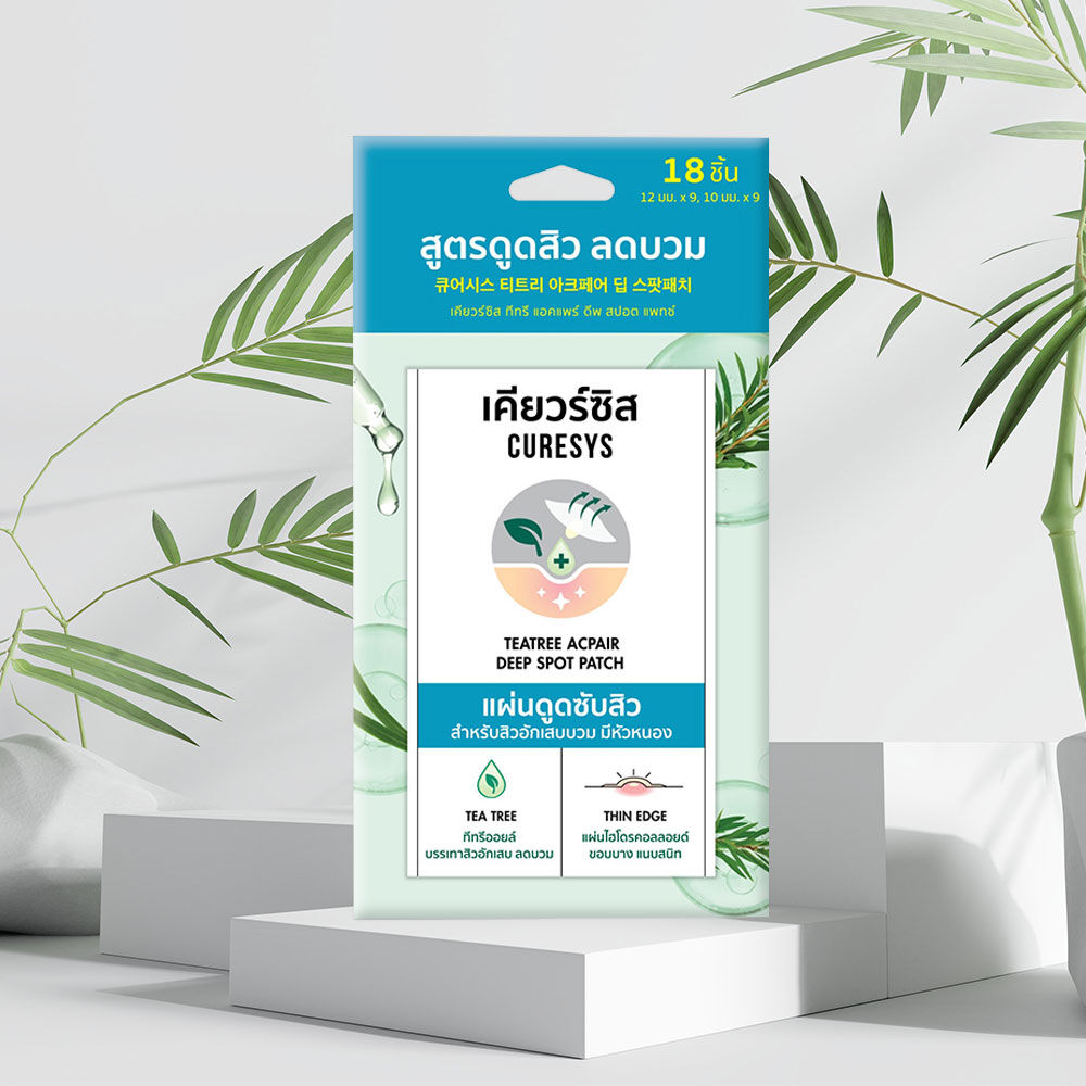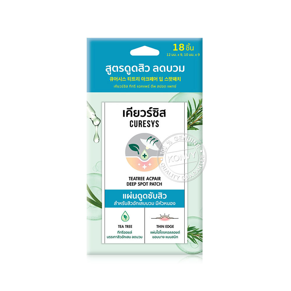 CURESYS TeaTree Acpair Deep Spot Patch 18Dots แผ่นดูดซับสิวไฮโดรคอลลอยด์ พร้อมนวัตกรรม Thin edge รีดขอบบาง เนียนแนบไปกับผิว ผสานสารสกัดทีทรีออยล์ (Tea Tree Oil) ช่วยปลอบประโลม ลดบวม ลดอักเสบ ของสิวอักเสบแดงหัวหนอง ติดแน่น กันน้ำ ปกปิดดี แต่งหน้าทับได้ มี 2 ขนาดให้เลือกใช้ สามารถใช้ได้ทั้งตอนกลางวันและกลางคืน