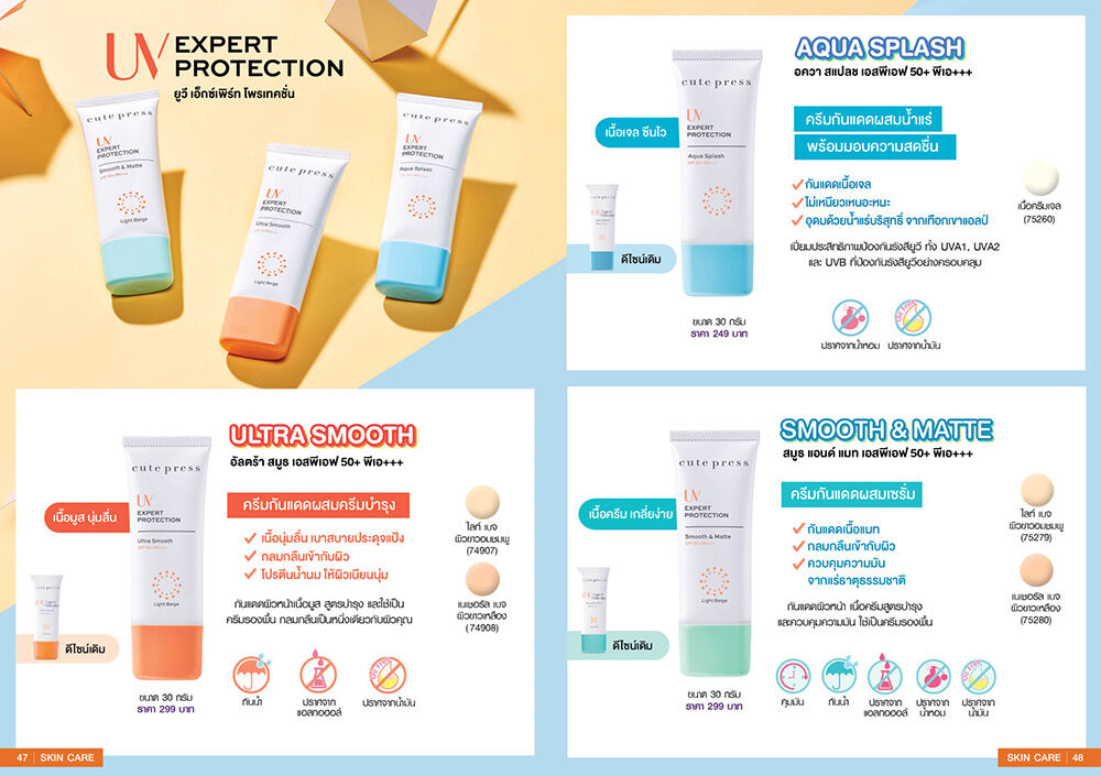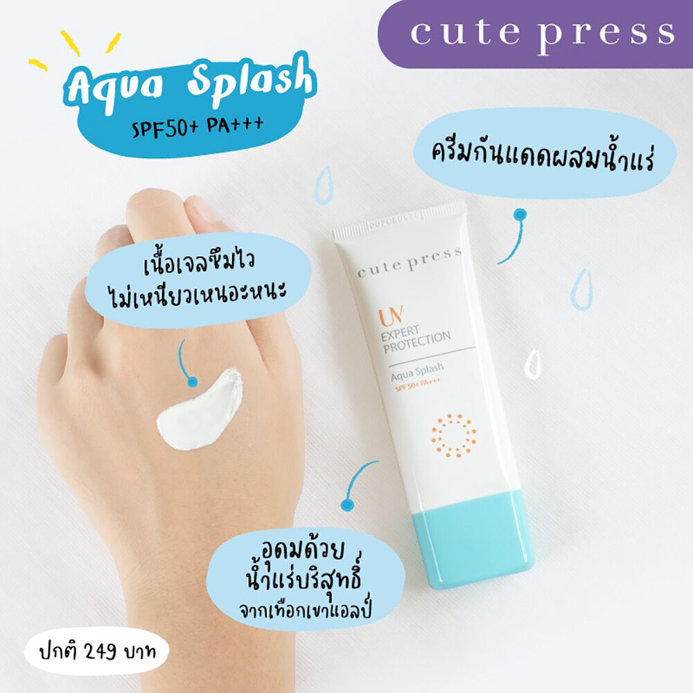 [Free Gift] Cute Press UV Expert Protection Aqua Splash SPF50+/PA+++ 30g ครีมกันแดดเนื้อเจล ให้ความรู้สึกสดชื่นราวละอองน้ำ เบาสบายและซึมซาบเข้าสู่ผิวได้อย่างรวดเร็ว ไม่เหนียวเหนอะหนะ เปี่ยมประสิทธิภาพในการป้องกันรังสียูวีเอและยูวีบี ด้วยค่า SPF50+/PA+++ อุดมด้วยเกลเซียร์ วอเทอร์ น้ำแร่อันแสนบริสุทธิ์จากธารน้ำแข็งในเทือกเขาแอลป์ ประเทศสวิตเซอร์แลนด์ ผสานกับไฮยาลูรอน และน้ำว่านหางจระเข้ ที่ช่วยเติมความสดชื่นและเพิ่มความชุ่มชื้นให้กับผิว พร้อมวิตามินอี และวิตามินบี 5 ช่วยฟื้นบำรุงผิวให้เรียบเนียน สุขภาพดี แลดูอ่อนเยาว์